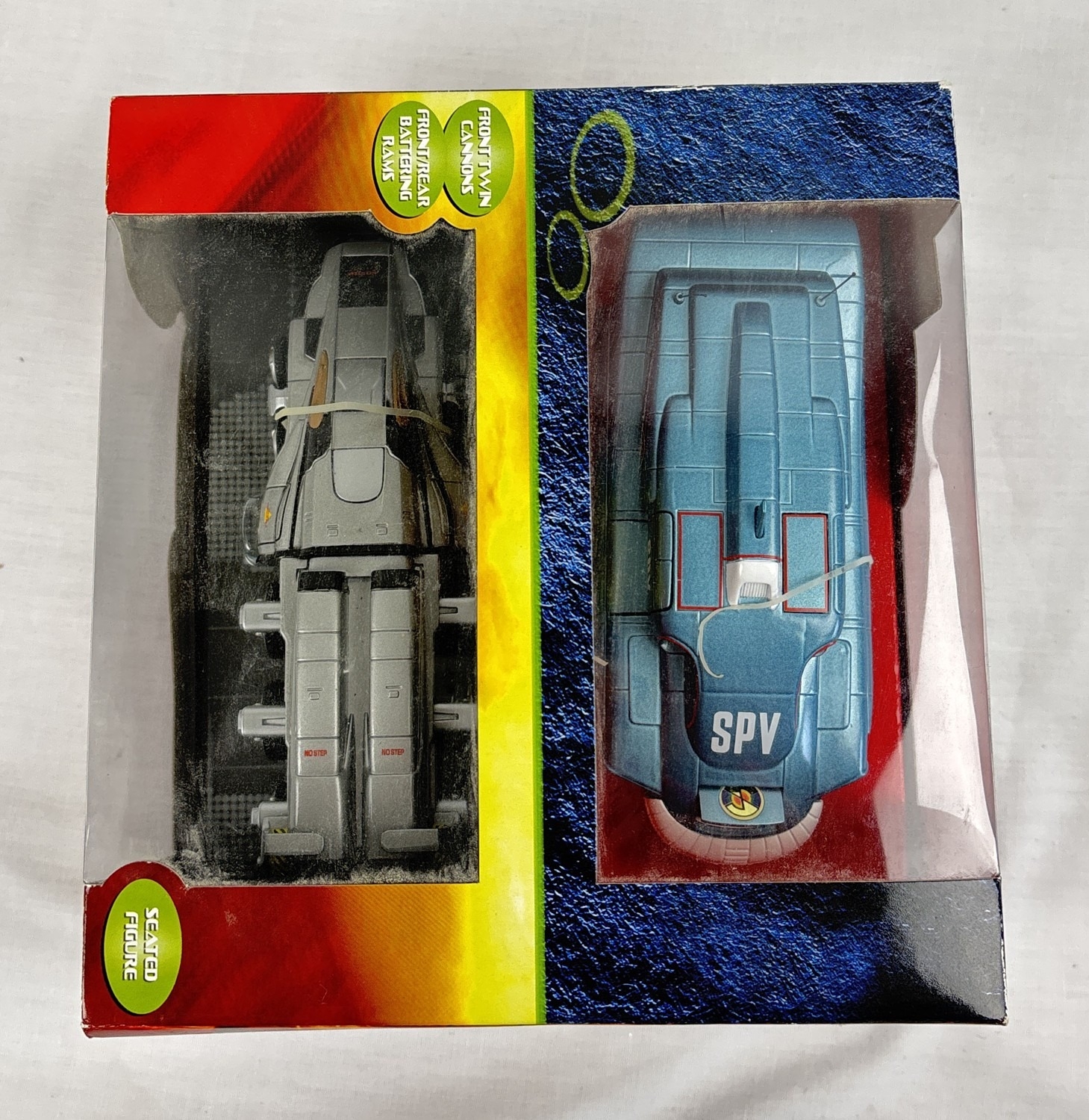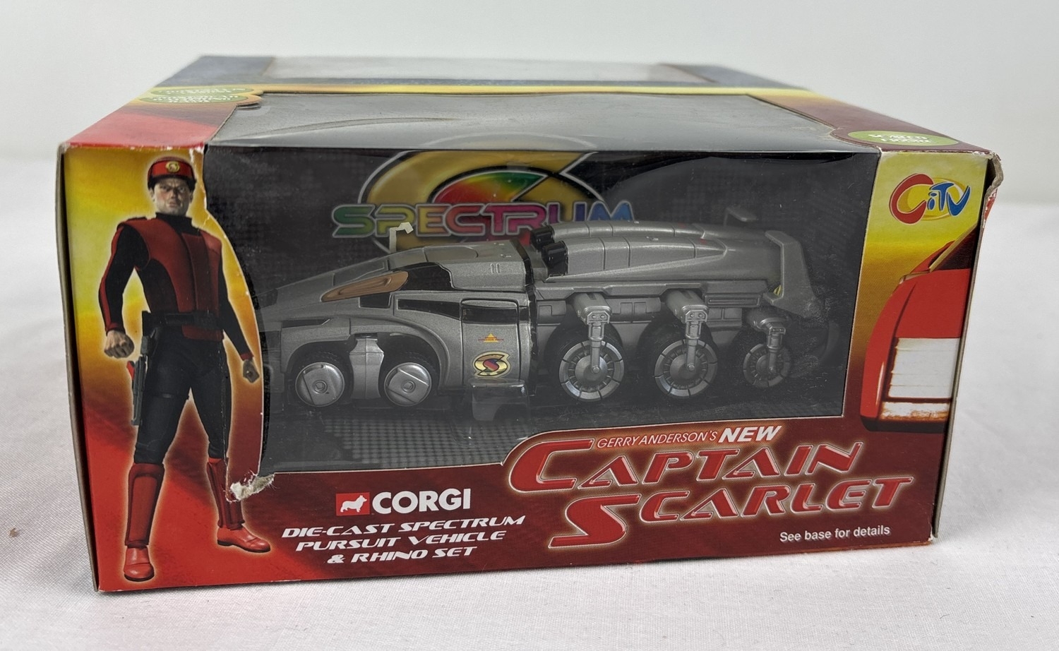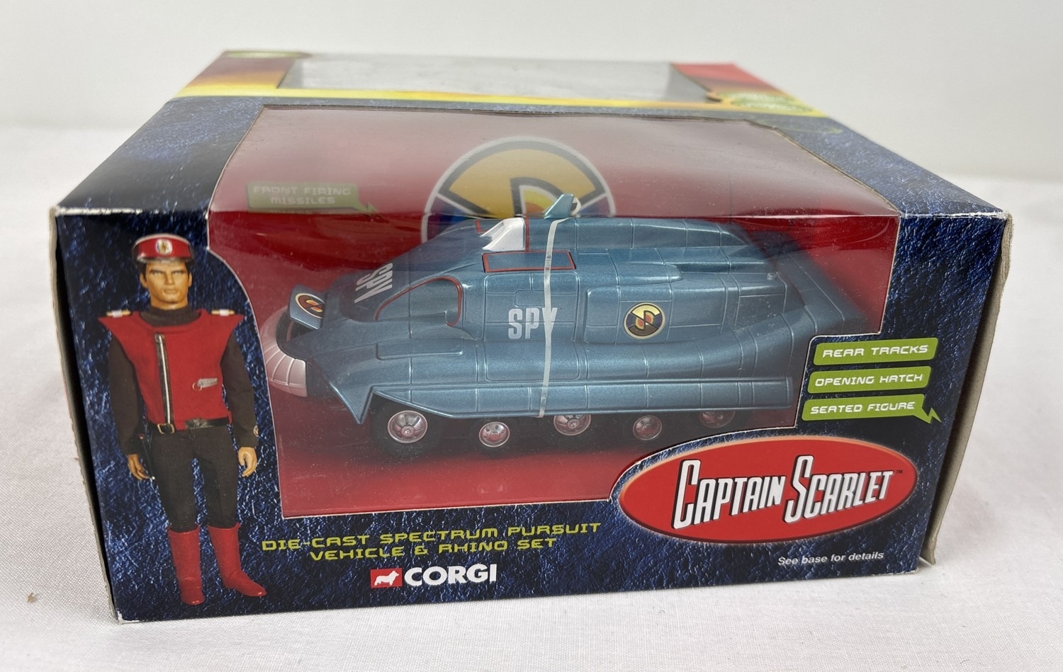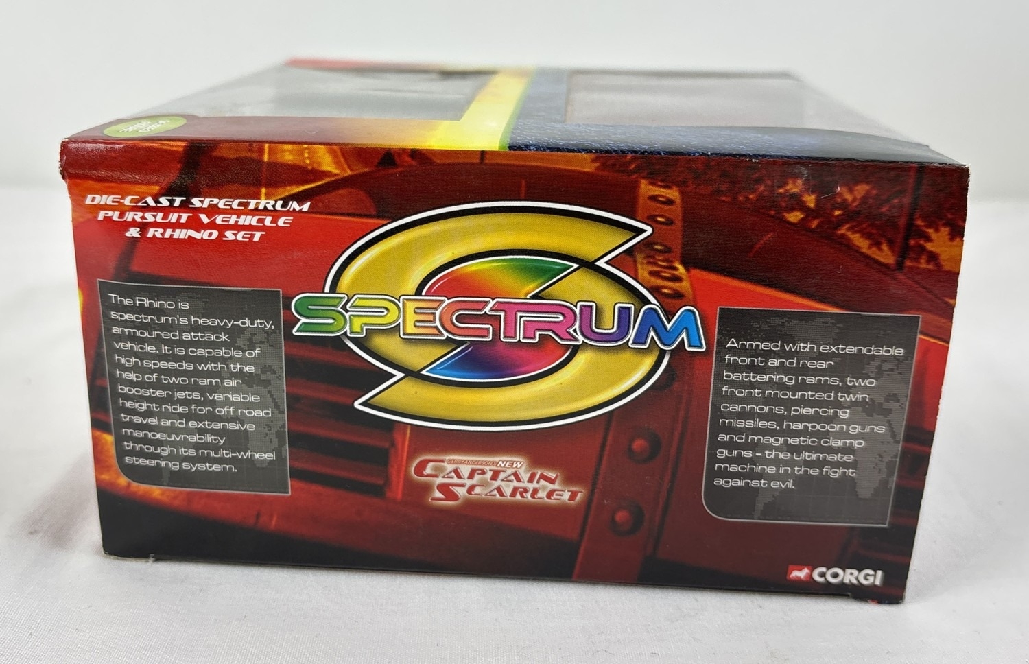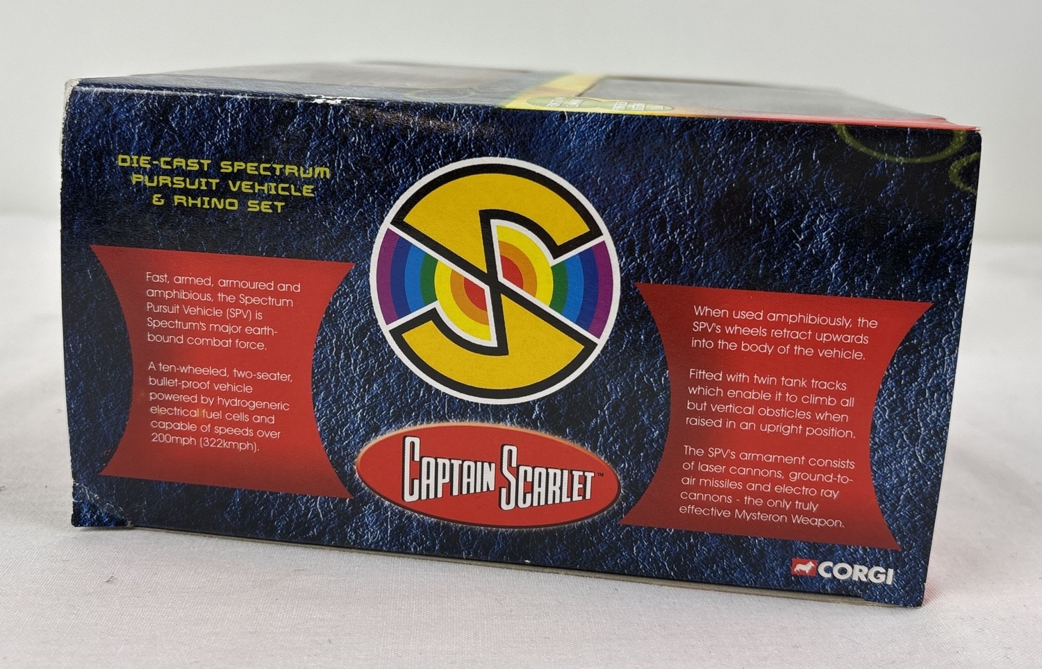 Corgi twin vehicle box set from Gerry Anderson's Captain Scarlet #CC96399. Containing diecast models of the Spectrum Pursuit Vehicle and Rhino armoured attack vehicle.