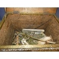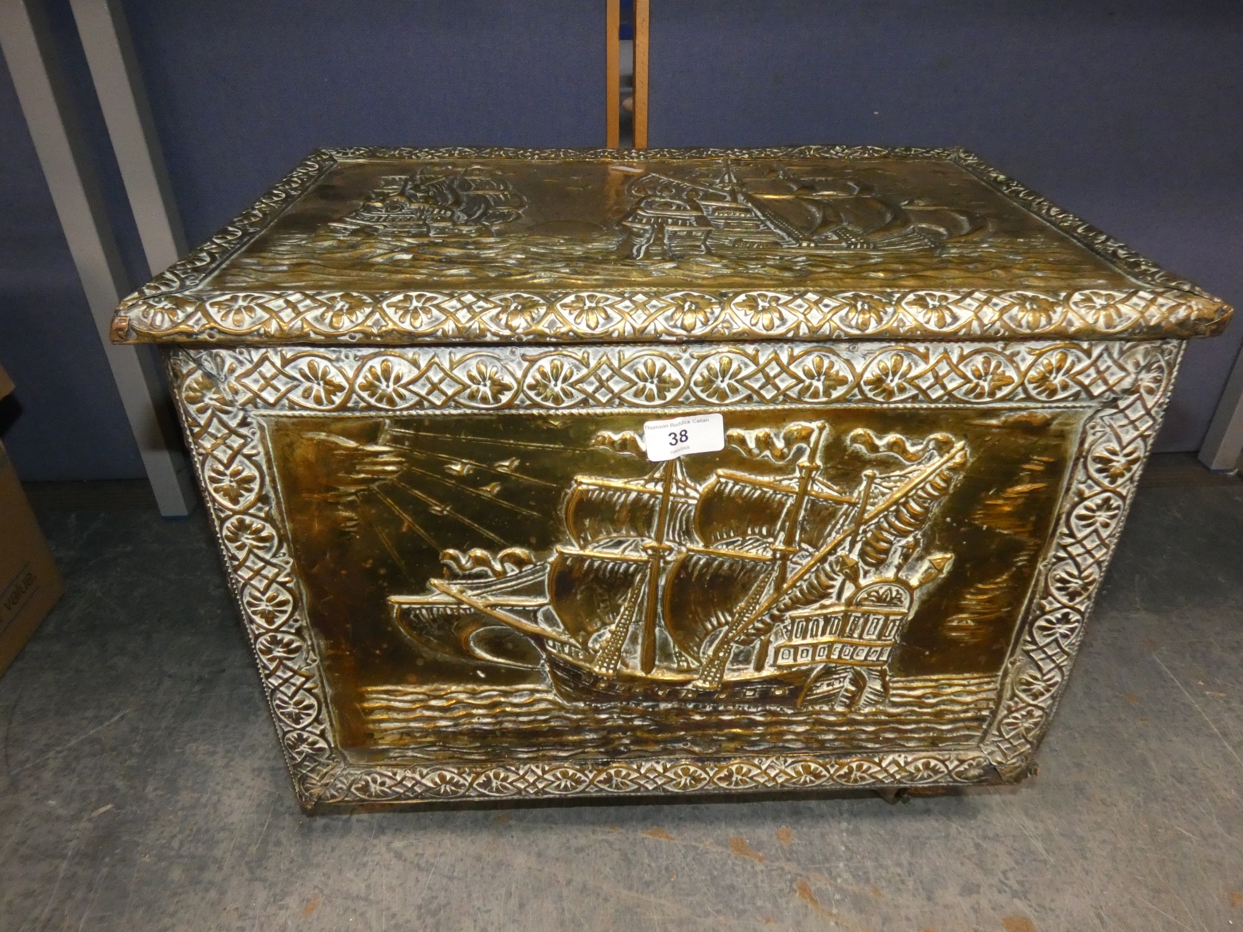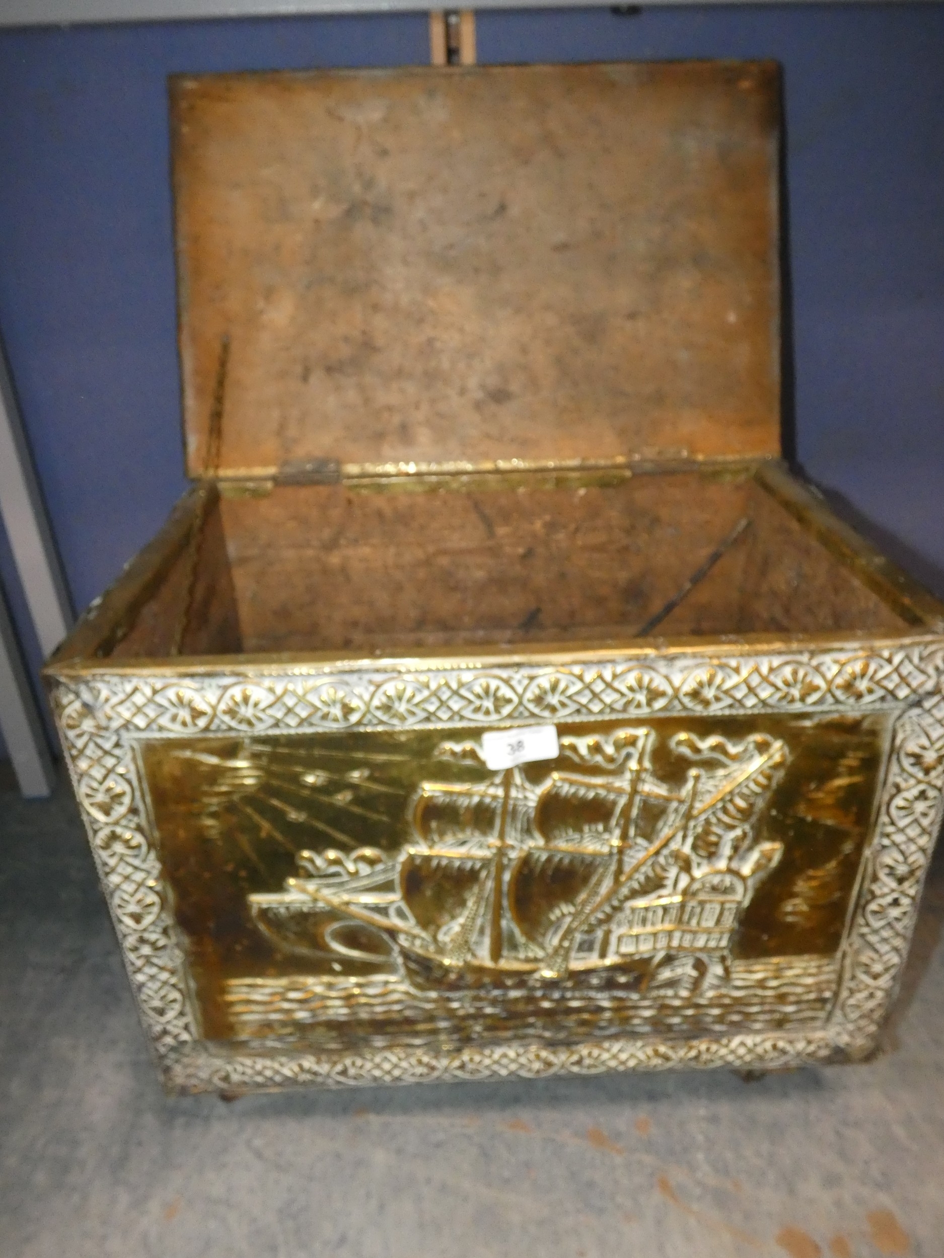 Brass coal box on castors.