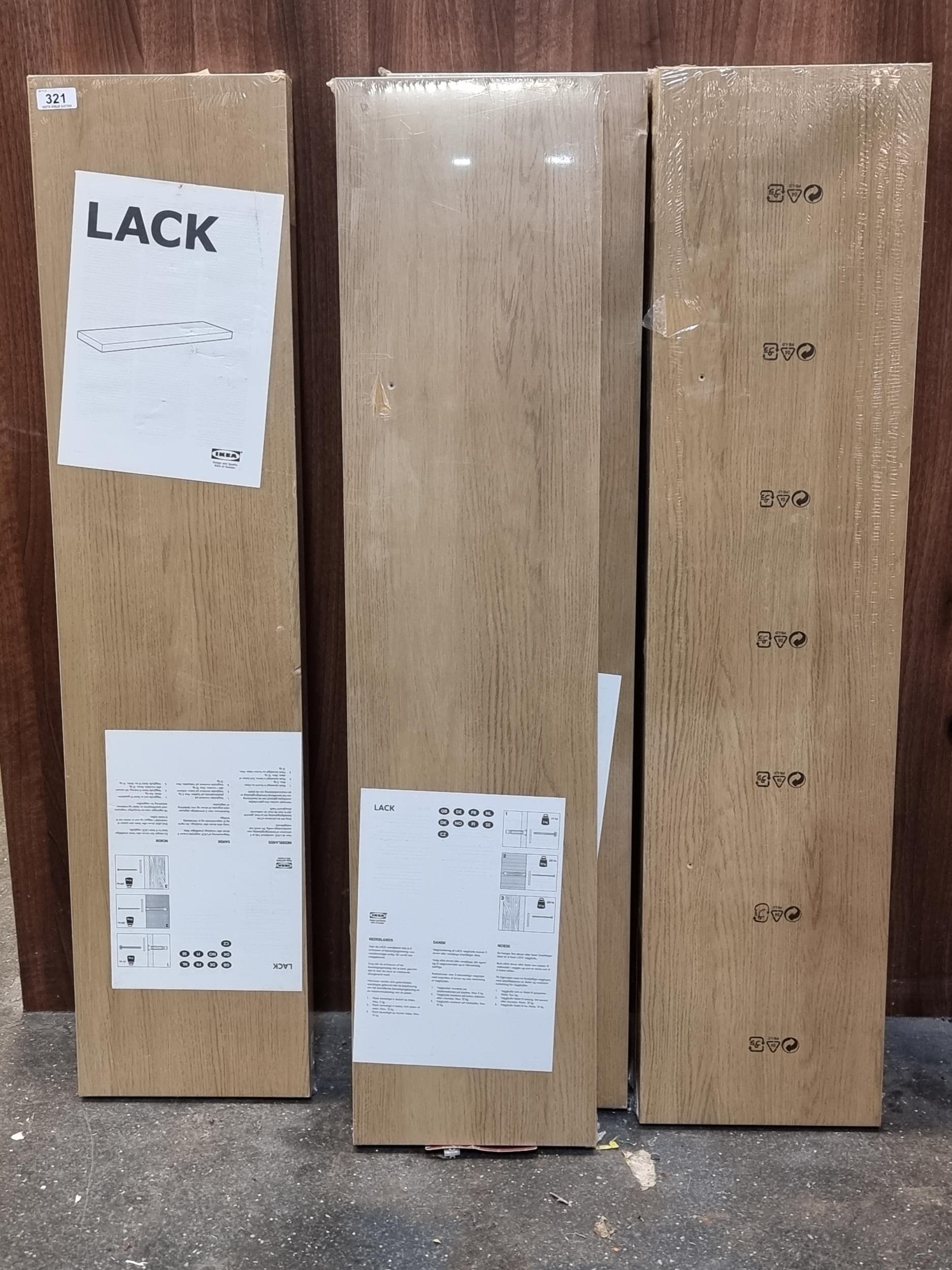 Five floating wall shelves in the LACK style by Ikea. In an oak finish. Unopened in original packaging. 110cm x 26cm.