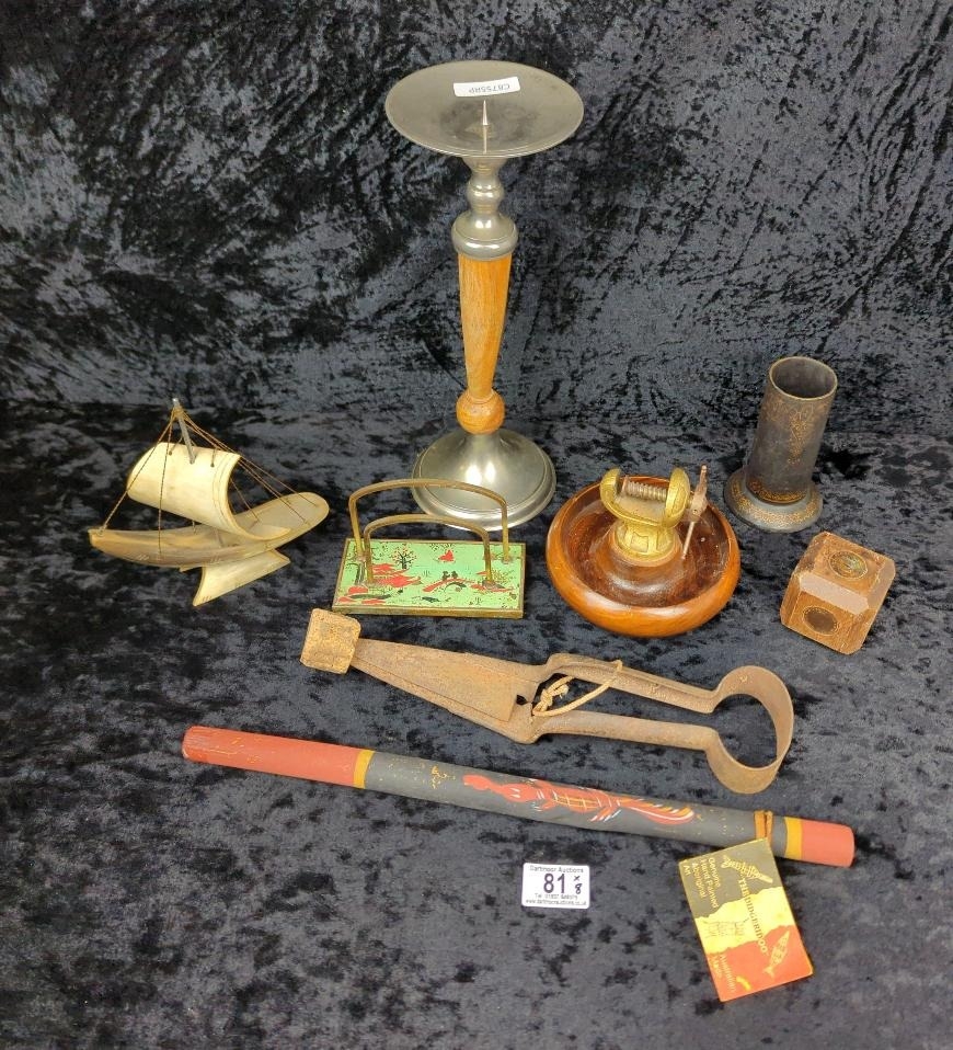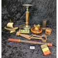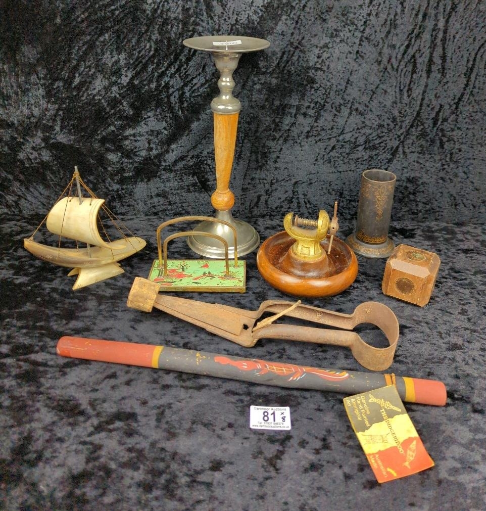 Platypus lot of items including a chinoiserie letter rack, didgeridoo, quirky nutcracker and candlestick.