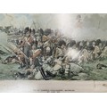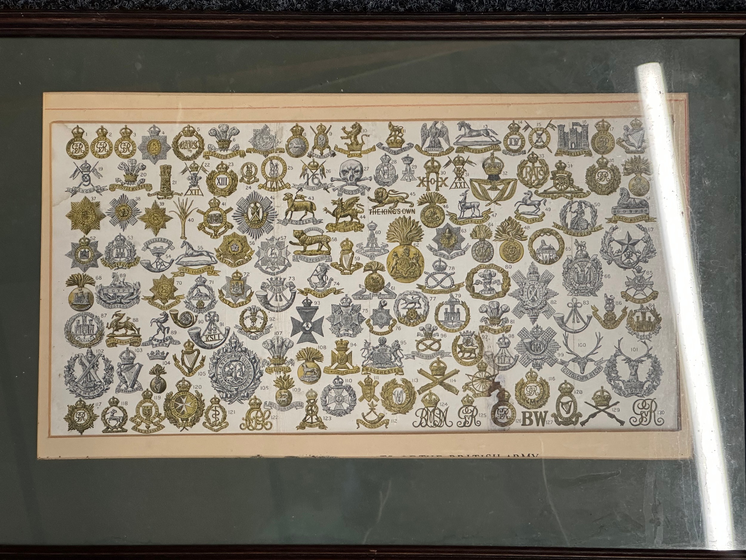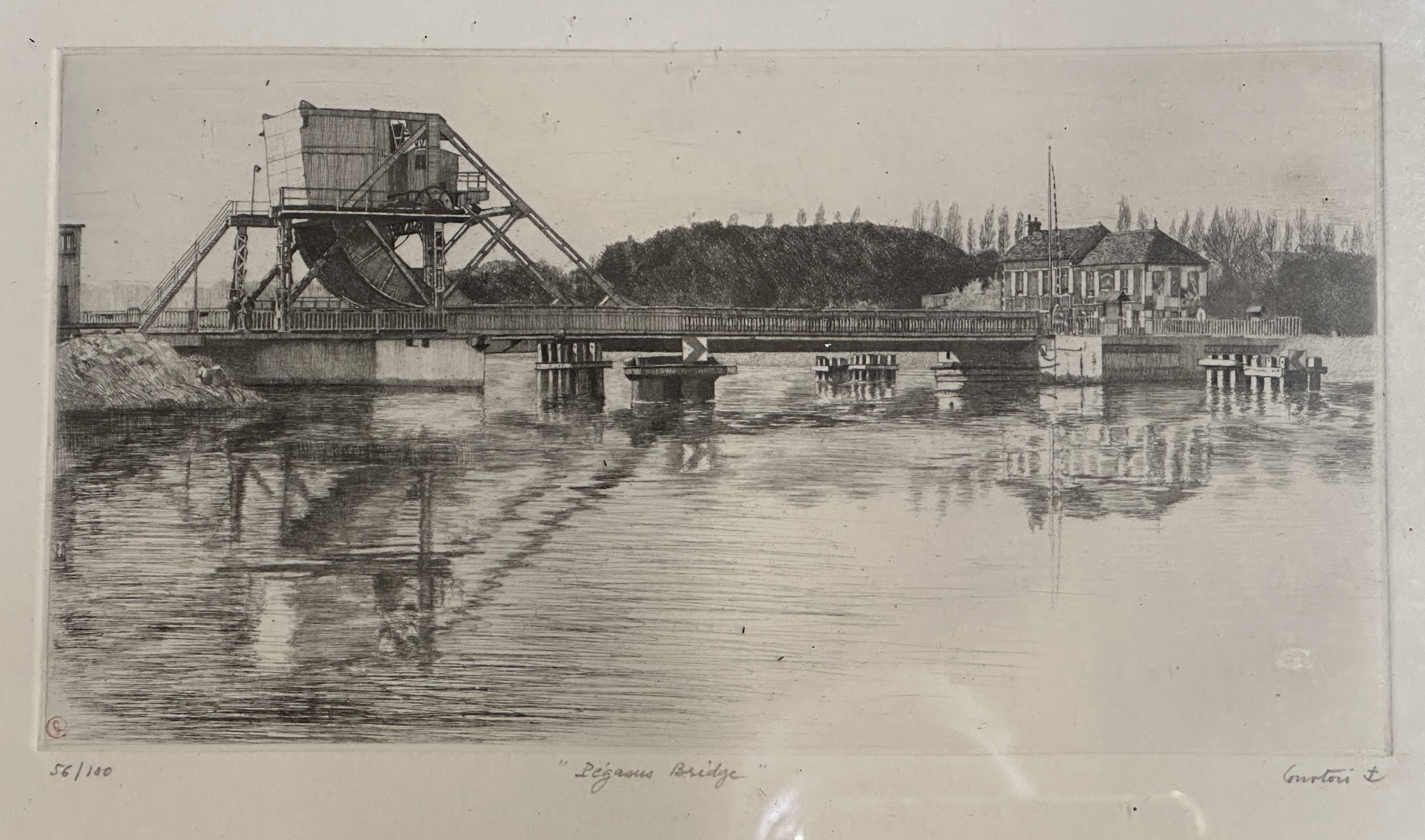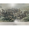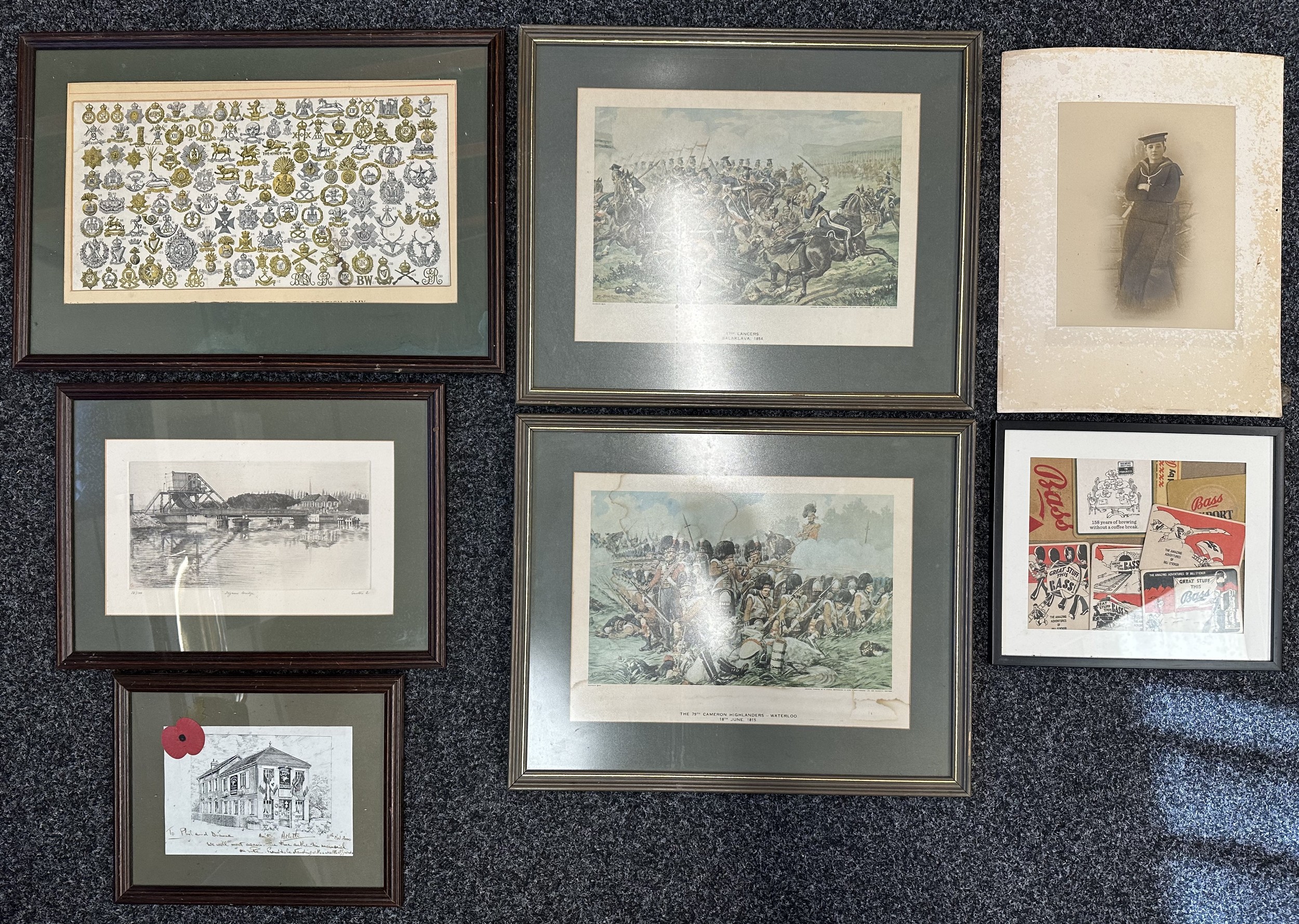 Framed Military Prints of Waterloo, Balaklava, Cap badges, Limited edition print of Pegasus Bridge 56/100, to include a signed picture of Pegasus Bridge Cafe by Arlette Gondree and a WW1 Photo of a Royal Navy Boy Sailor, framed Beer mats. (7)