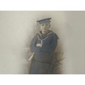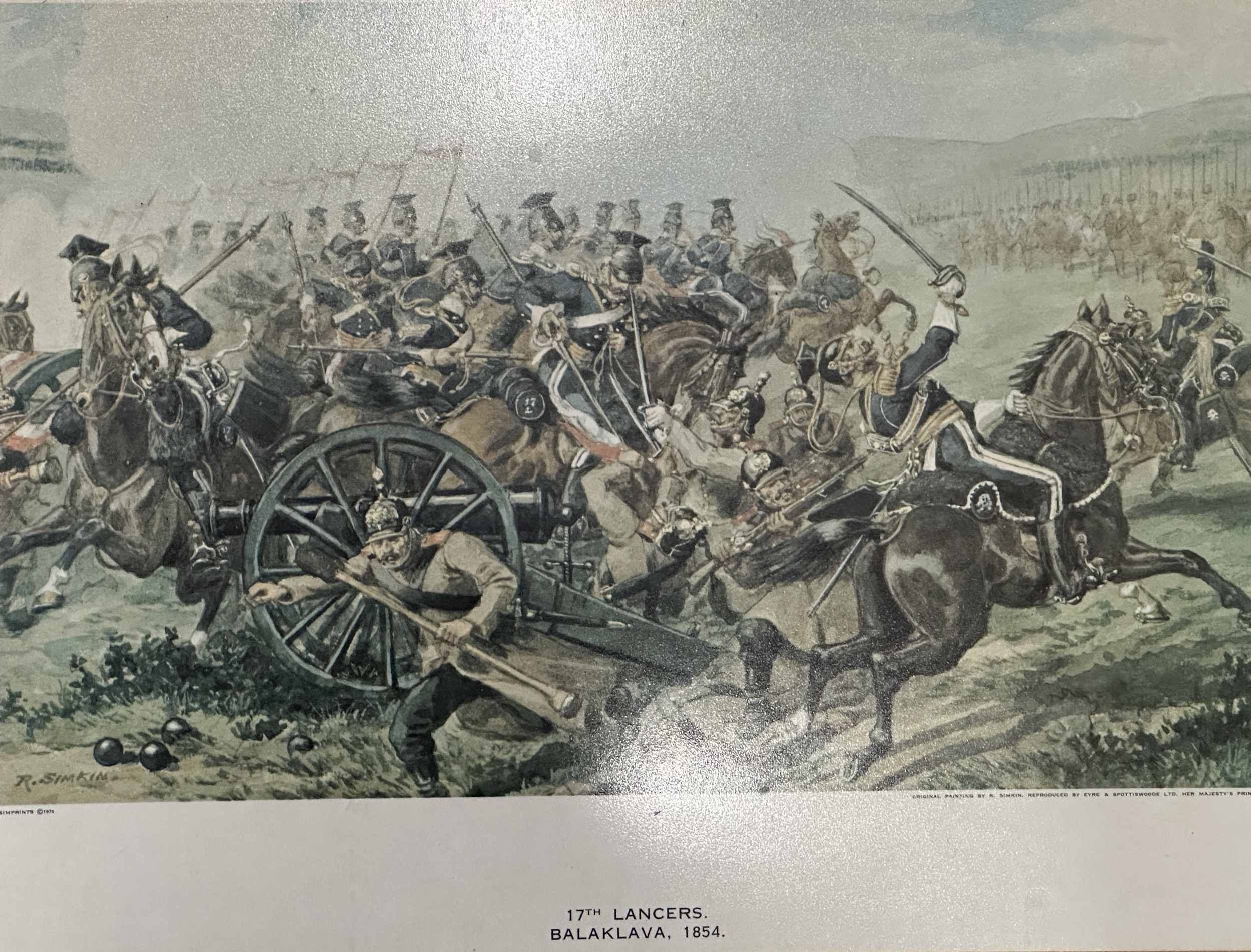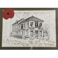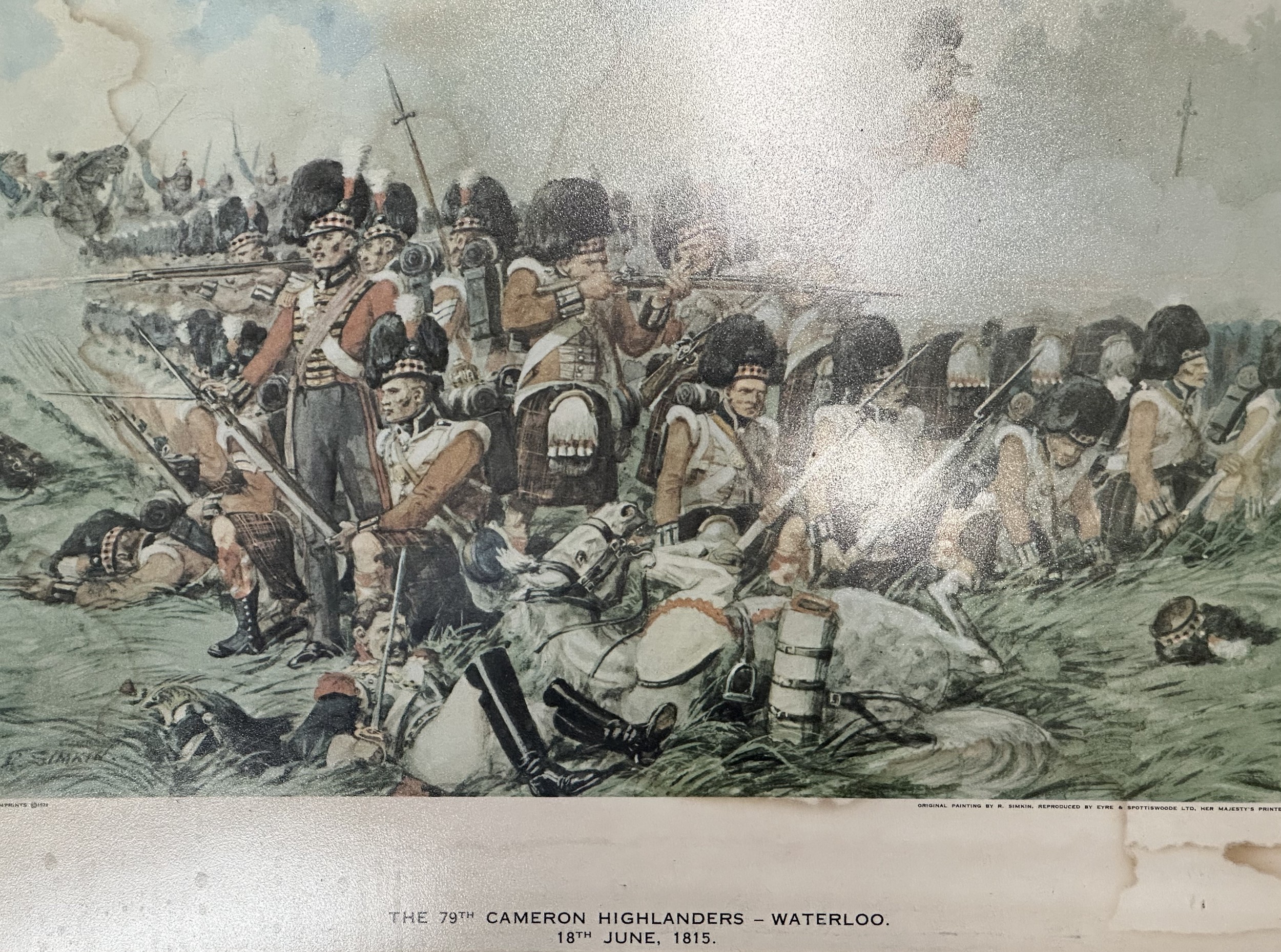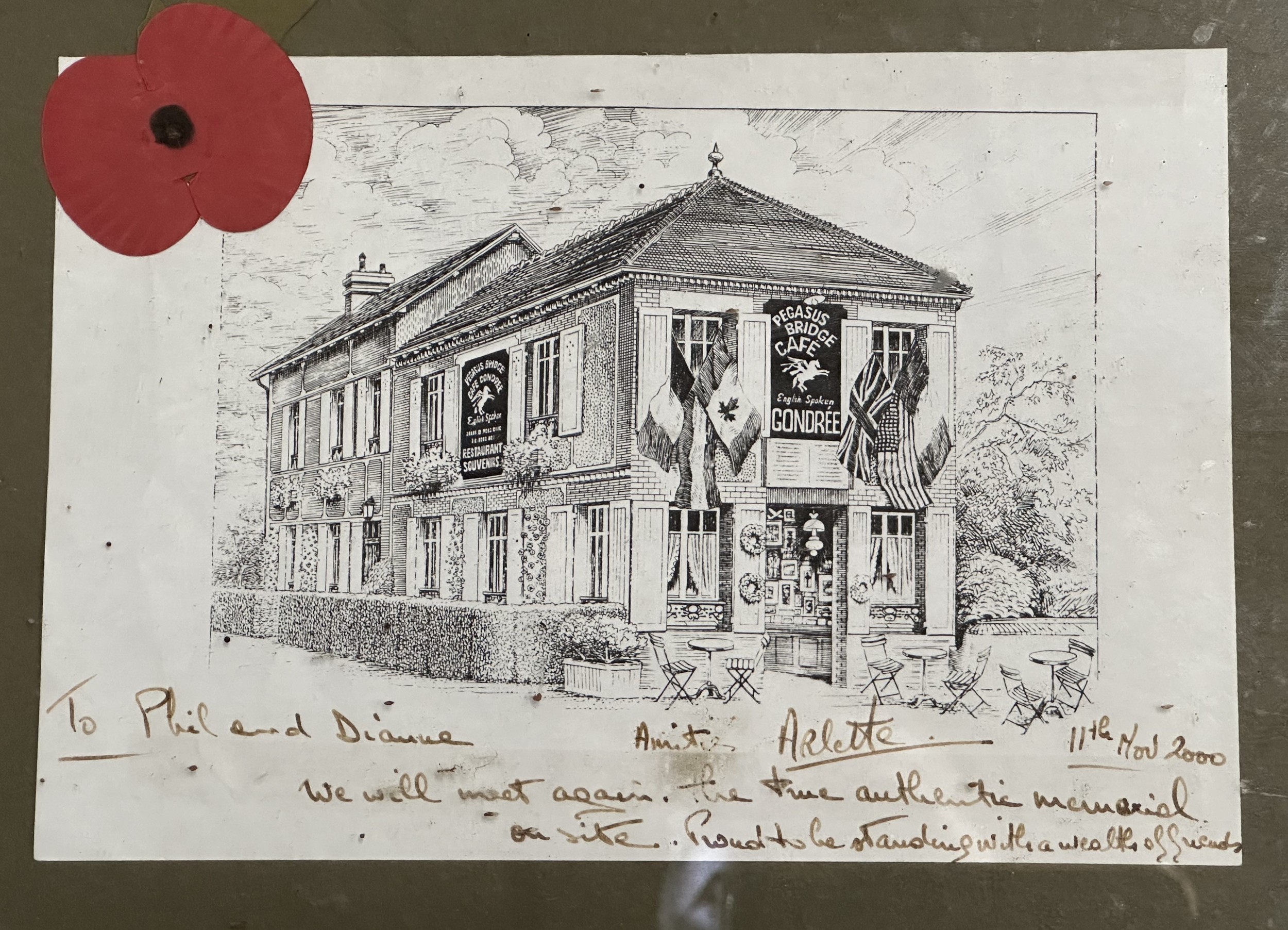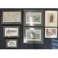 Framed Military Prints of Waterloo, Balaklava, Cap badges, Limited edition print of Pegasus Bridge 56/100, to include a signed picture of Pegasus Bridge Cafe by Arlette Gondree and a WW1 Photo of a Royal Navy Boy Sailor, framed Beer mats. (7)