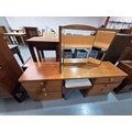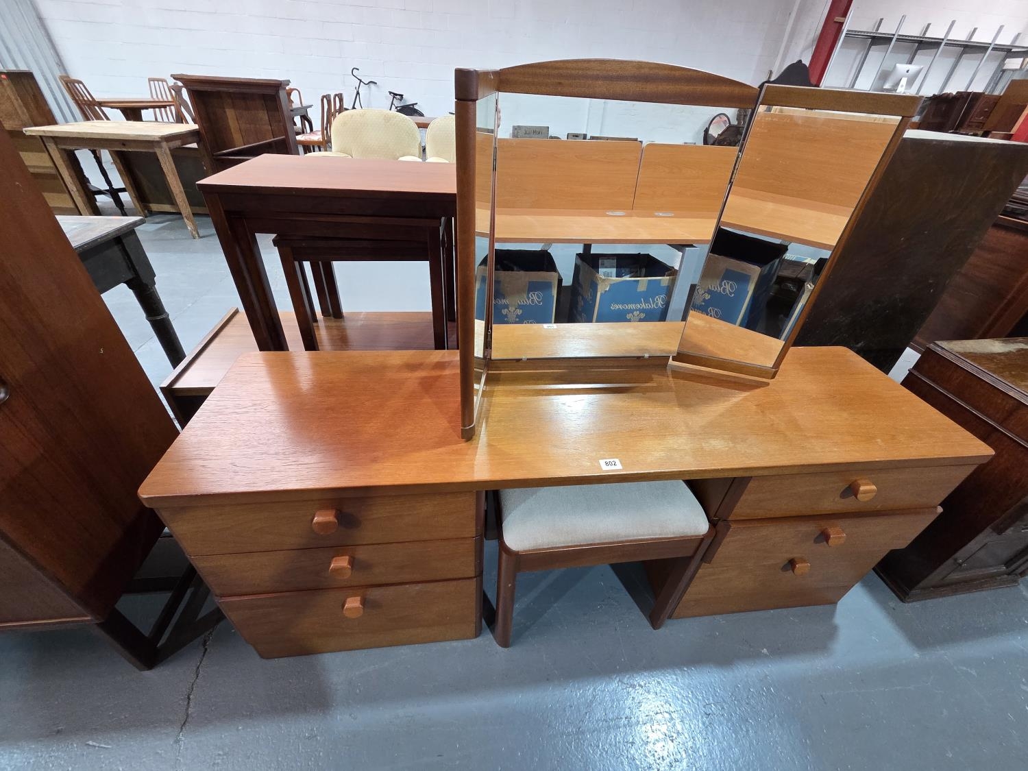 A teak Stag triple mirror dressing table with stoolH132cm W164cm D46cm