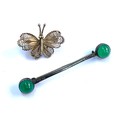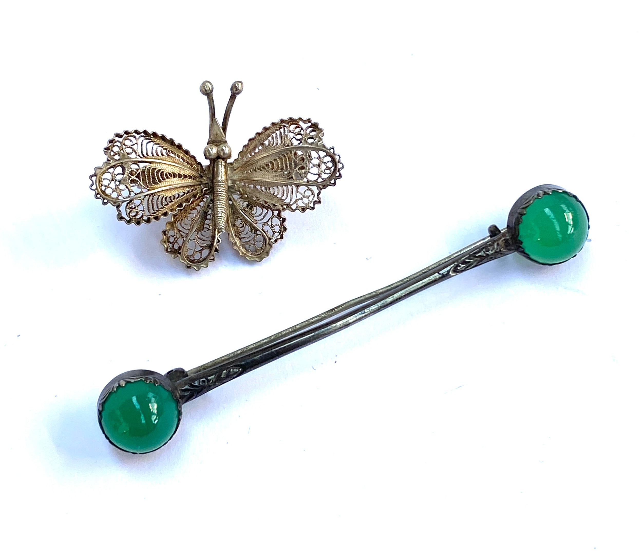 An Arts and Crafts silver and chrysoprase cabochon bar brooch, cmL; together with an 800 silver filigree butterfly brooch, 3.3cmW; 9g gross weight