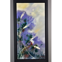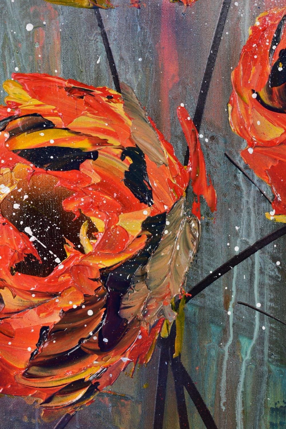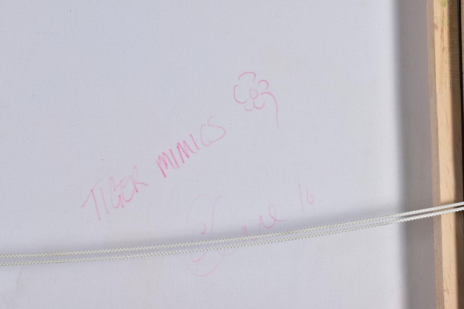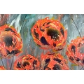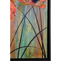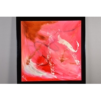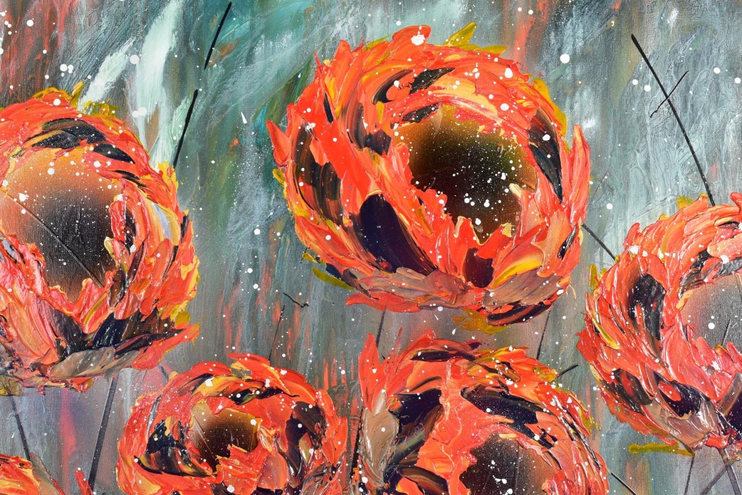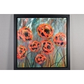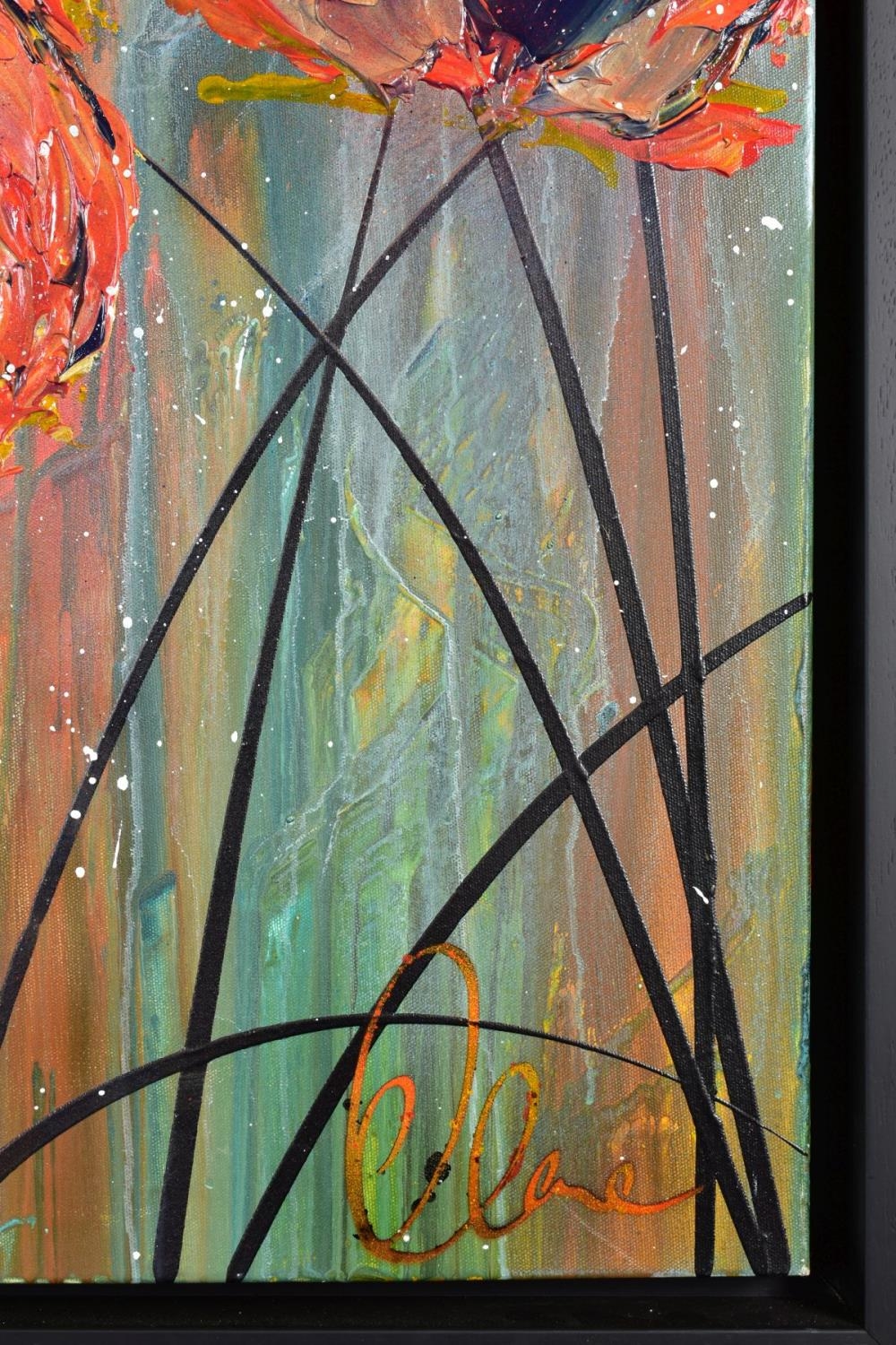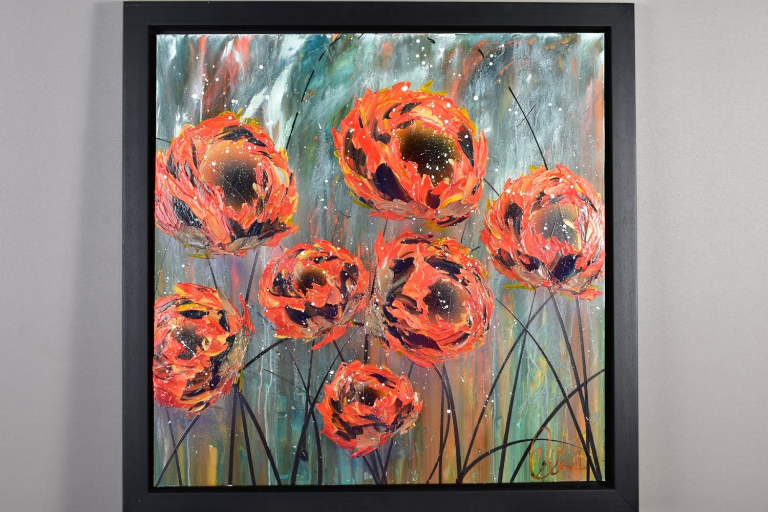 CLARE SYKES (BRITISH 1972) 'TIGER MIMICS' stylised wild flower blossoms, signed bottom right, signed and titled verso, acrylic on canvas, framed, approximate size 102cm x 101cm (condition:- small amount of frame damage) (A)