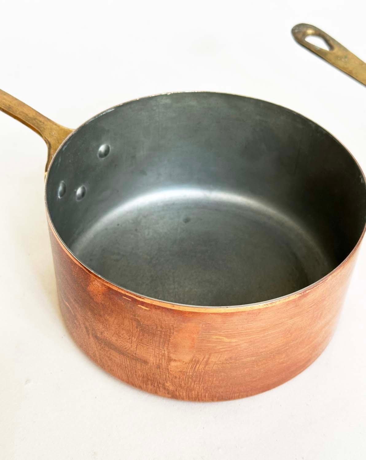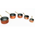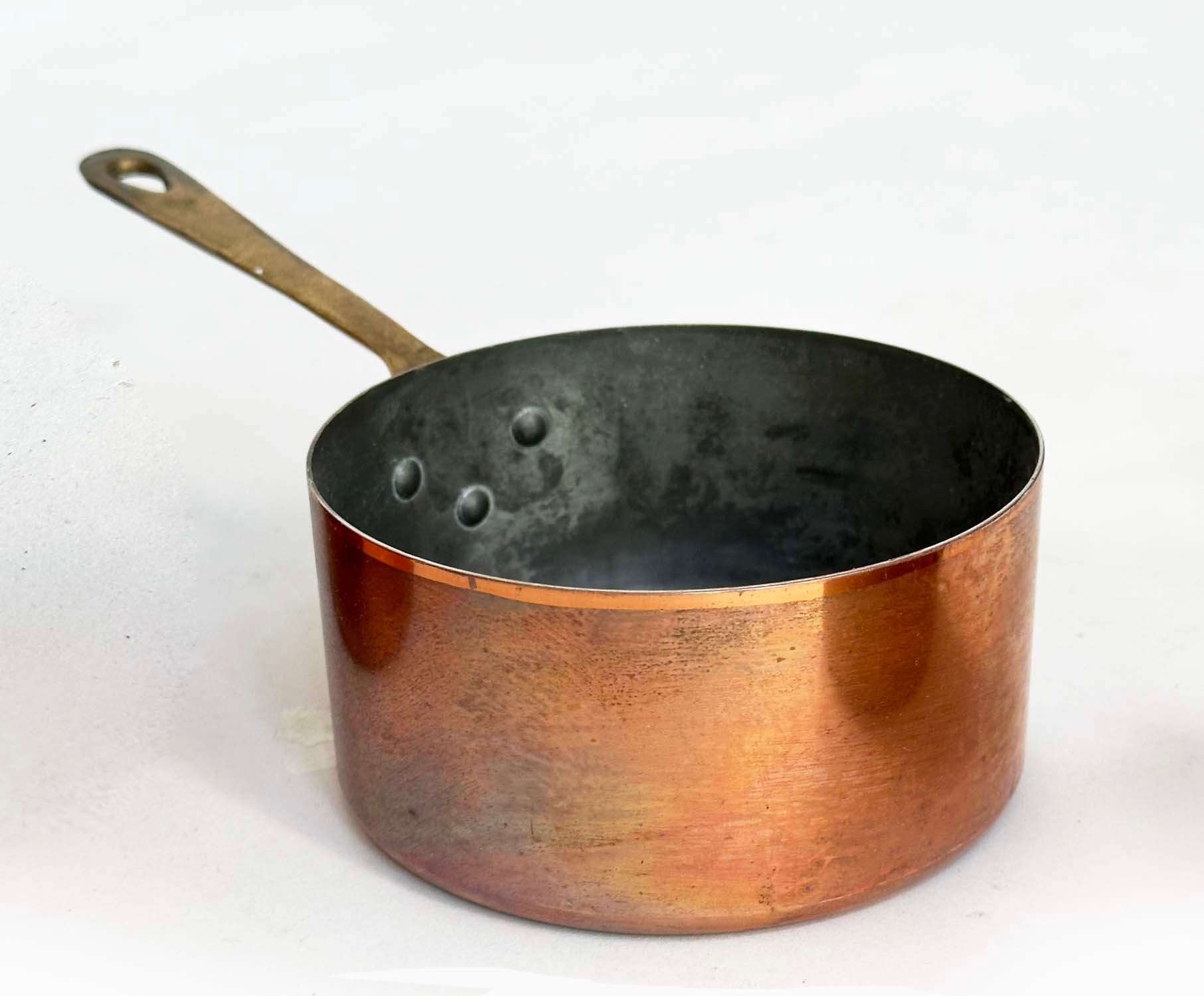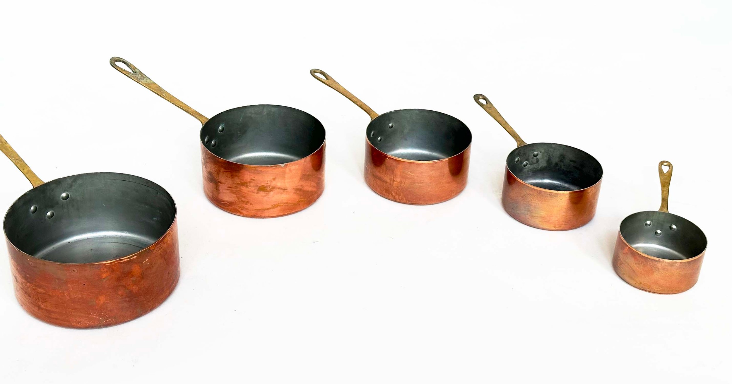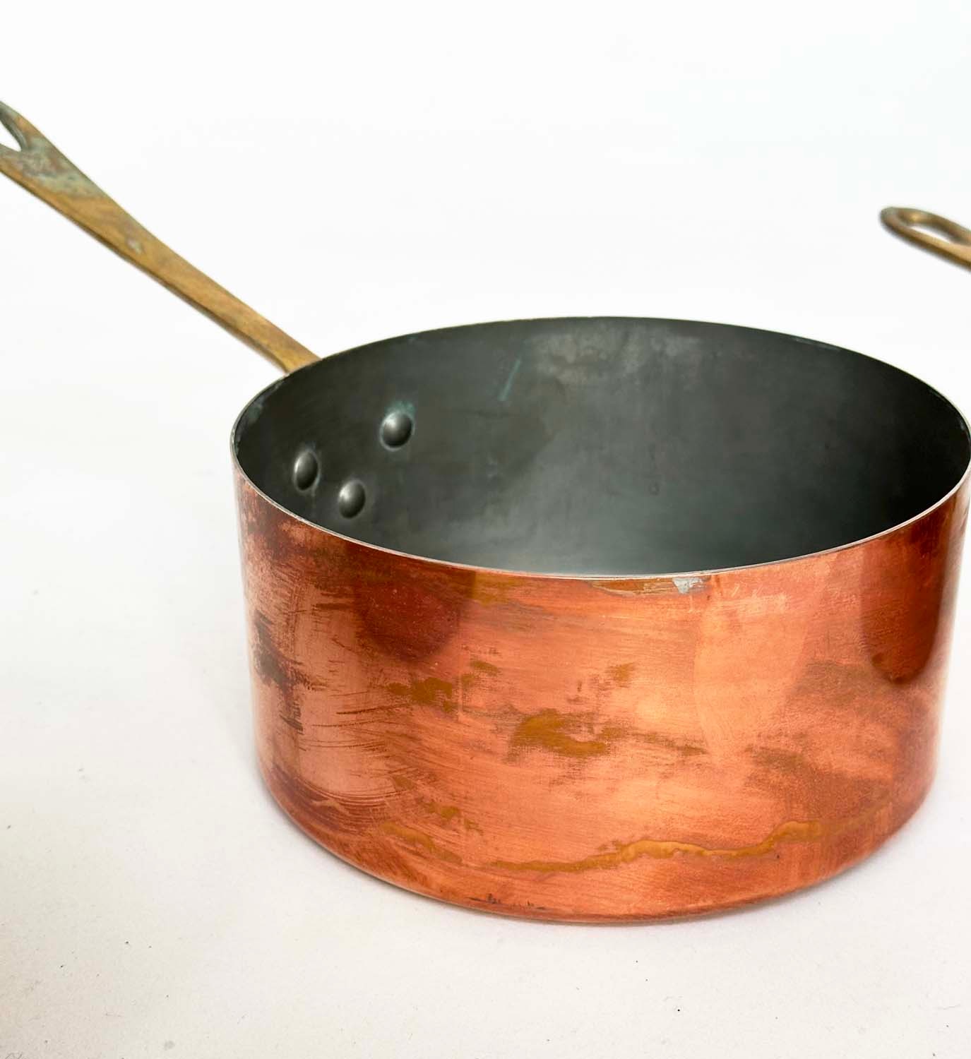 COPPER PANS, a graduated set of five copper and brass, largest 18cm W. (5)