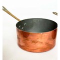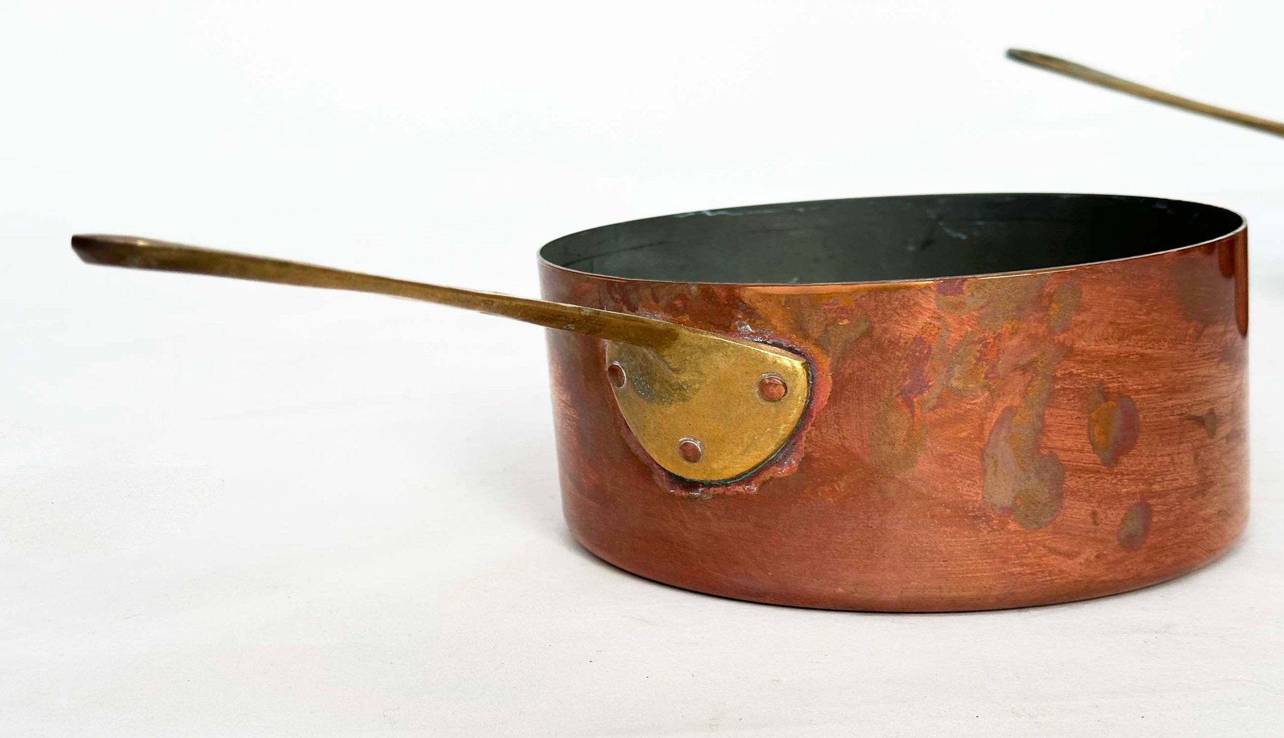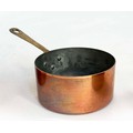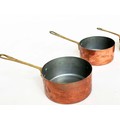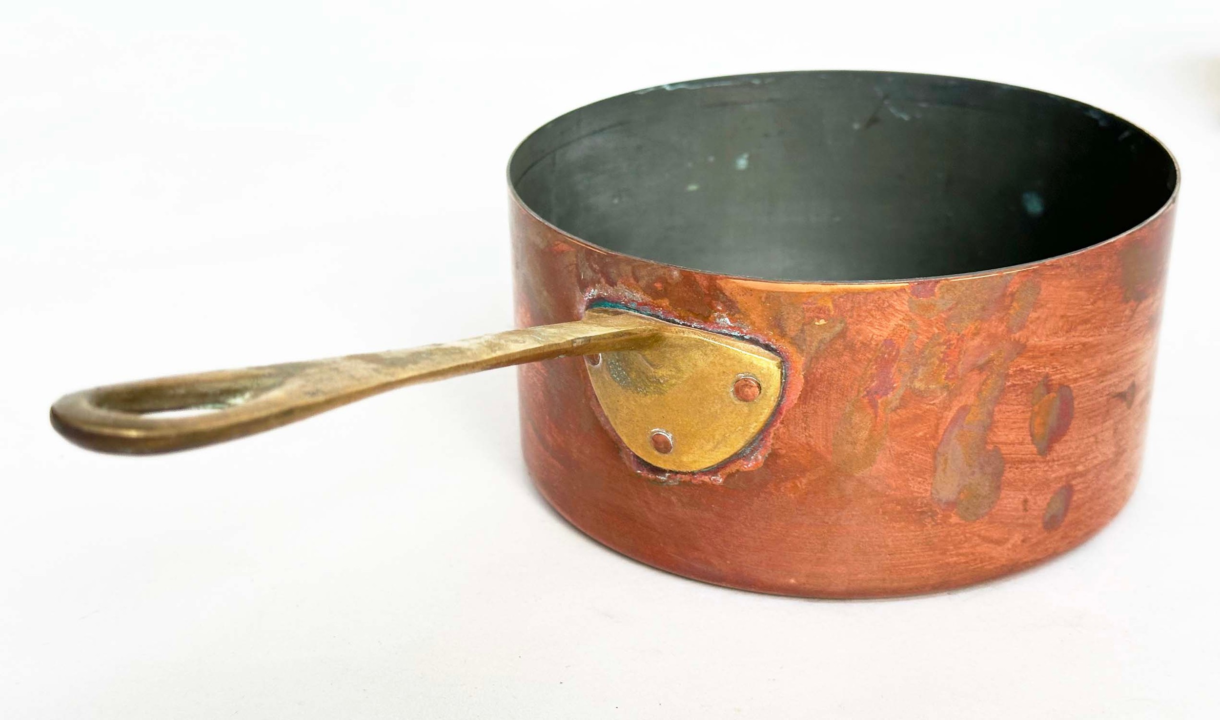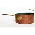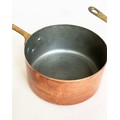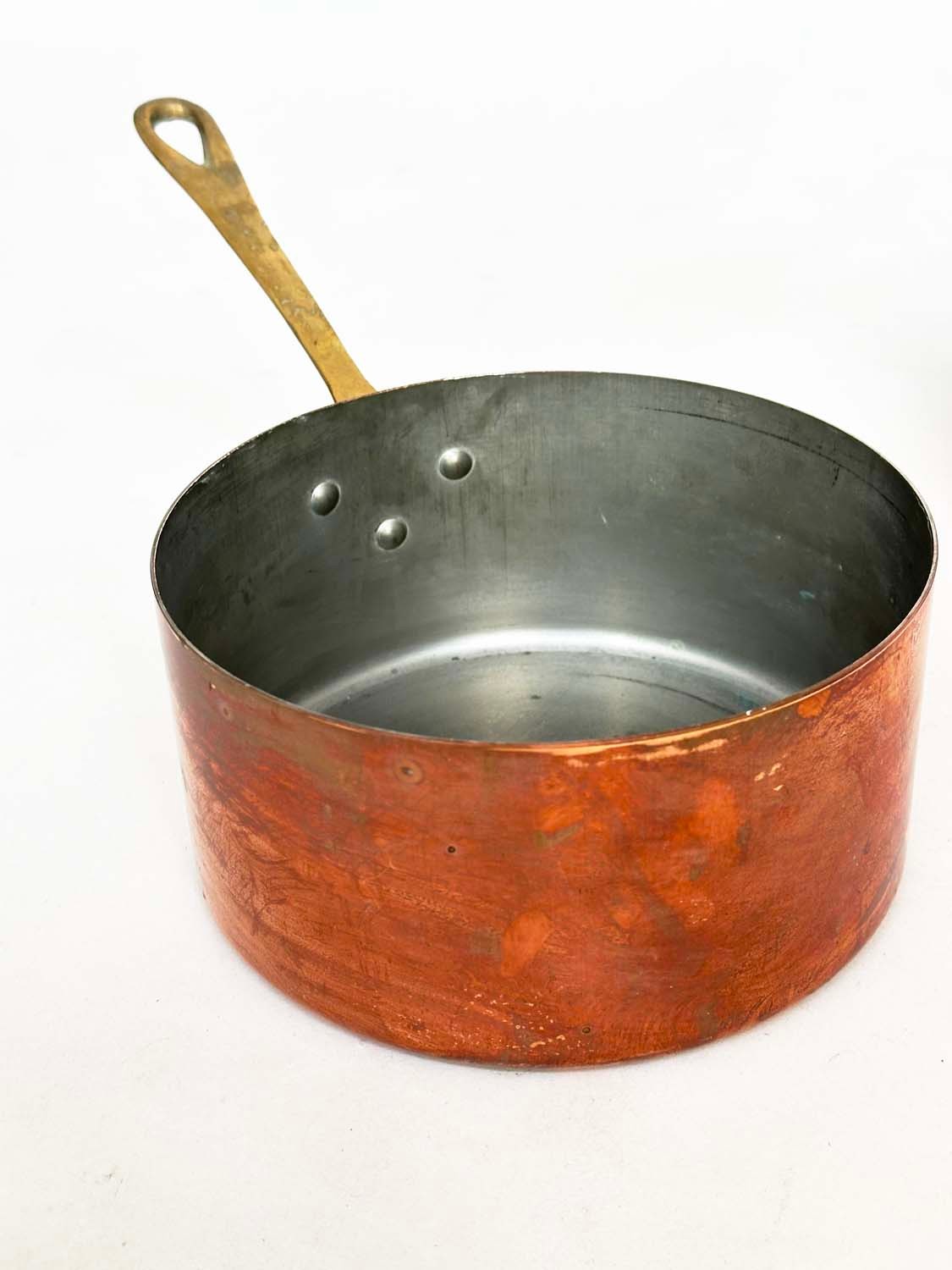 COPPER PANS, a graduated set of five copper and brass, largest 18cm W. (5)