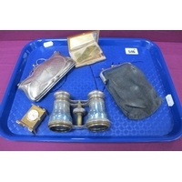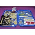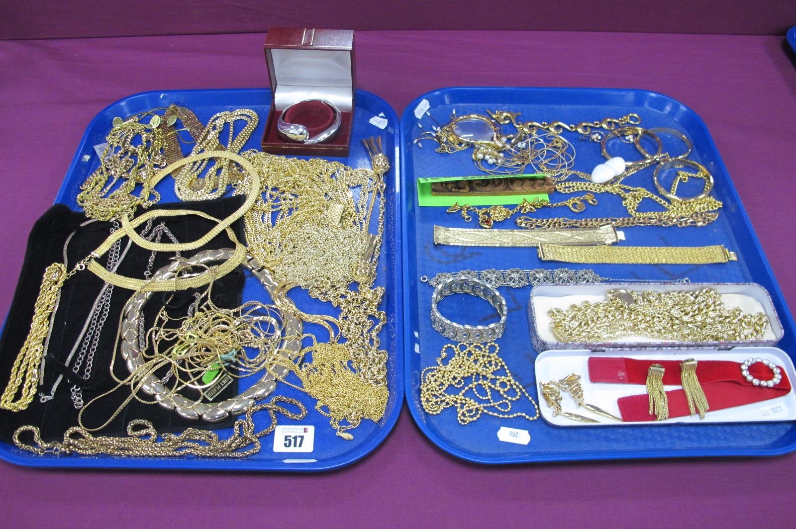 Assorted Gilt Metal Costume Jewellery, including chains, bracelets, bangles, necklaces, magnifying glass, charm style bracelet, etc :- Two Trays