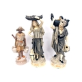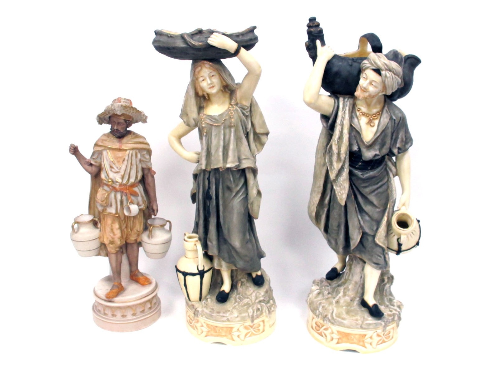 A Royal Dux Style Pottery Figure of an Arab Gentleman, carrying two urns, in traditional costume, circular base, unmarked, 40cm high; A Pair of Continental Figures of a Lady and Gentleman, each carrying baskets on their shoulders and urns, rocky circular bases, unmarked, 50.5cm high. (3)