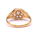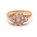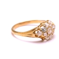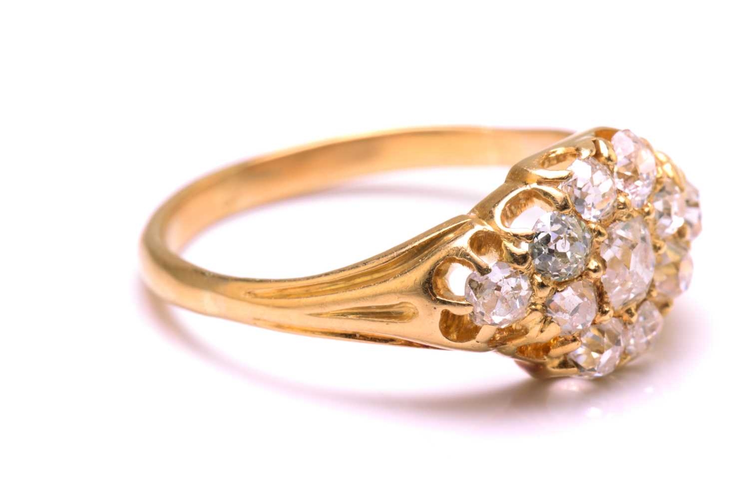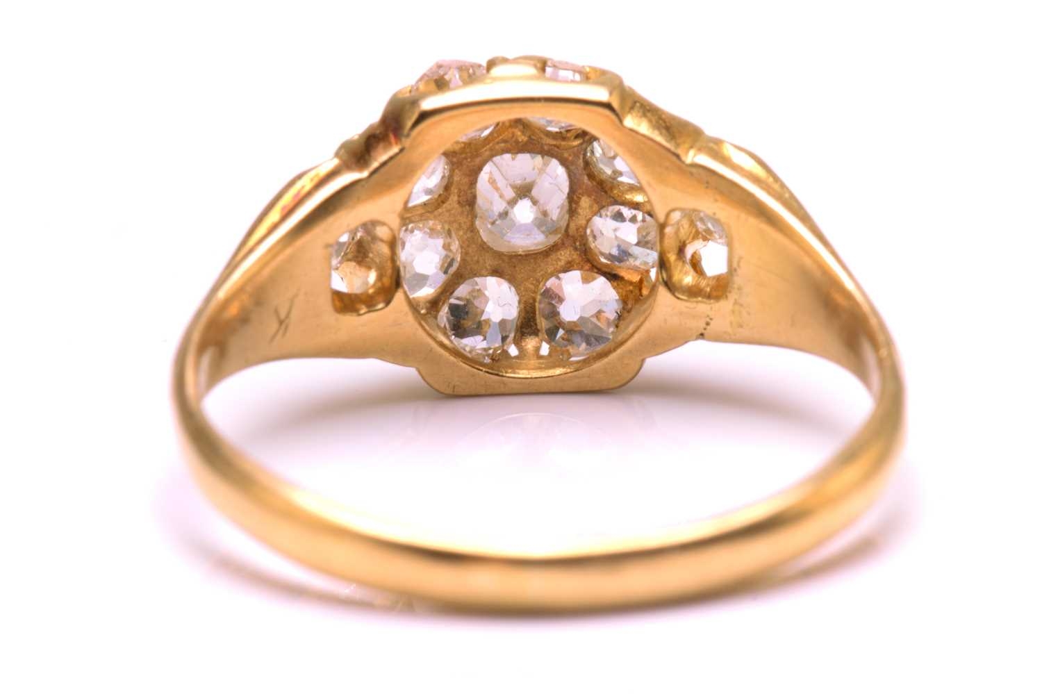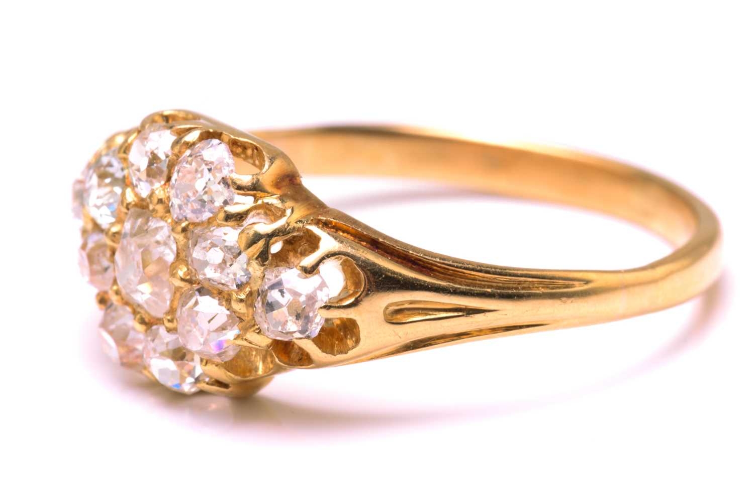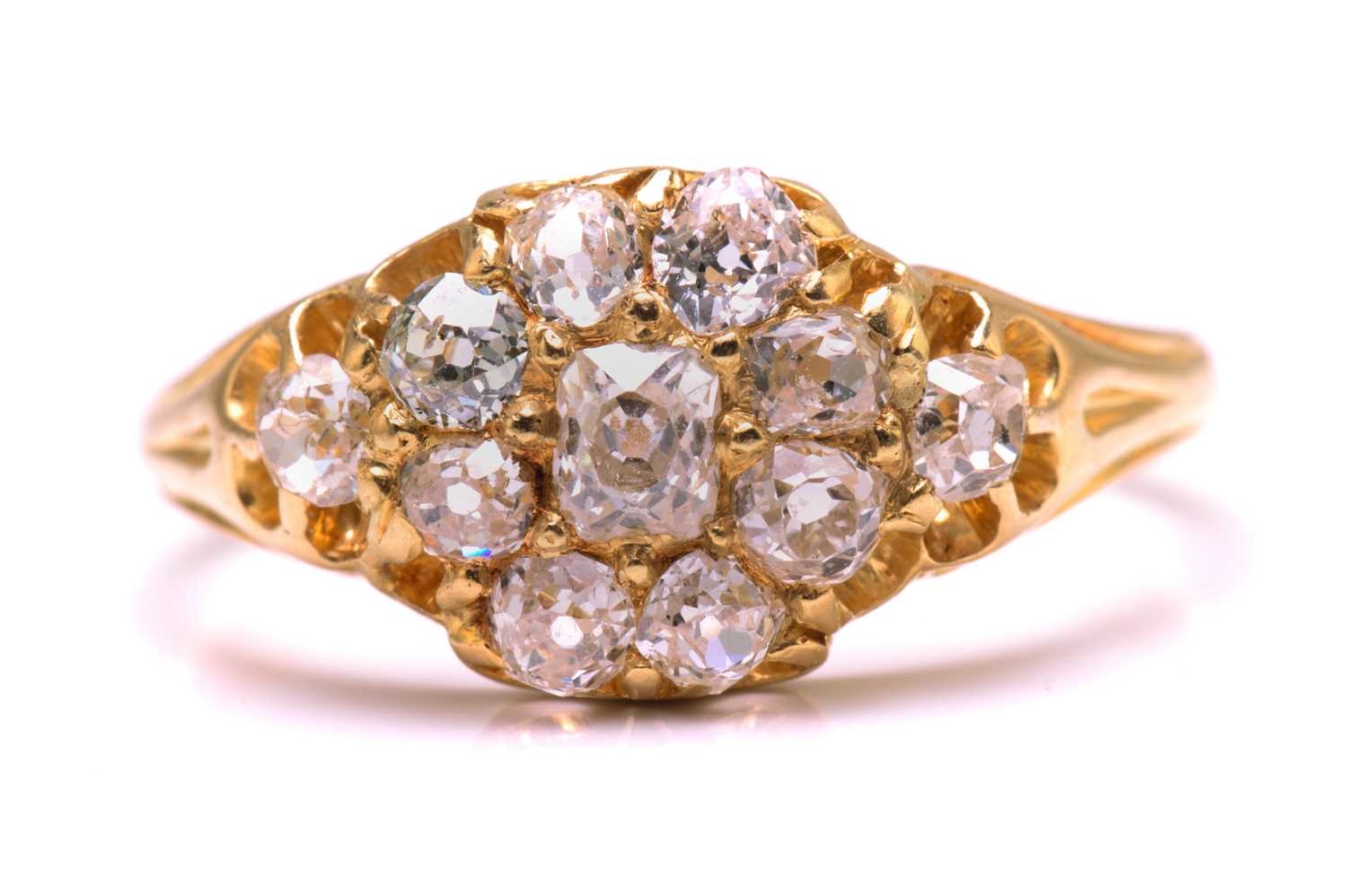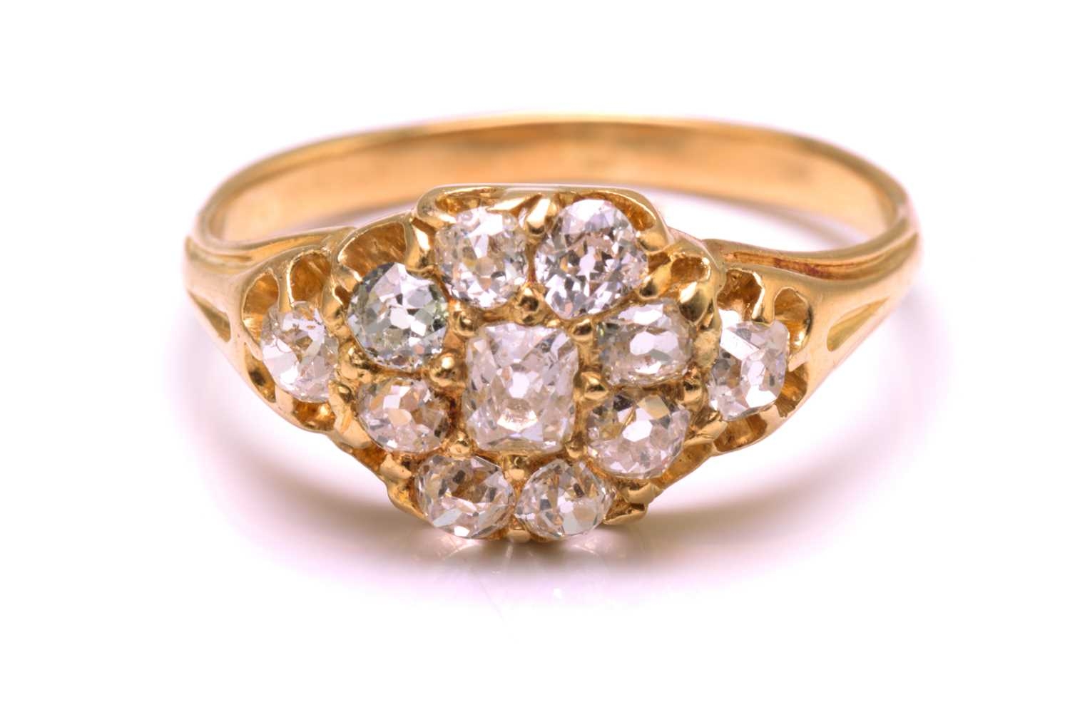 A diamond cluster ring in 18ct gold, consisting of eleven multi-shaped old-cut diamonds, scintillating in a yellow gold mount with carved-out claws, engraved details on shoulders to a tapered D-profile shank, unmarked, ring size O½, ring head measures 13.5 x 9.0 mm, total weight of item 3.4 grams.