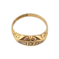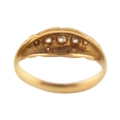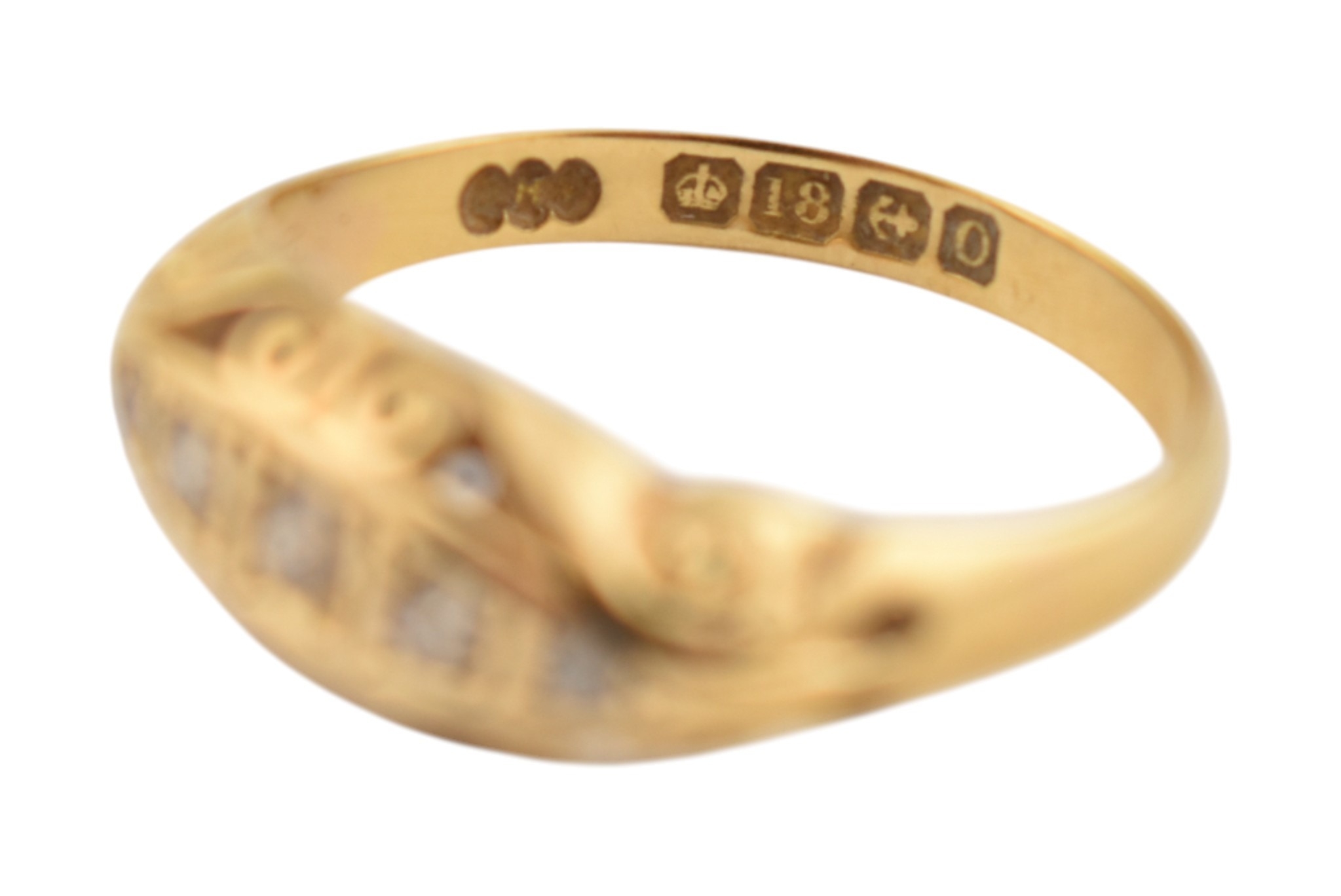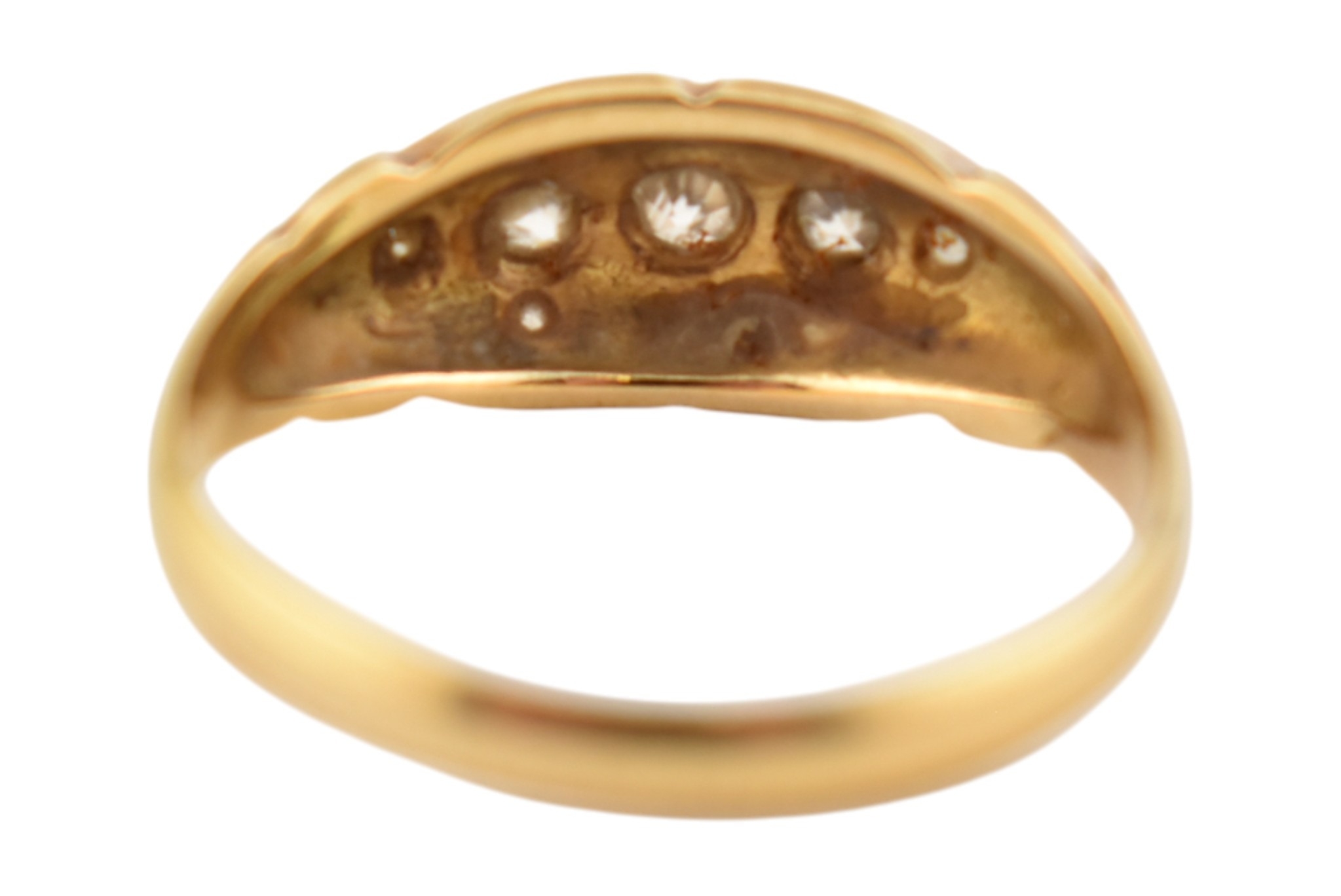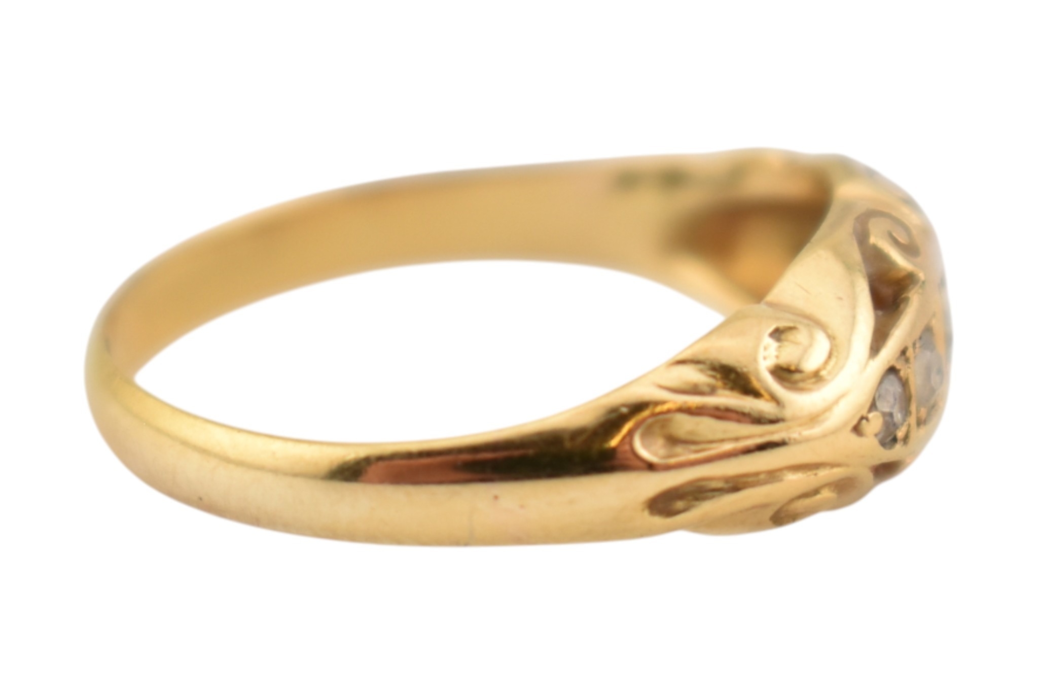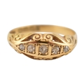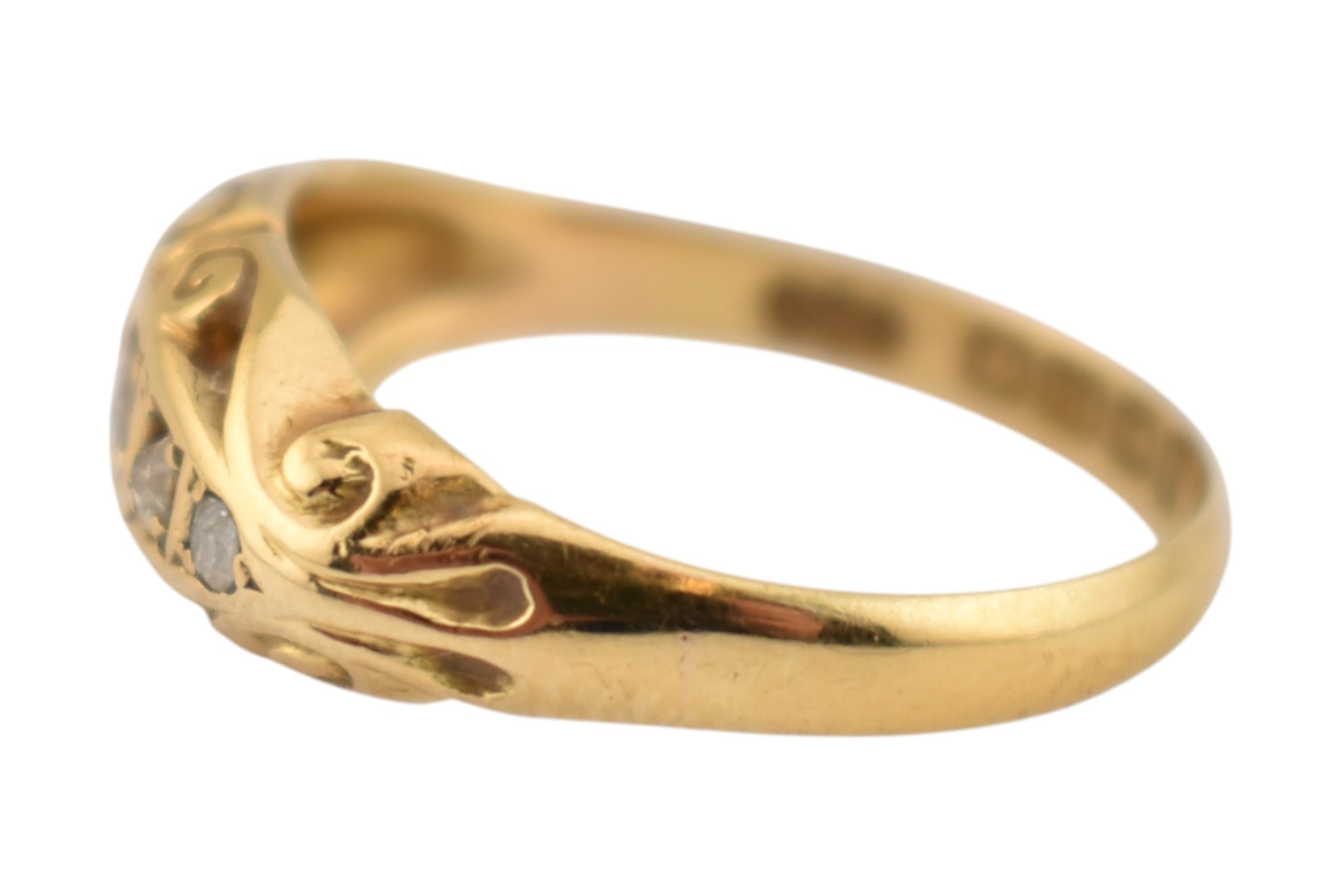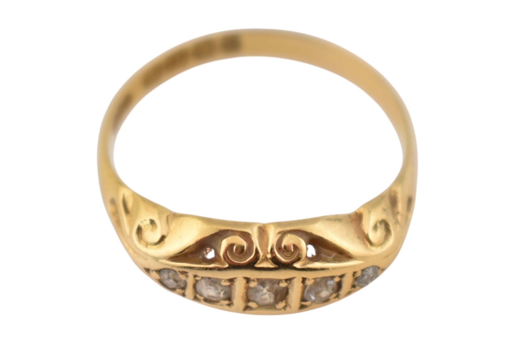 An early 20th century hallmarked 18ct gold & diamond five stone boat ring. The ring set with five old cut diamonds to a scrolled mount. Hallmarked Birmingham 1913. Weight 3.2g. Size P.