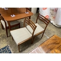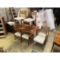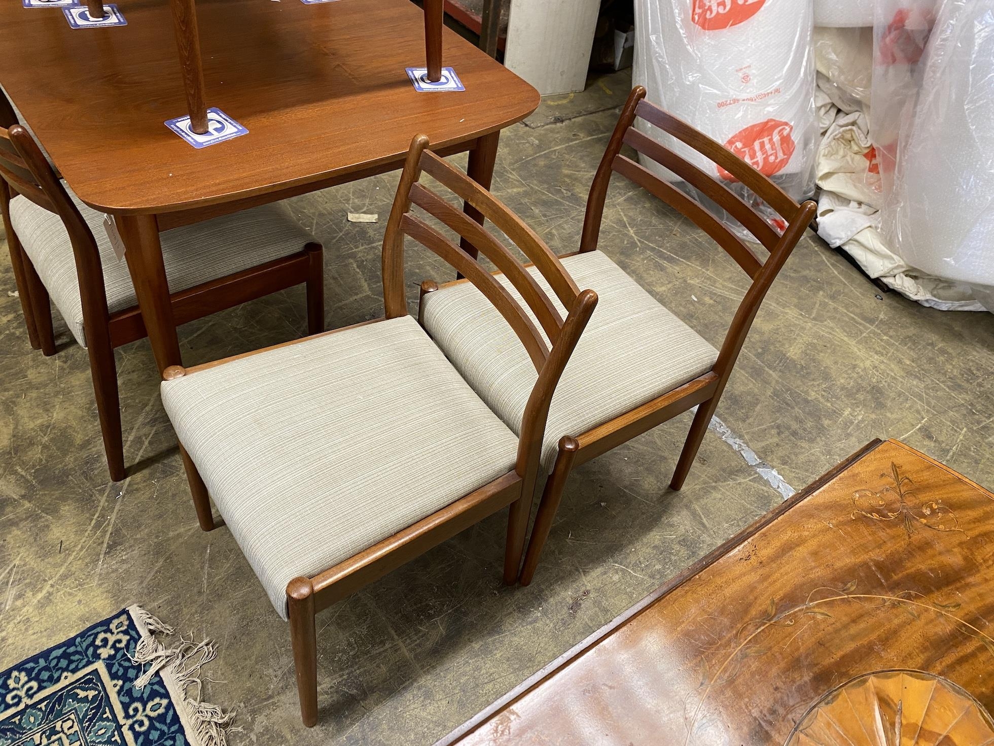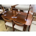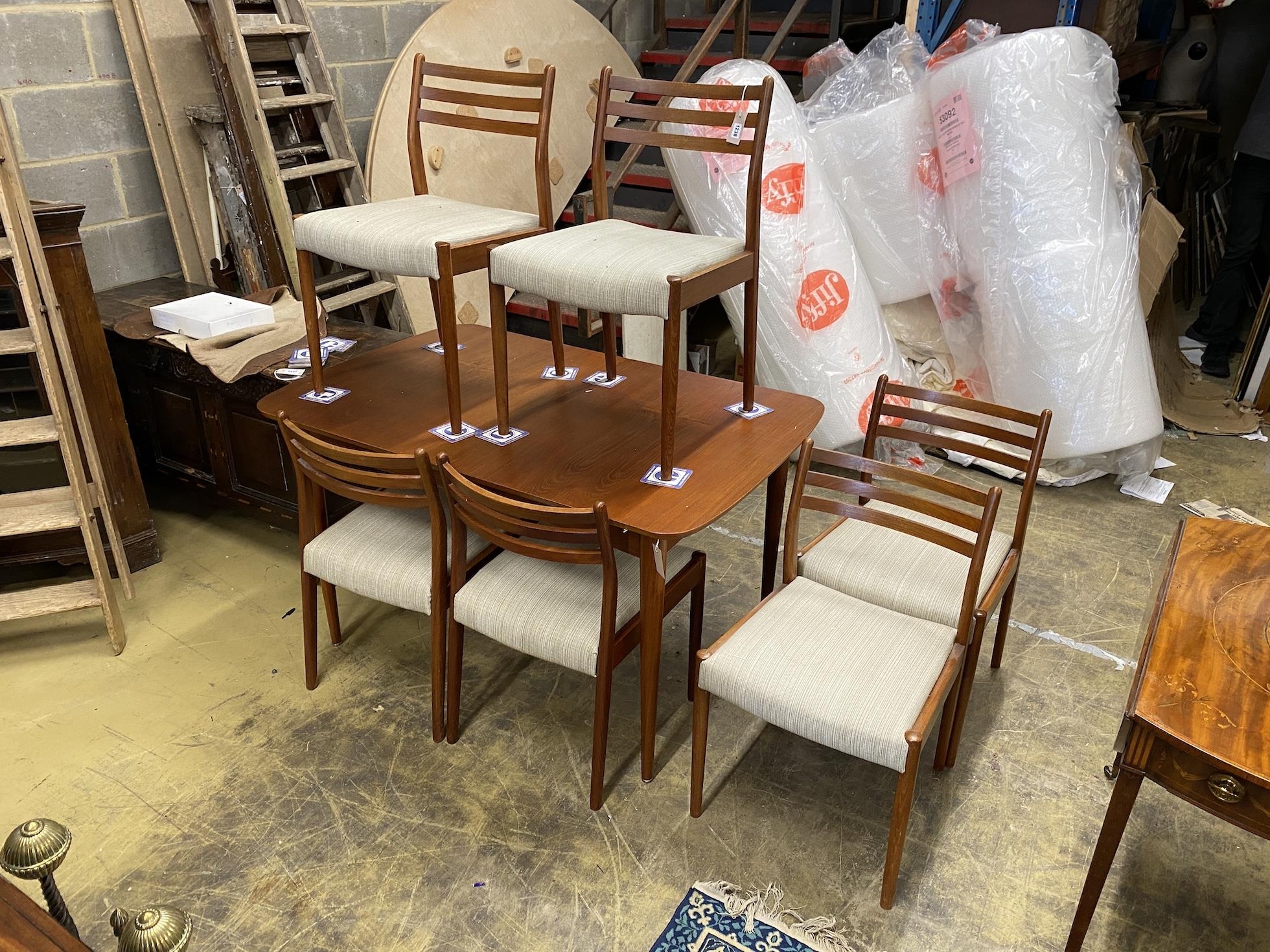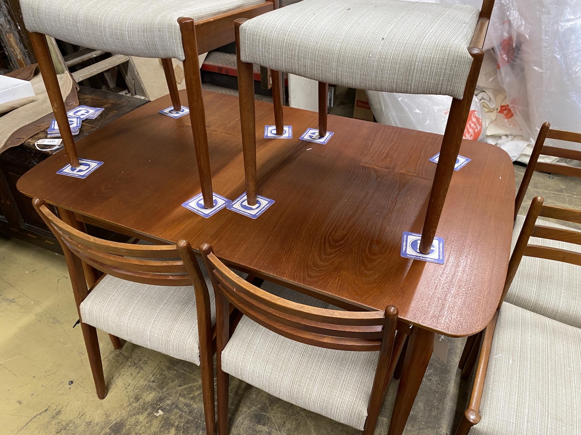 A mid 20th century Austin Suite teak extending dining table, length 130cm, width 84cm, height 73cm and a set of six matching bar back dining chairs