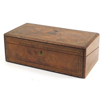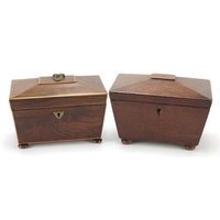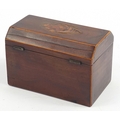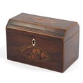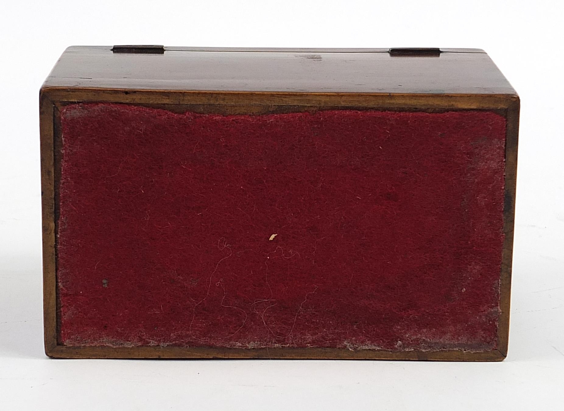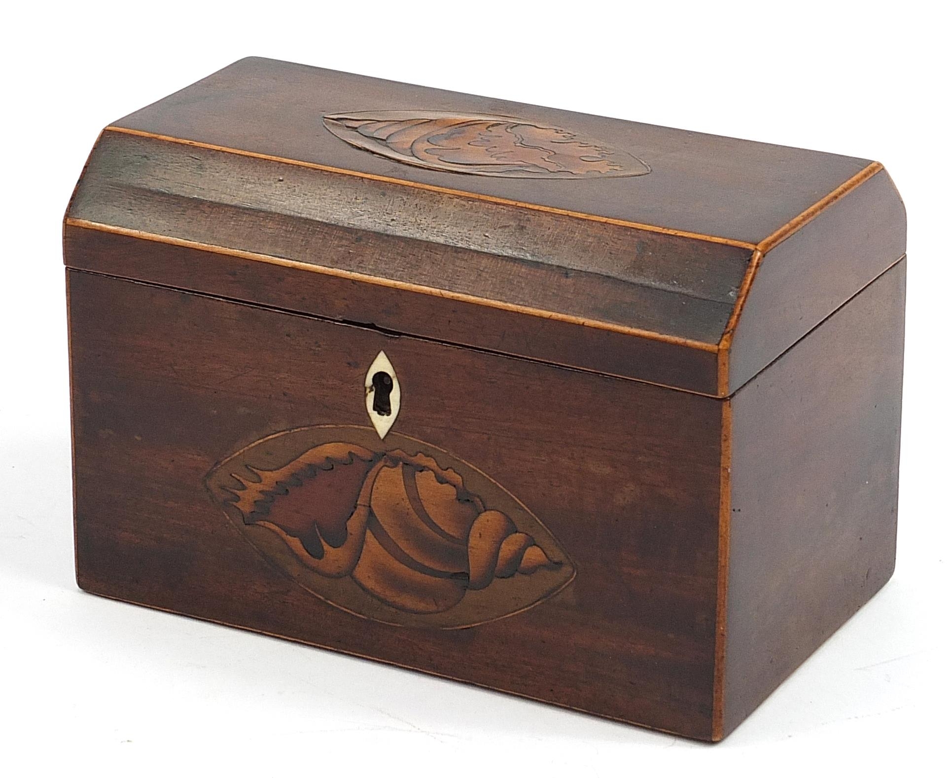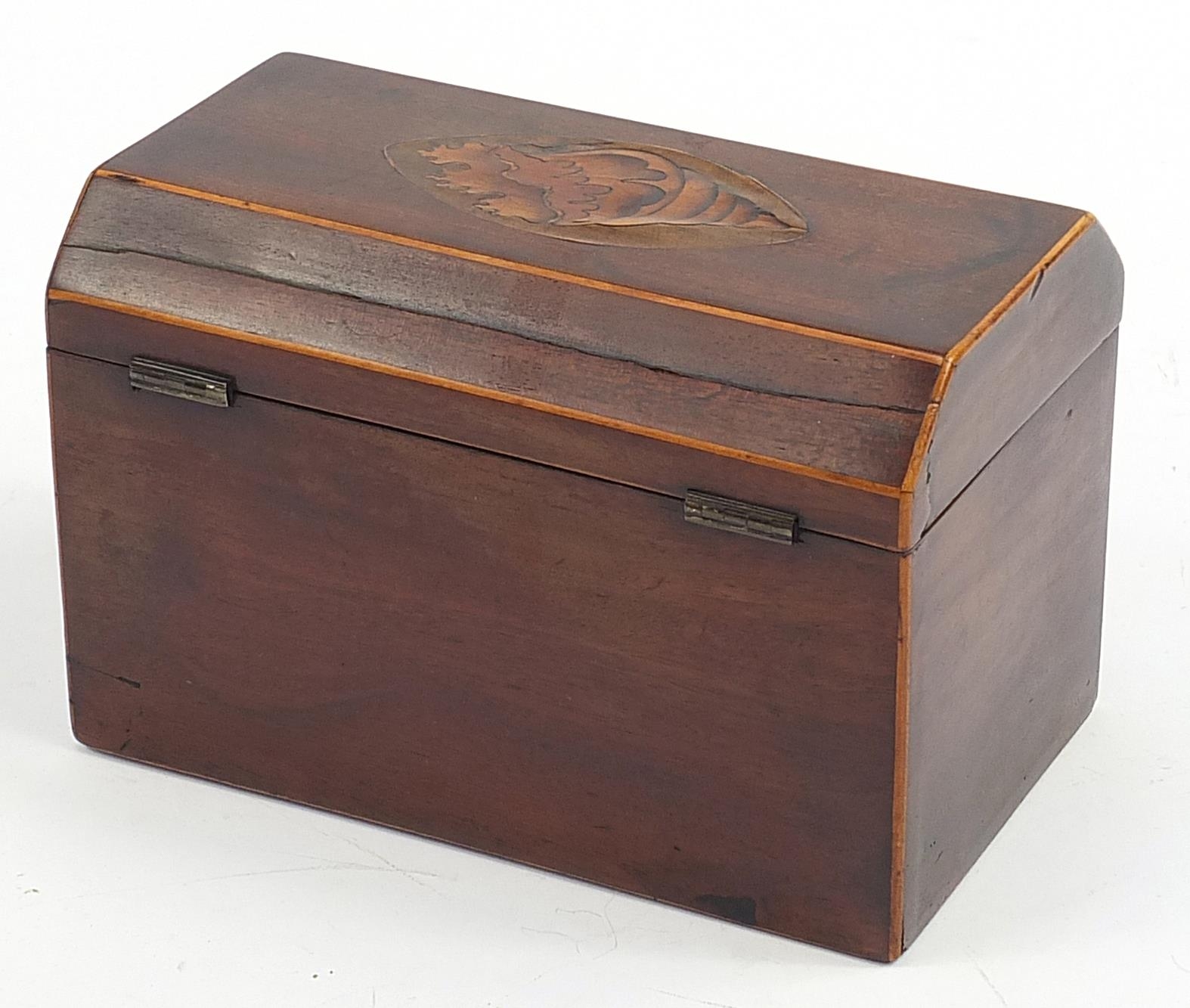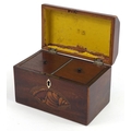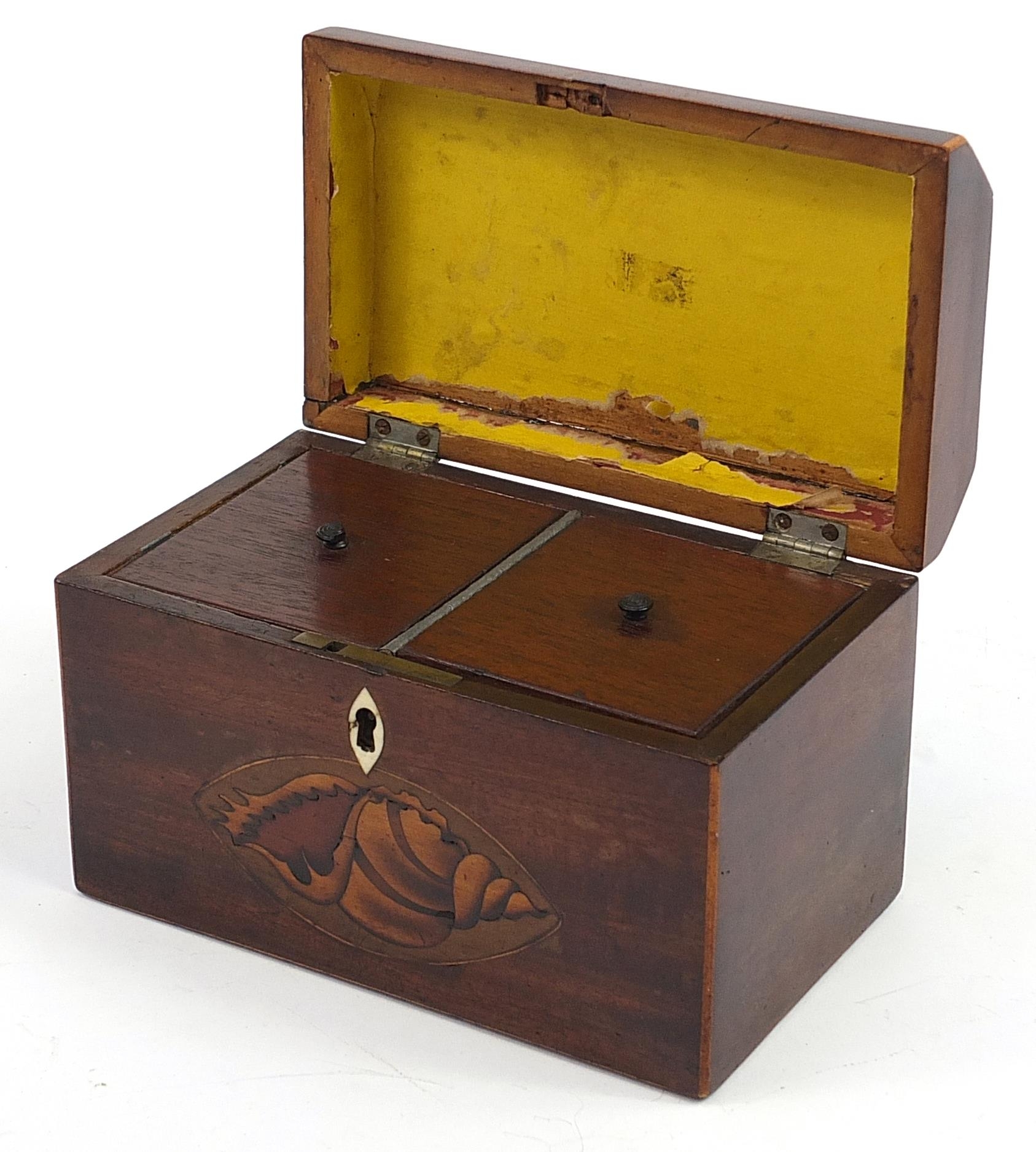 Early 19th century inlaid mahogany tea caddy with twin divisional interior, 12.5cm H x 18cm W x 11cm D