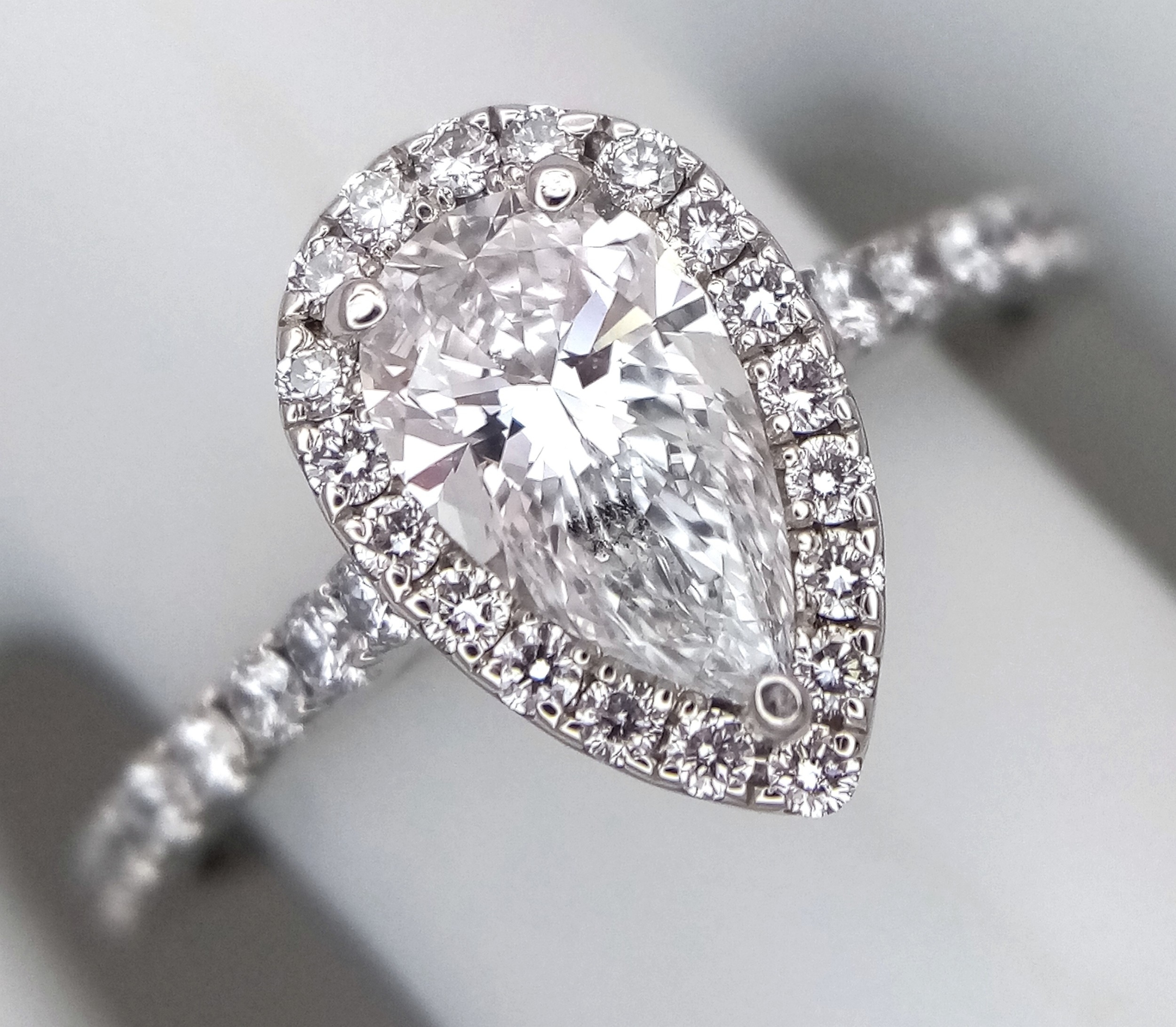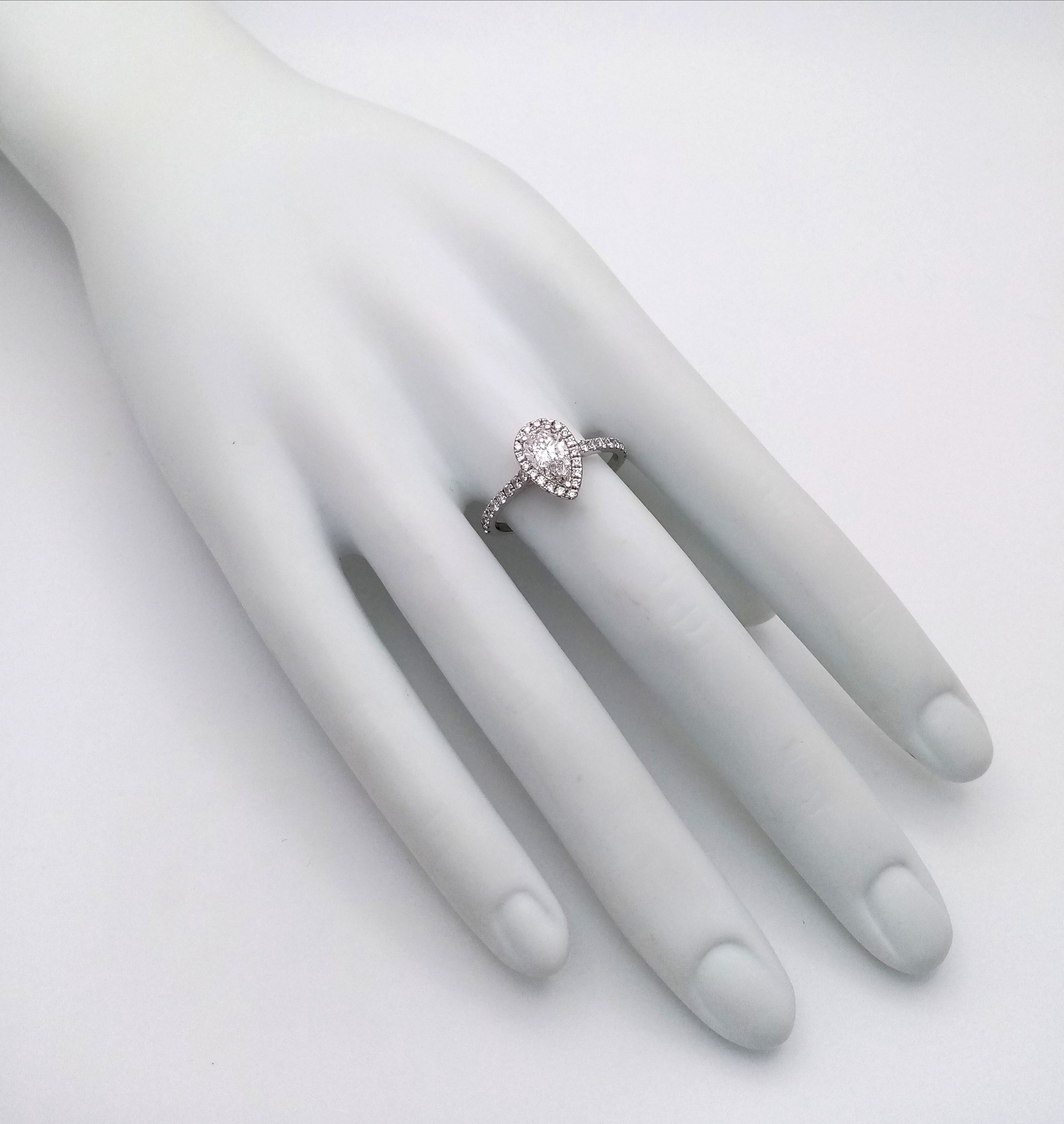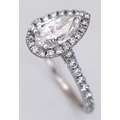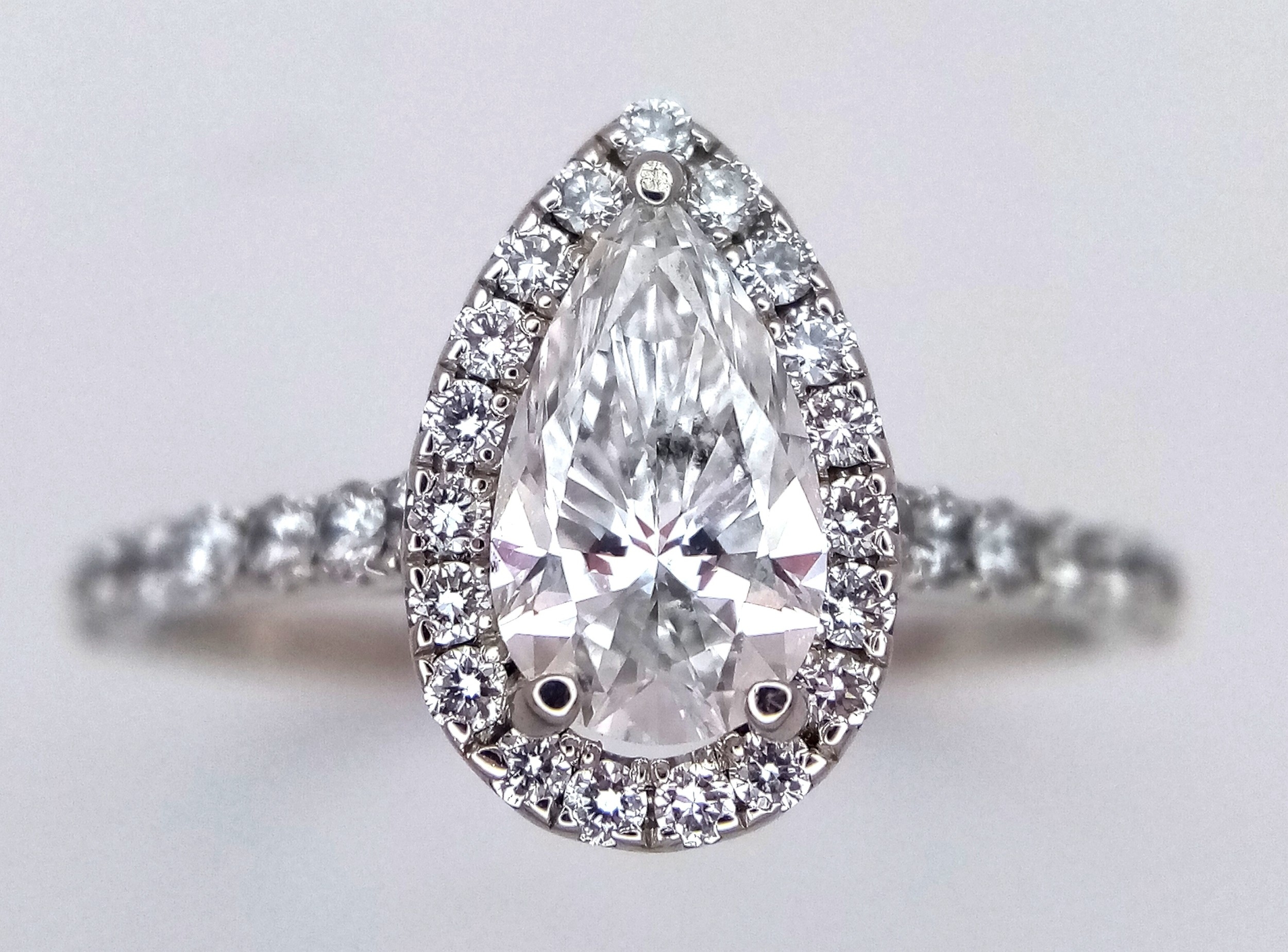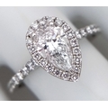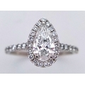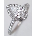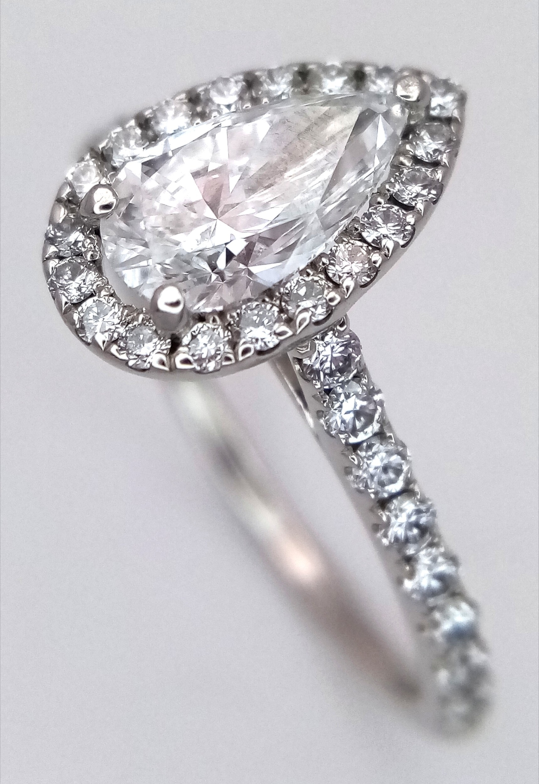 A Platinum and Lab Diamond Dress Ring. 1ct pear brilliant cut diamond having D colour with VS2 clarity. A further 0.37ctw of diamond accents. Size R. 2.6g total weight. Comes with an electronic copy of an IGI certificate. Ref:26260.