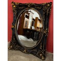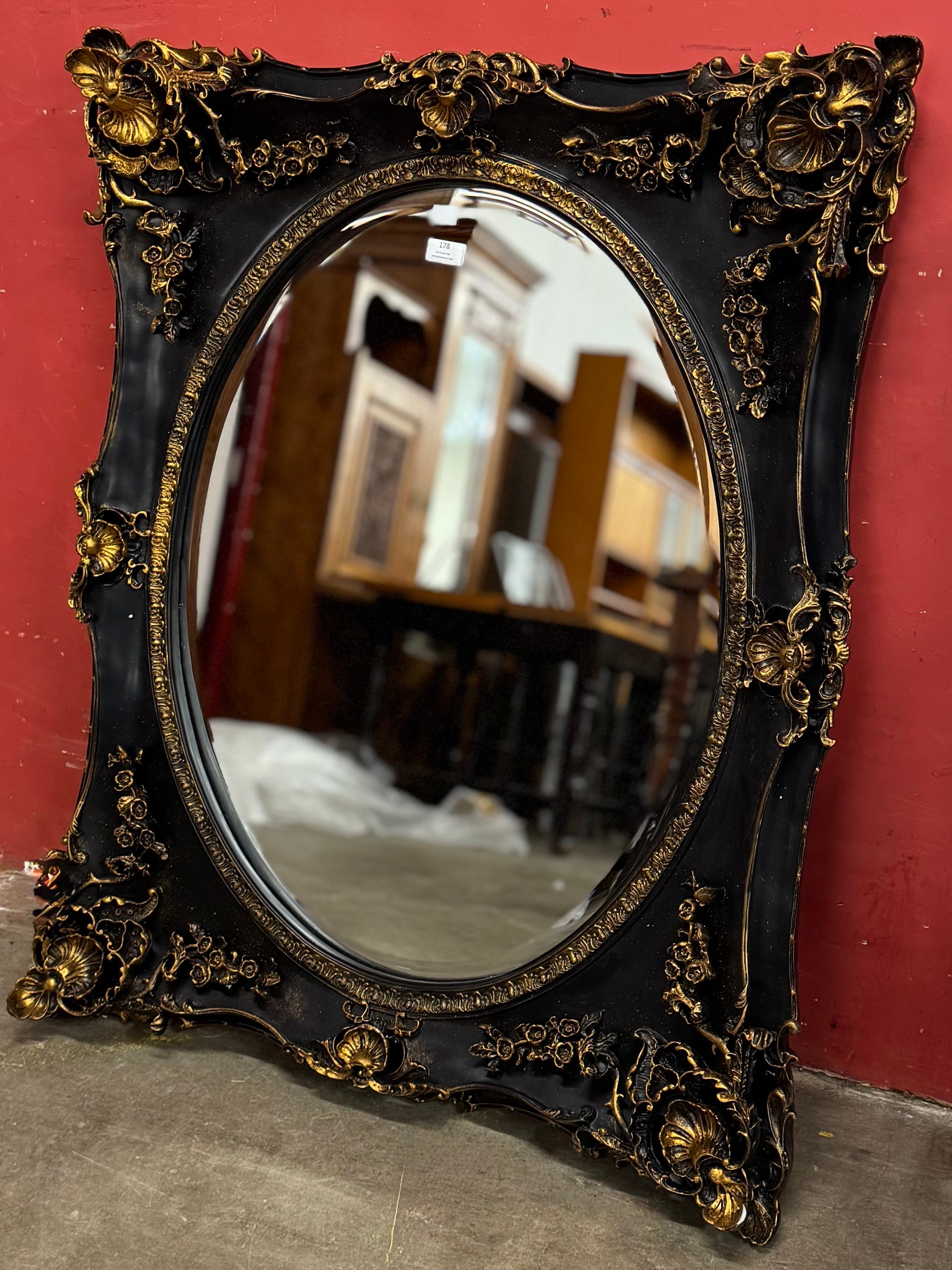 A French Rococo style ebonised and parcel gilt framed mirrors