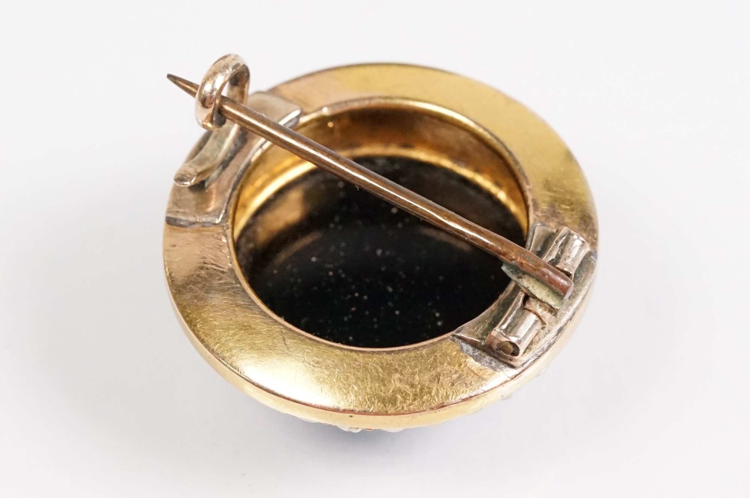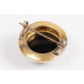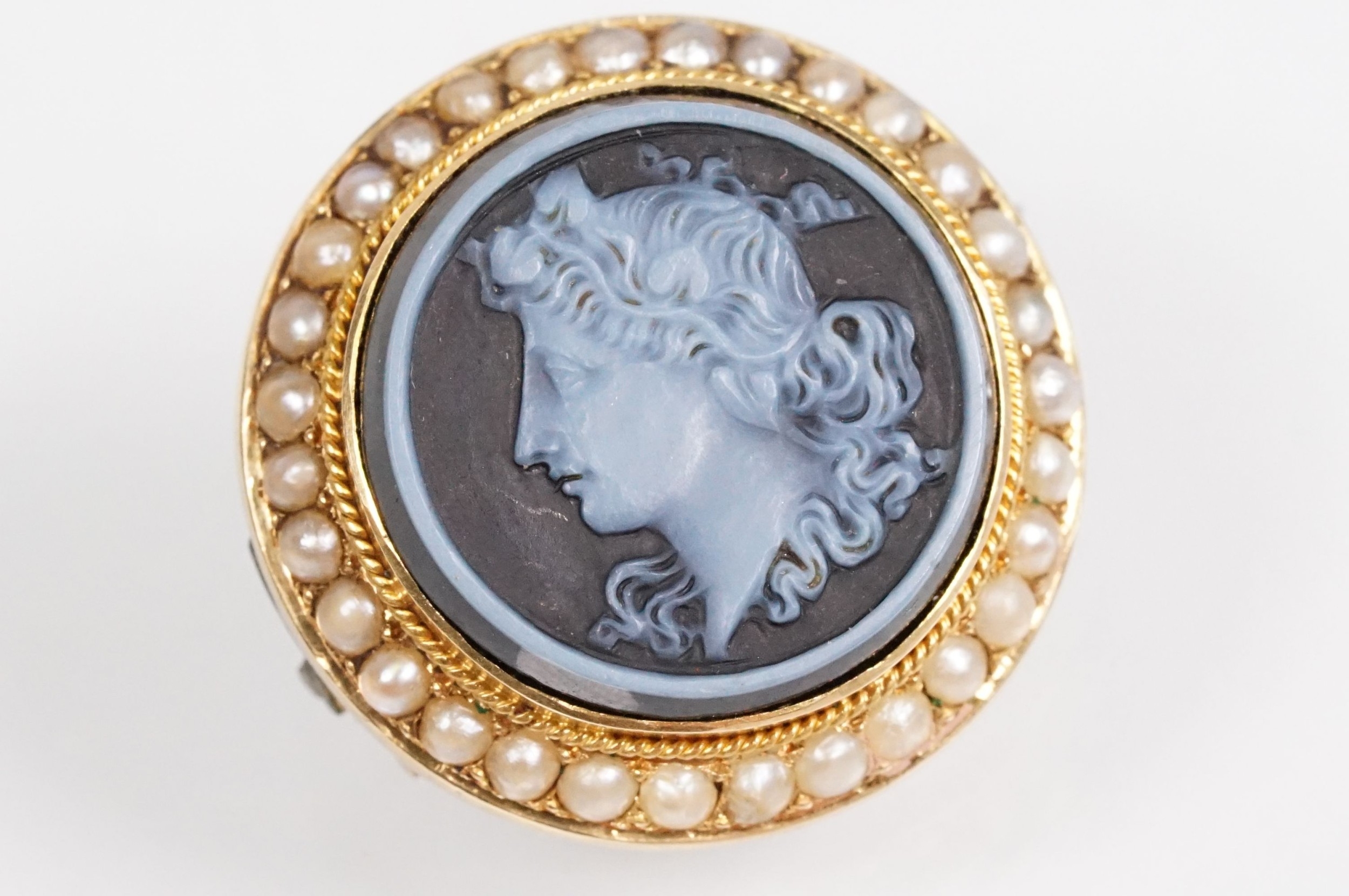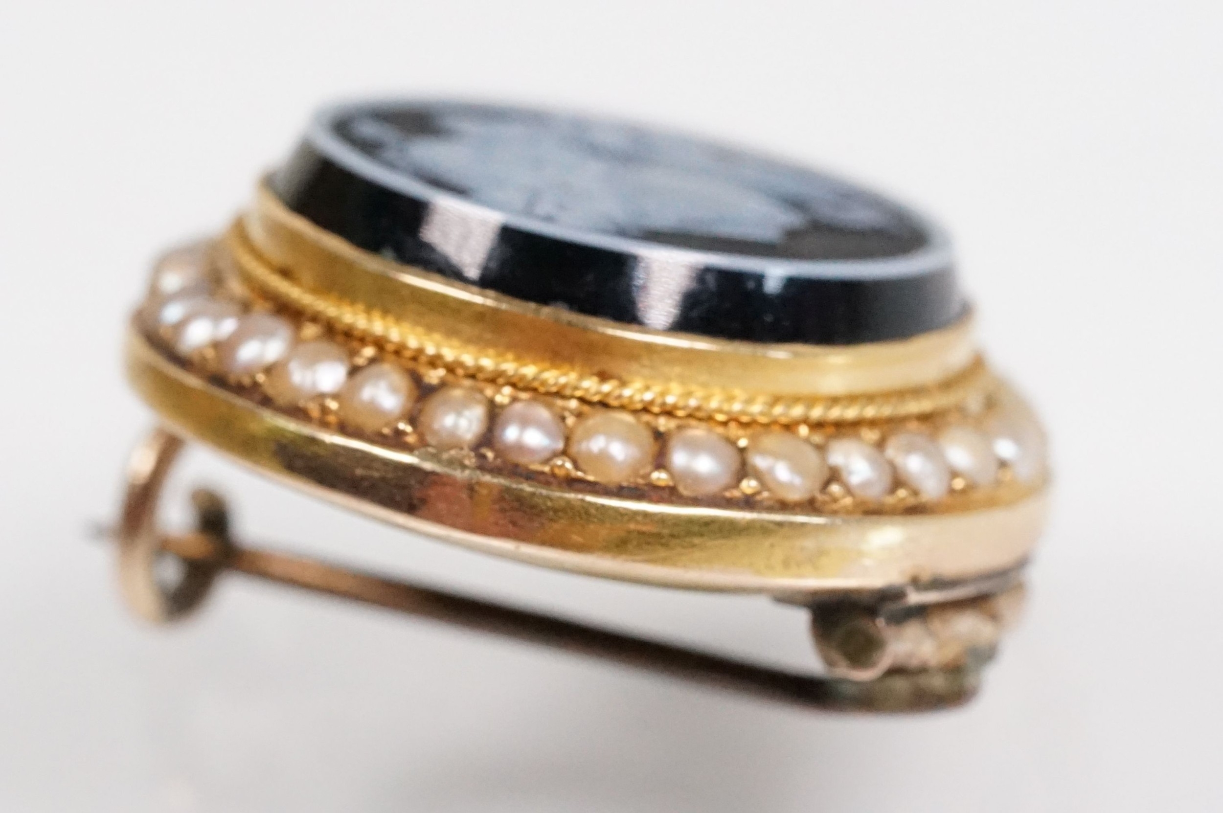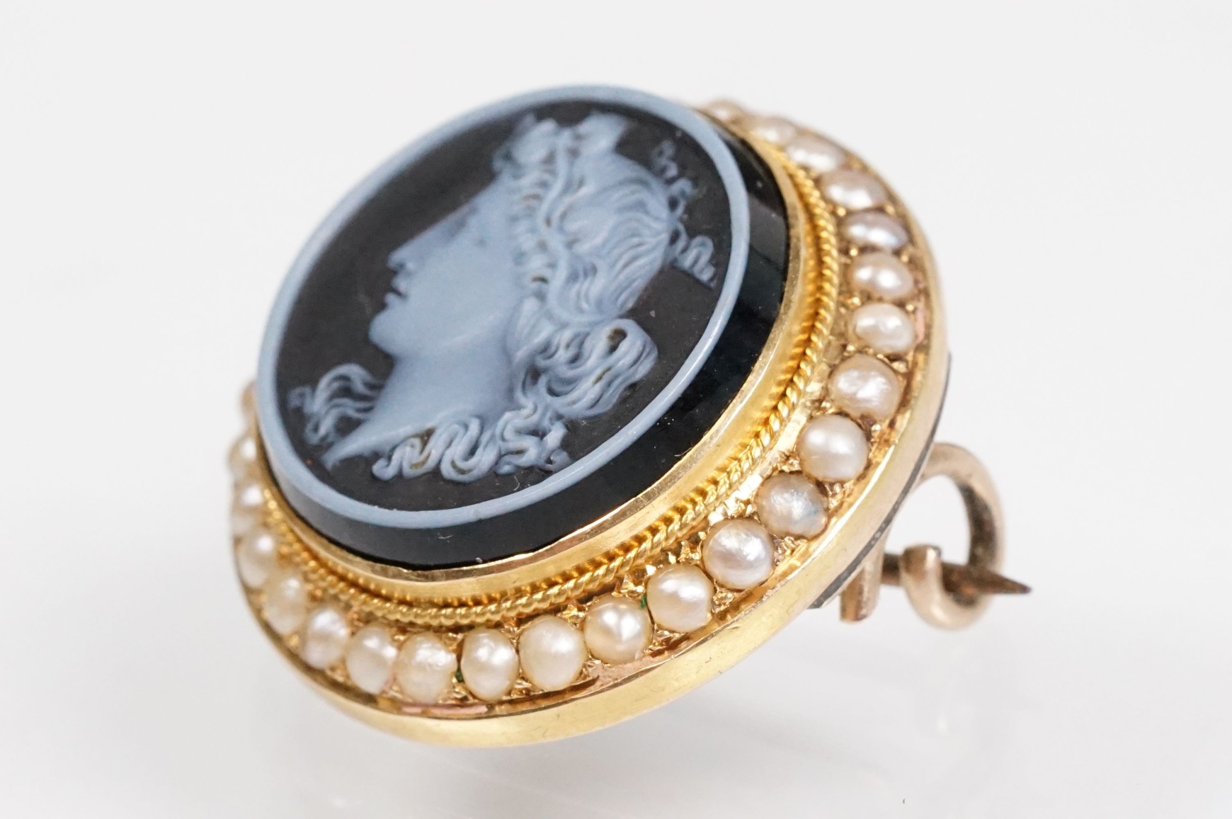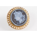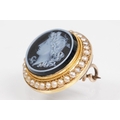 19th Century Victorian carved black stone cameo brooch being set with a round hand carved cameo portrait set within a yellow metal mount with a halo of half pearls. Unmarked, tests indicate 9ct gold. Measures 2cm diameter.