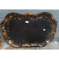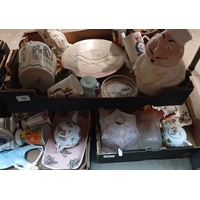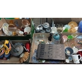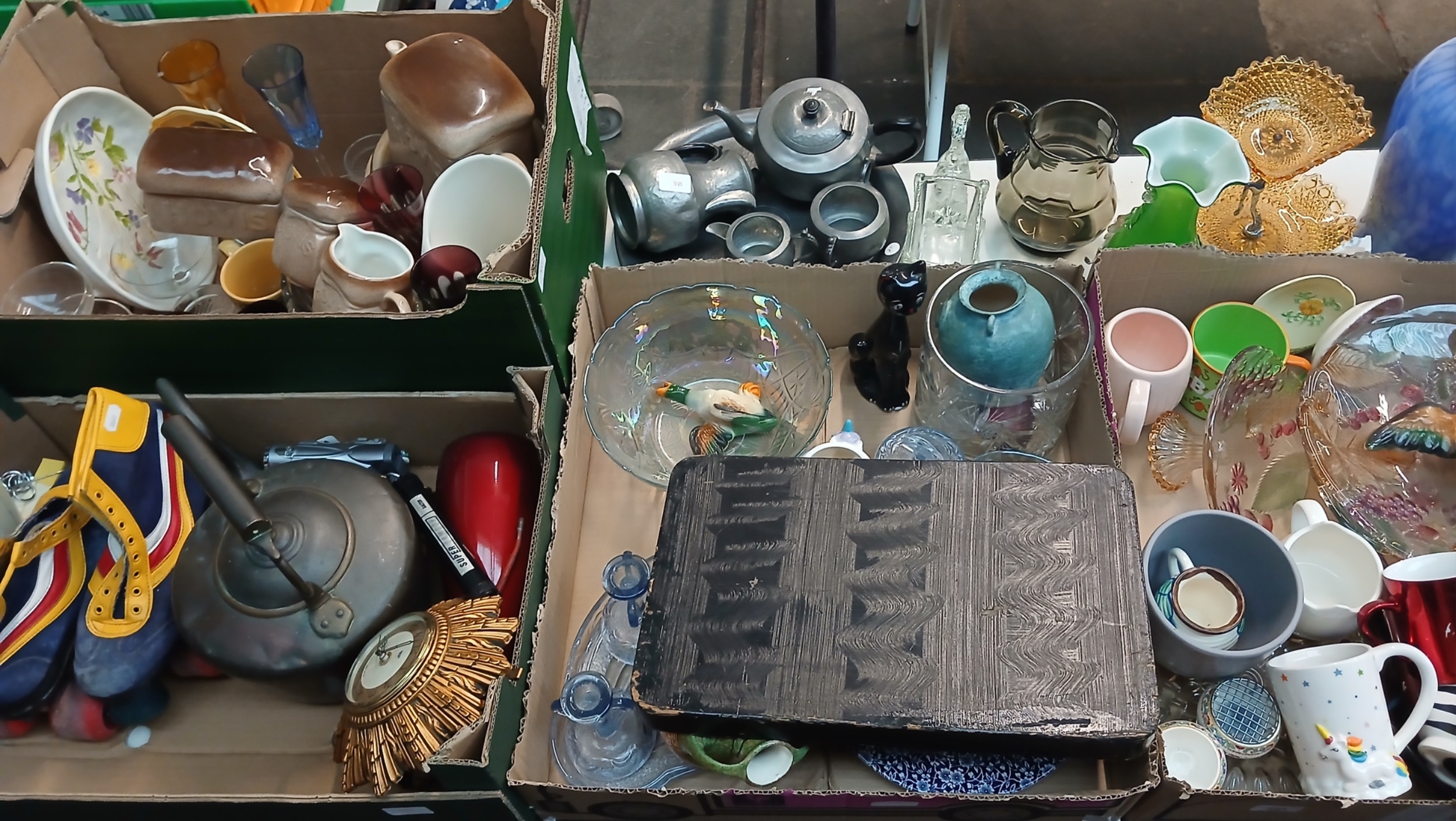 A table top of glass and ceramics in 4 boxes, together with a pewter tray and tea set and a pair of roller boots
