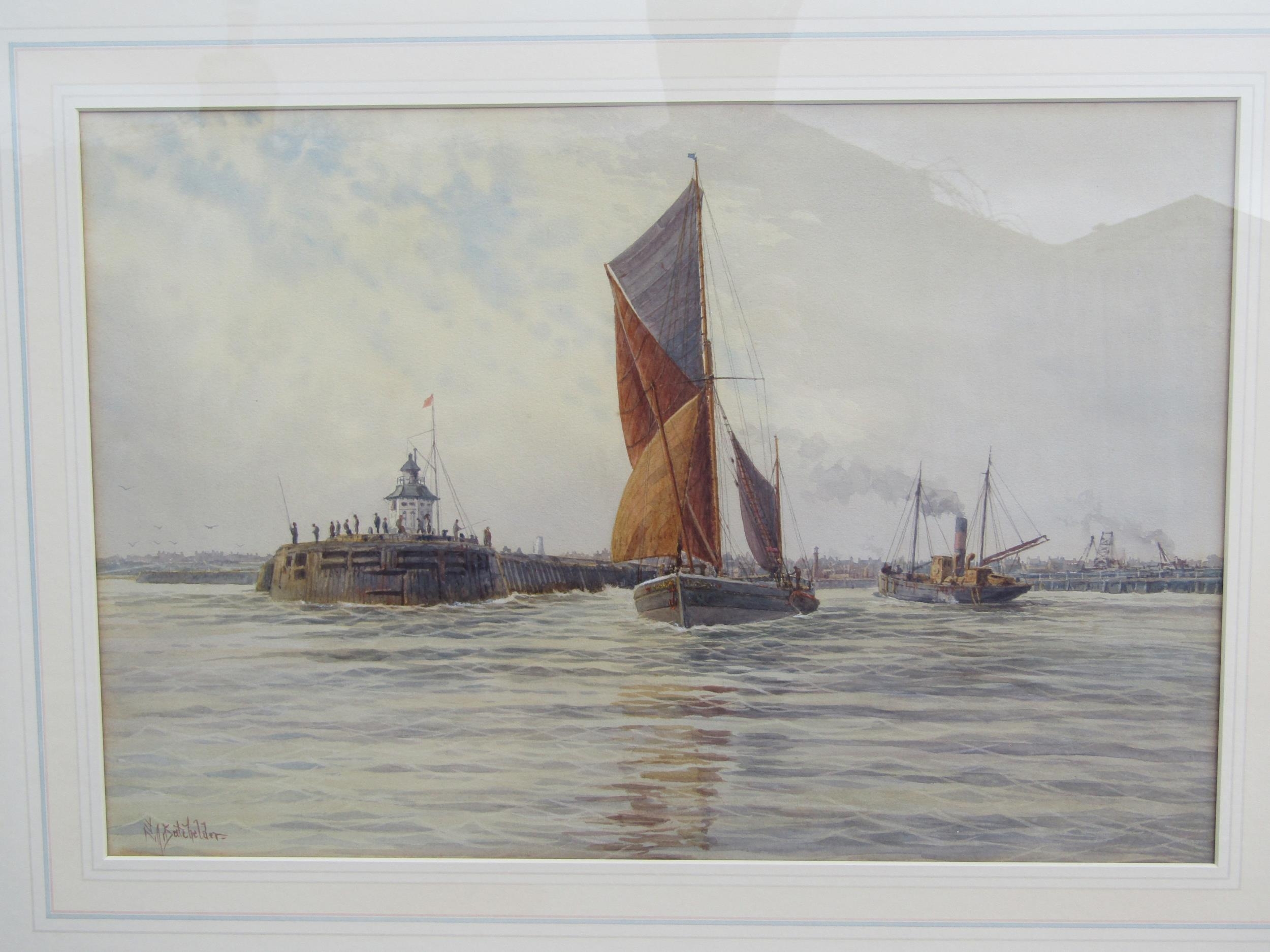 STEPHEN JOHN BATCHELDER (1849-1932) Fishing boat and wherry in harbours mouth, watercolour, 35cm x 52cm