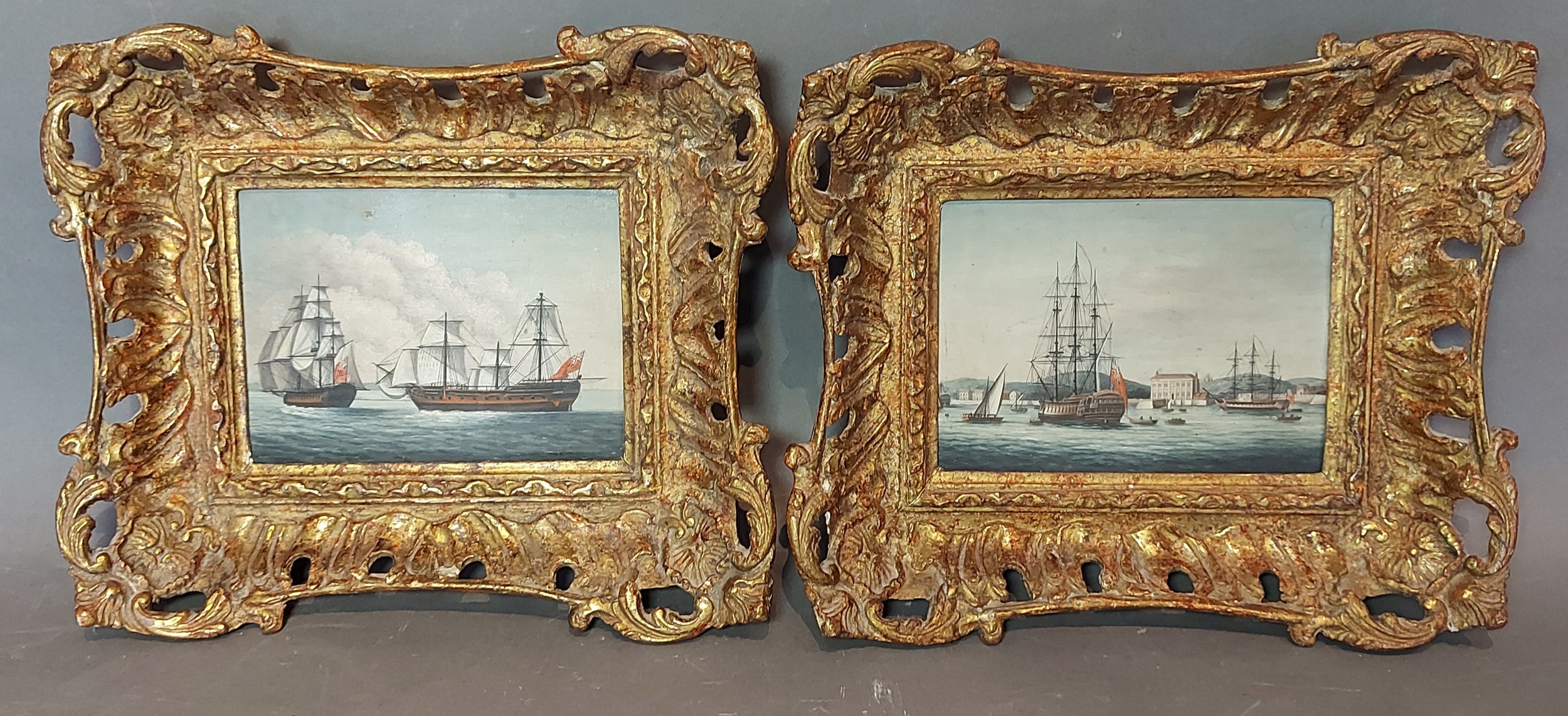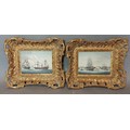 A pair of 19th Century oils on copper panels, marine scenes with British ships of the line and a similar ships in port, 9cms x 13cms