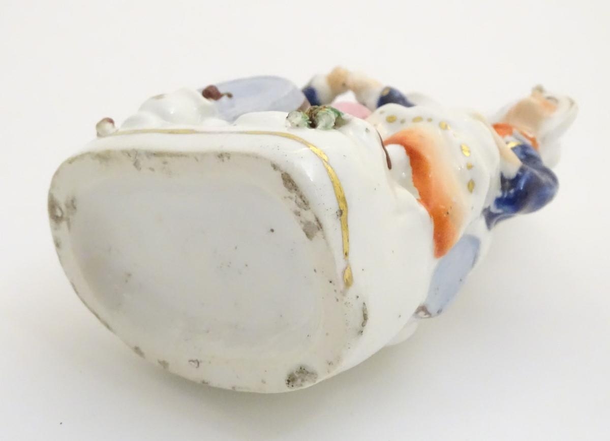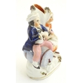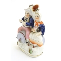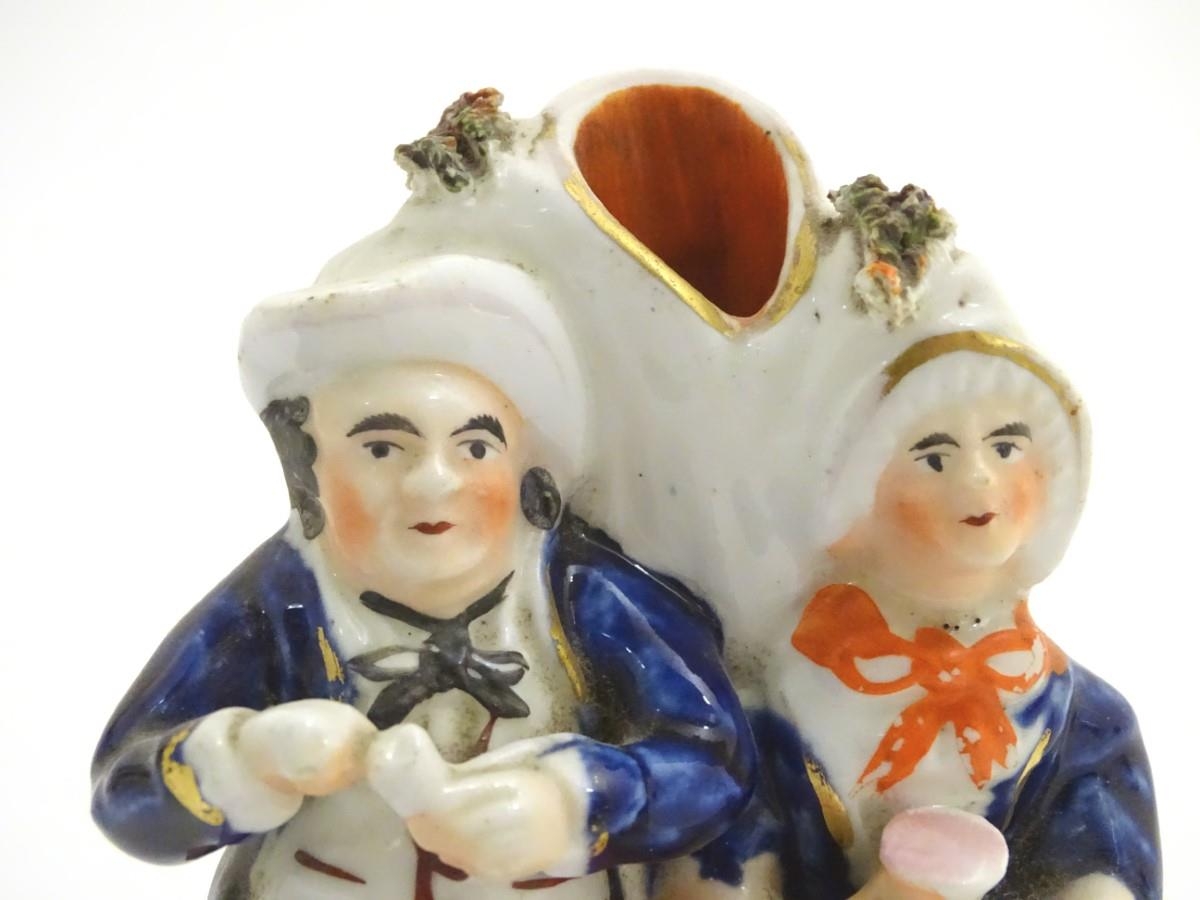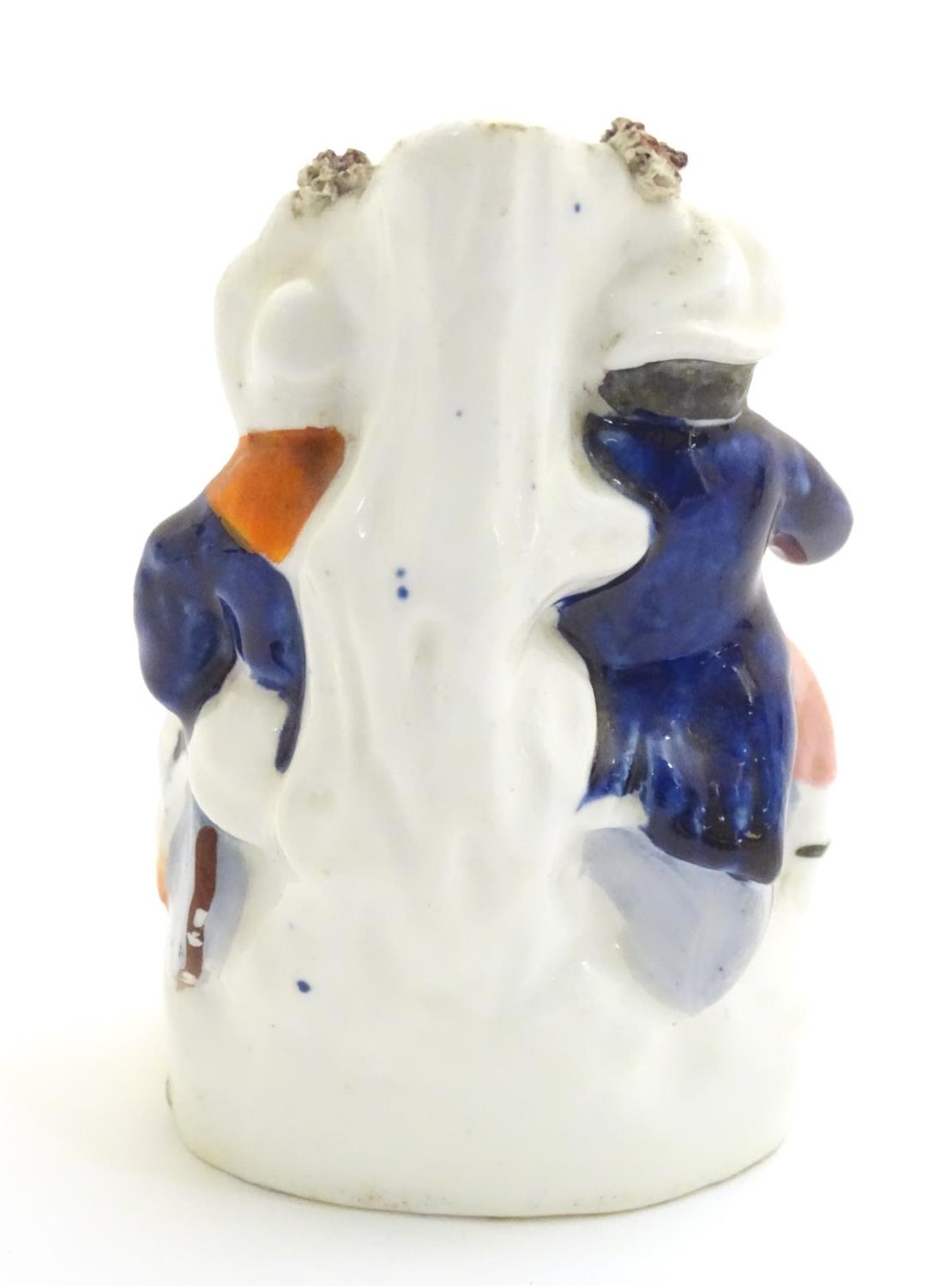 A Victorian Staffordshire pottery flatback spill vase depicting a man and a woman, the male figure seated on a barrel. Approx. 5'' high.