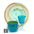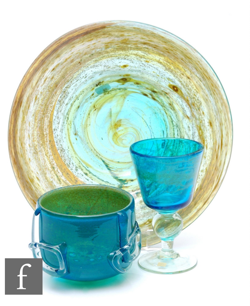 Mdina - A later 20th Century glass bubbly blue Ming Chinese Bowl, of cylindrical form with free form clear glass motifs, diameter 13cm, a large blue and yellow bowl of circular form, concentric mottled bands of yellow ochre over tonal blue ground, diameter 32cm, and a blue and yellow chalice on clear knopped stem and circular foot. (3)