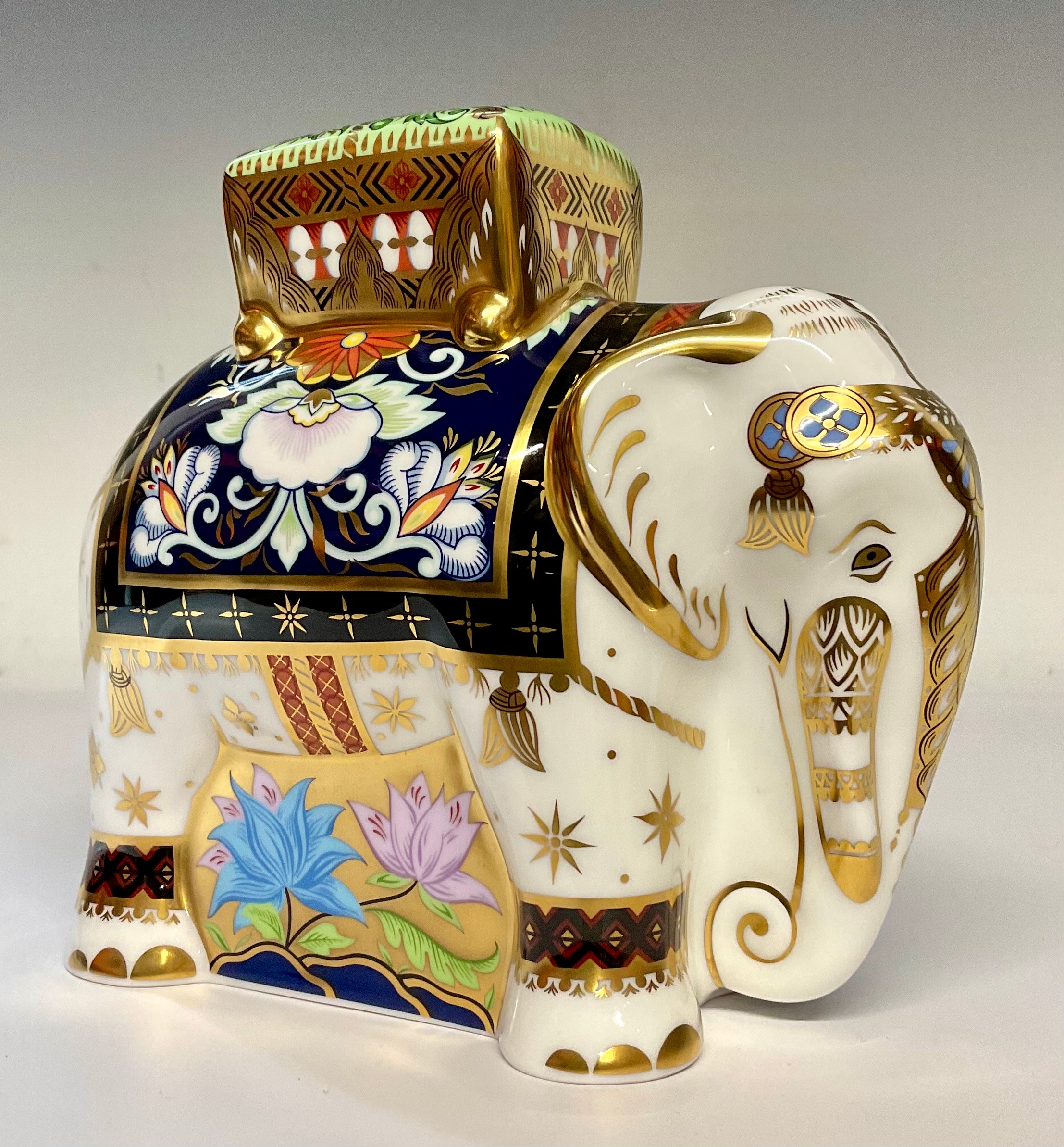 A Royal Crown Derby paperweight, Father Indian Elephant, with howdah, gold stopper, 15cm high, printed mark in red