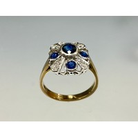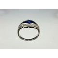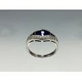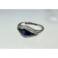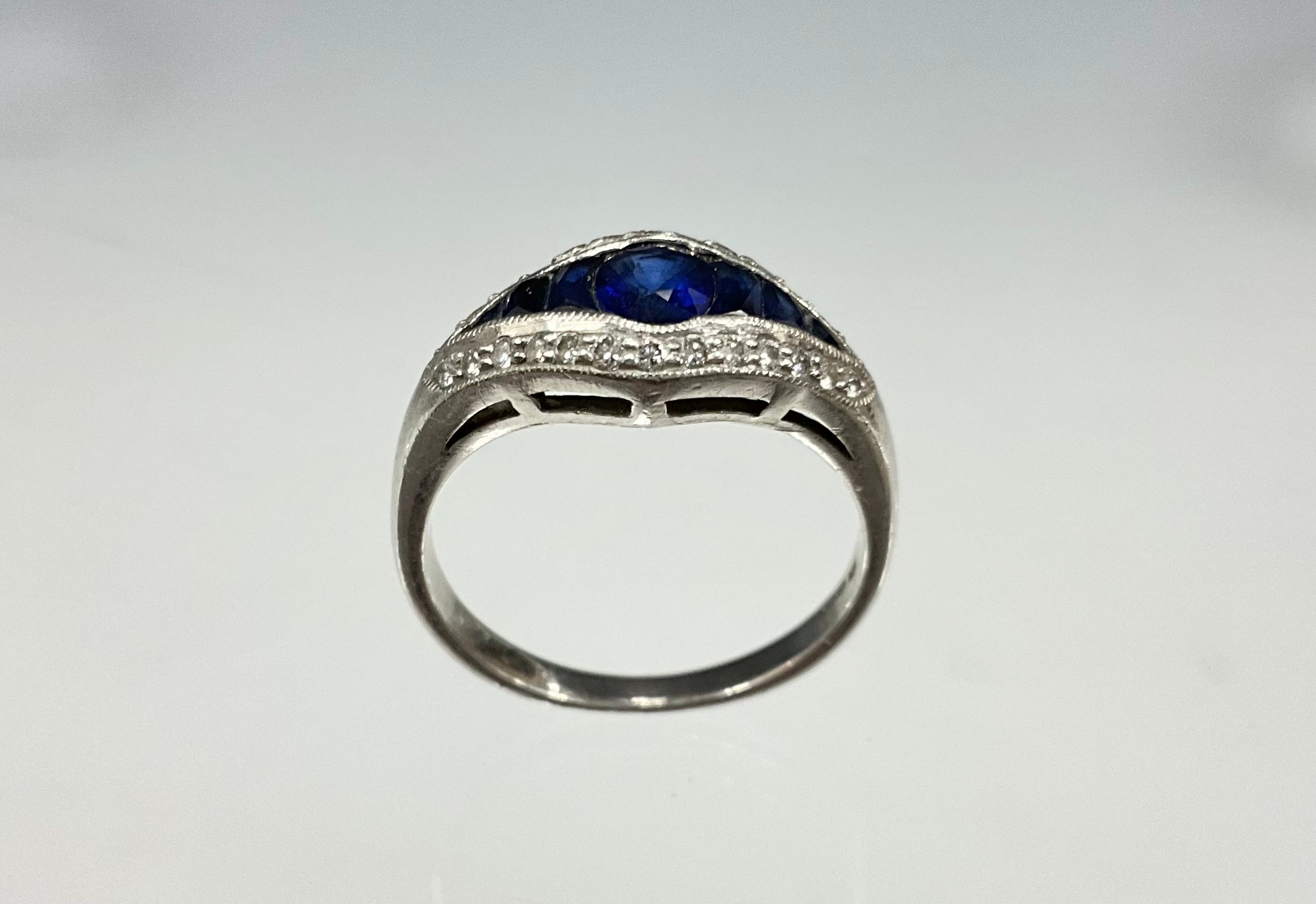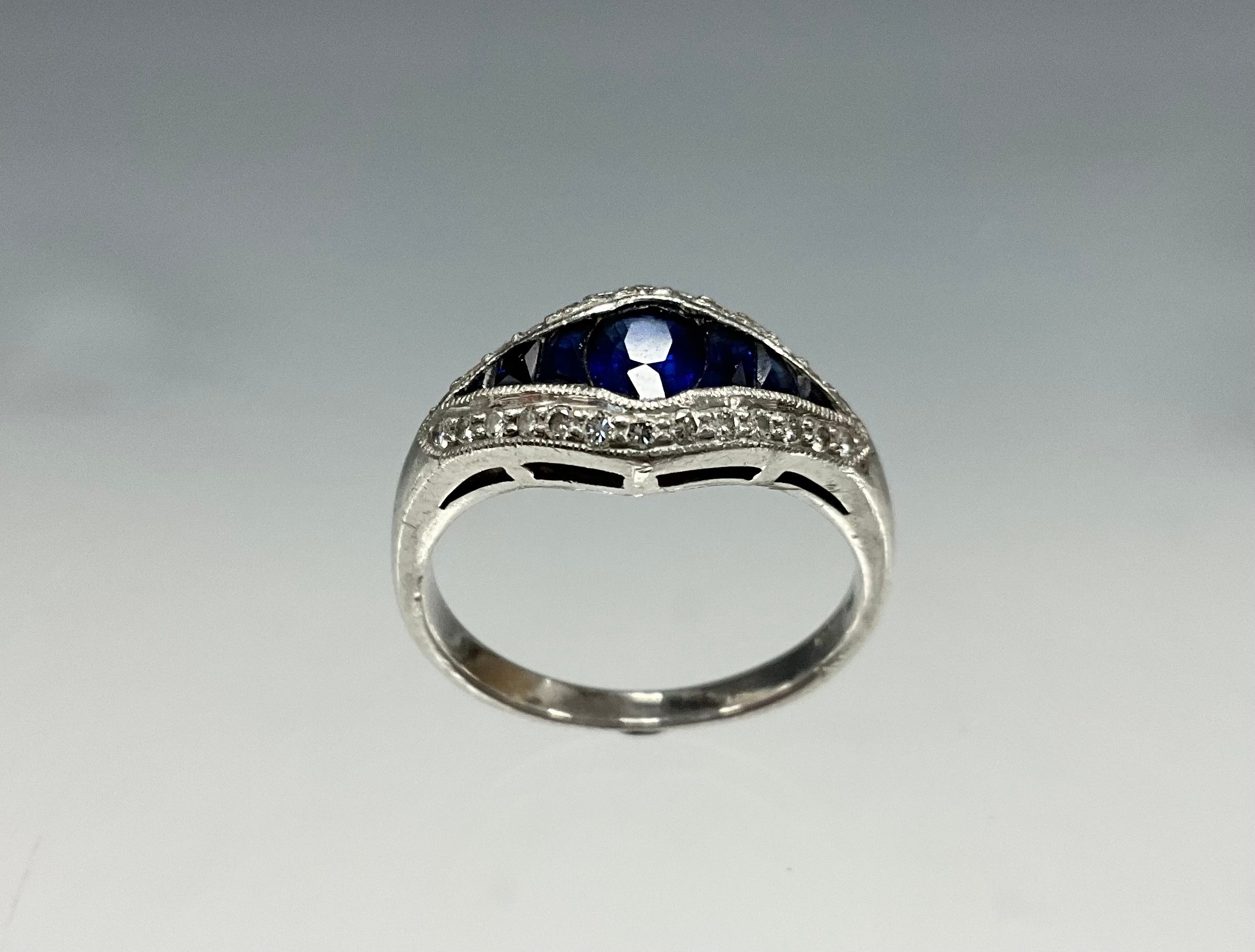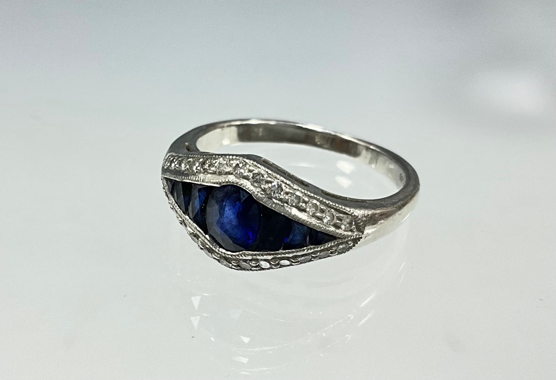An Art Deco Style platinum sapphire and diamond ring, set with an oval brilliant cut deep blue sapphire in the centre measuring approx. 5mm x 4mm x 2.5mm with three faceted fancy cut deep blue sapphires either side of the centre sapphire, surrounded by a band of melee round brilliant cut diamonds, stamped "950", size N, approx. 5.7g gross