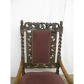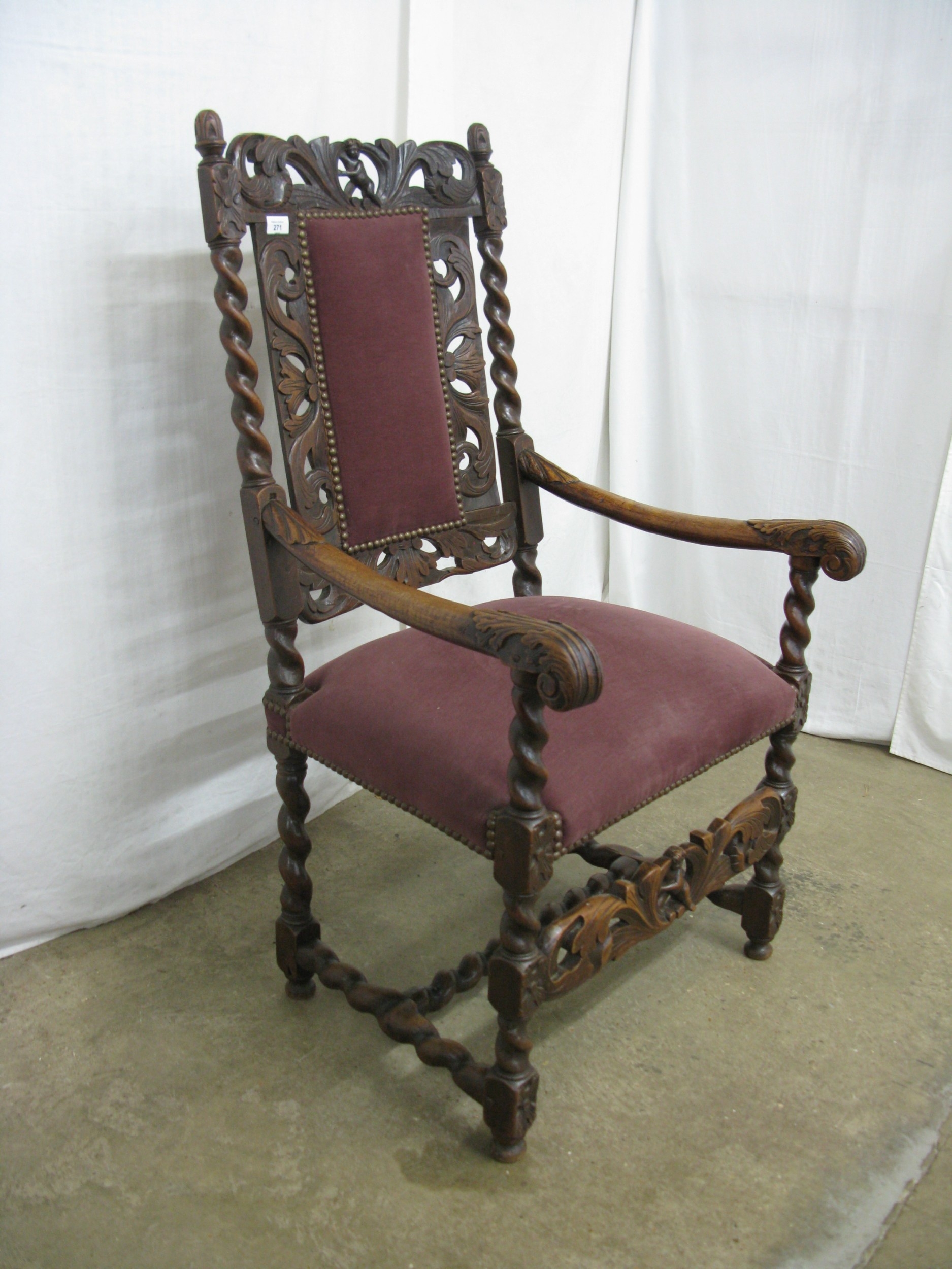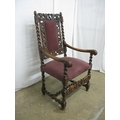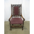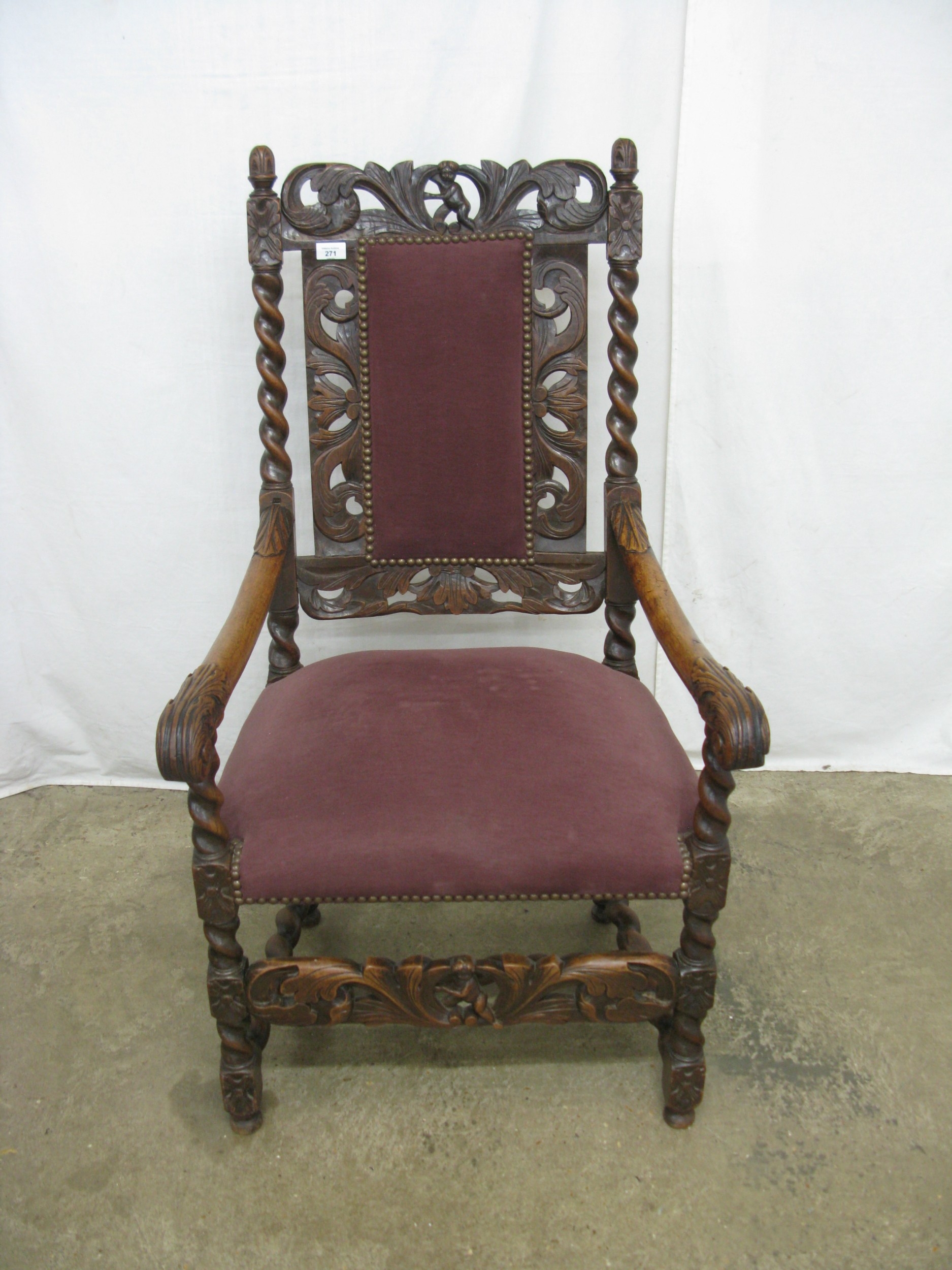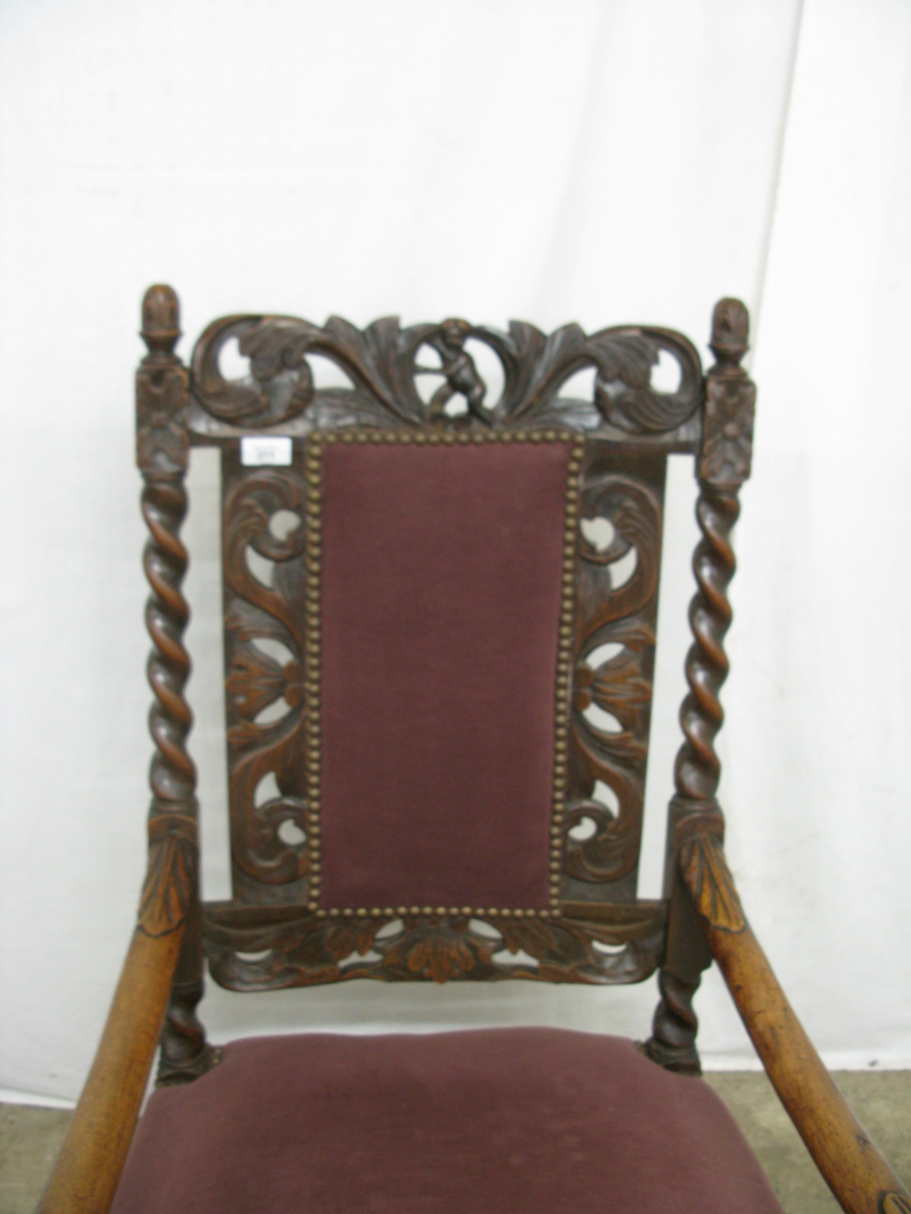 Charles II walnut open armchair having padded back surmounted with putti and foliate carved framework supported by barley twist uprights and sweeping arms leading to overstuffed seat, standing on carved block and barley twist stretchered legs - 63cm x 64cm x 116cm tall