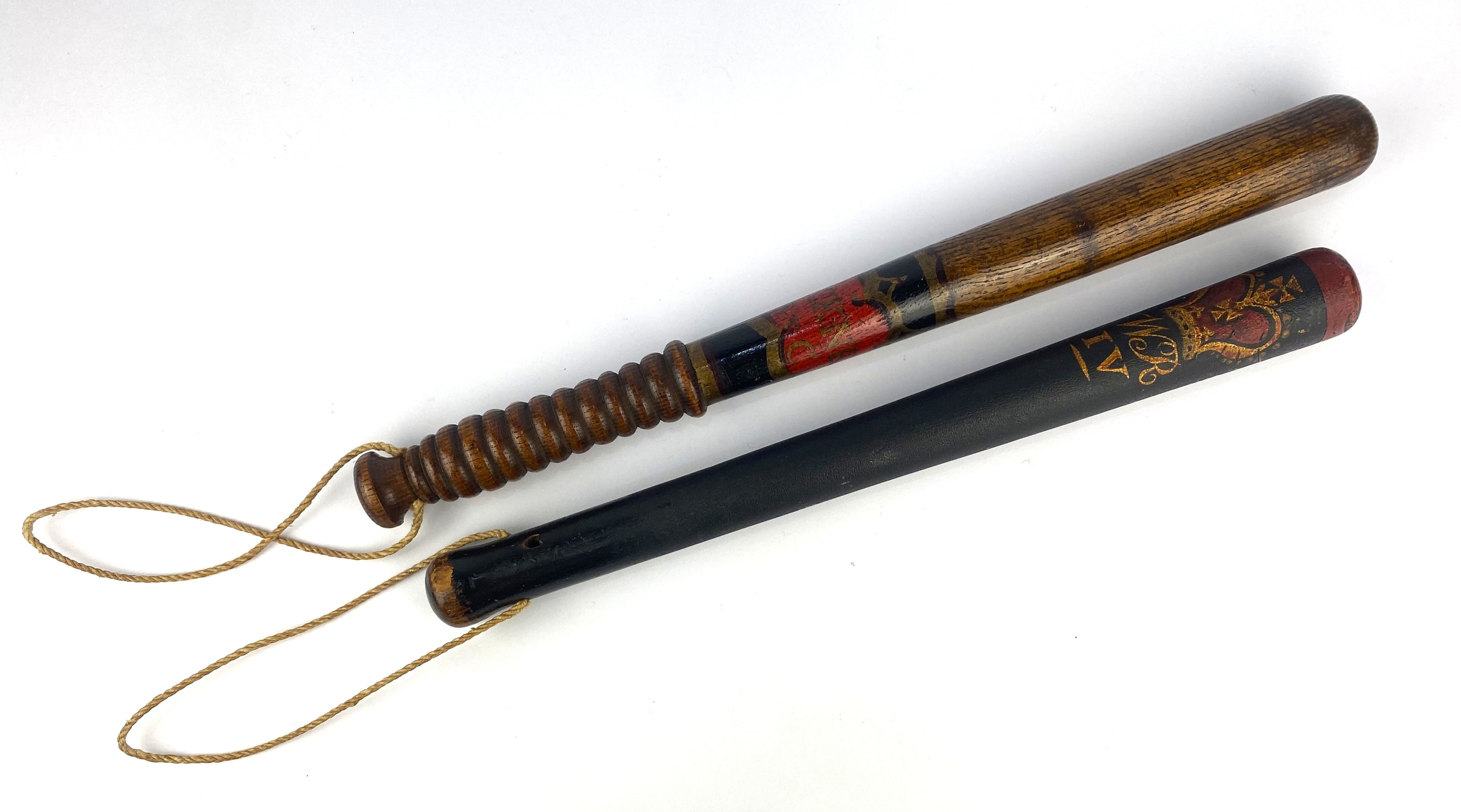 A 19th century Police Special Constables truncheon painted 'Hackney S.C' 43cm long, and a police truncheon painted 'WR IV', 38cm long (a/f)