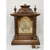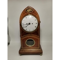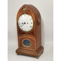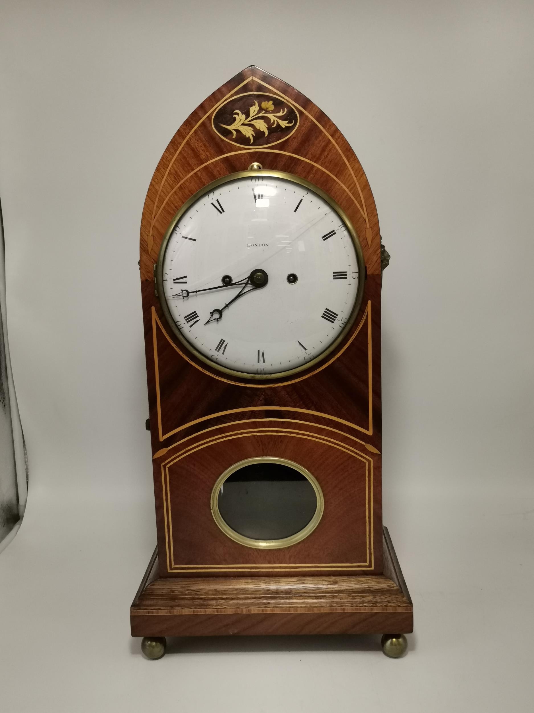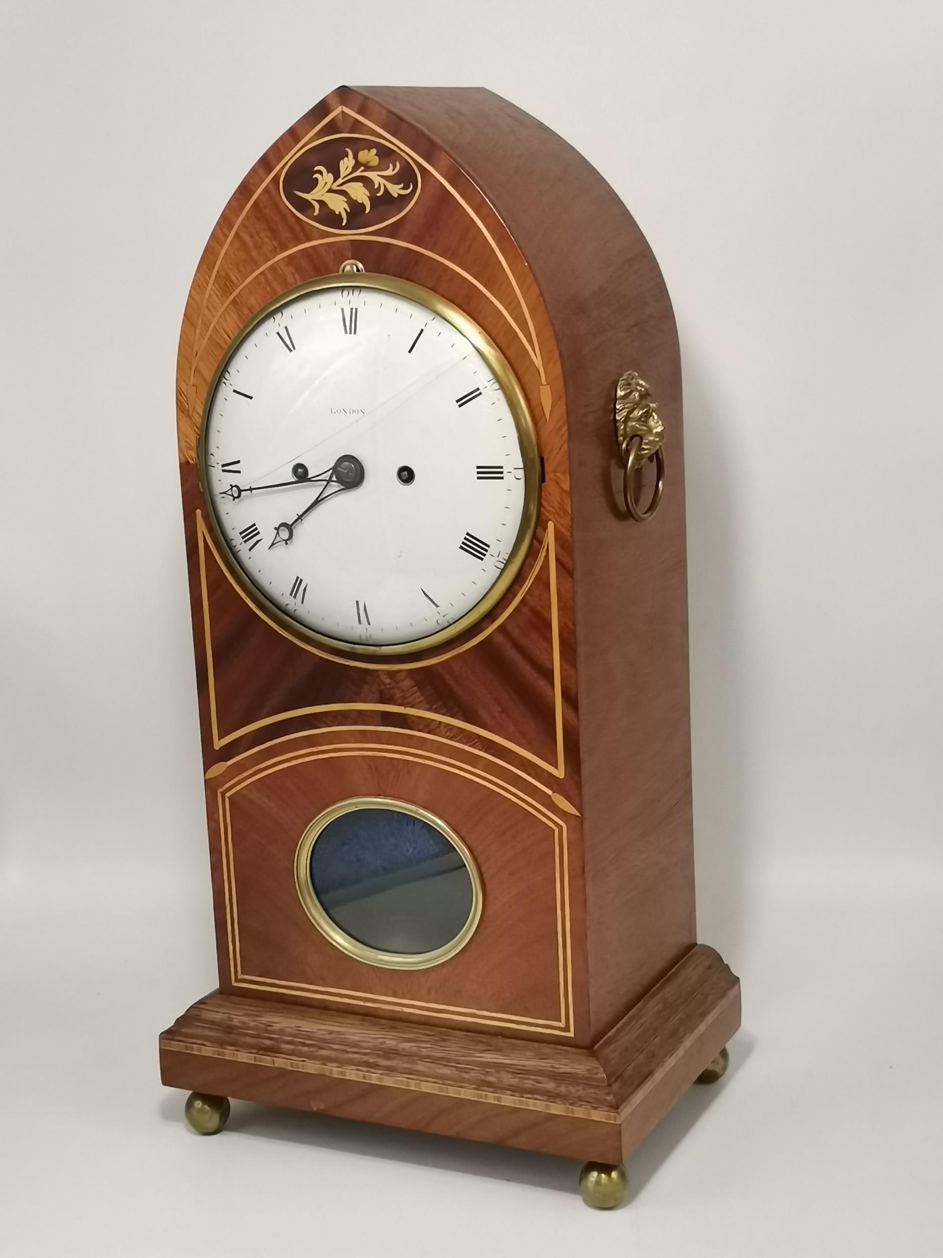 Regency Mahogany Beehive mantel clock with satinwood inlay sat on brass bezel feet and brass lionhead handles to each side. Enamelled white face marked 'London' under a domed glass cover with brass edging. H59cm