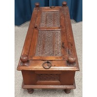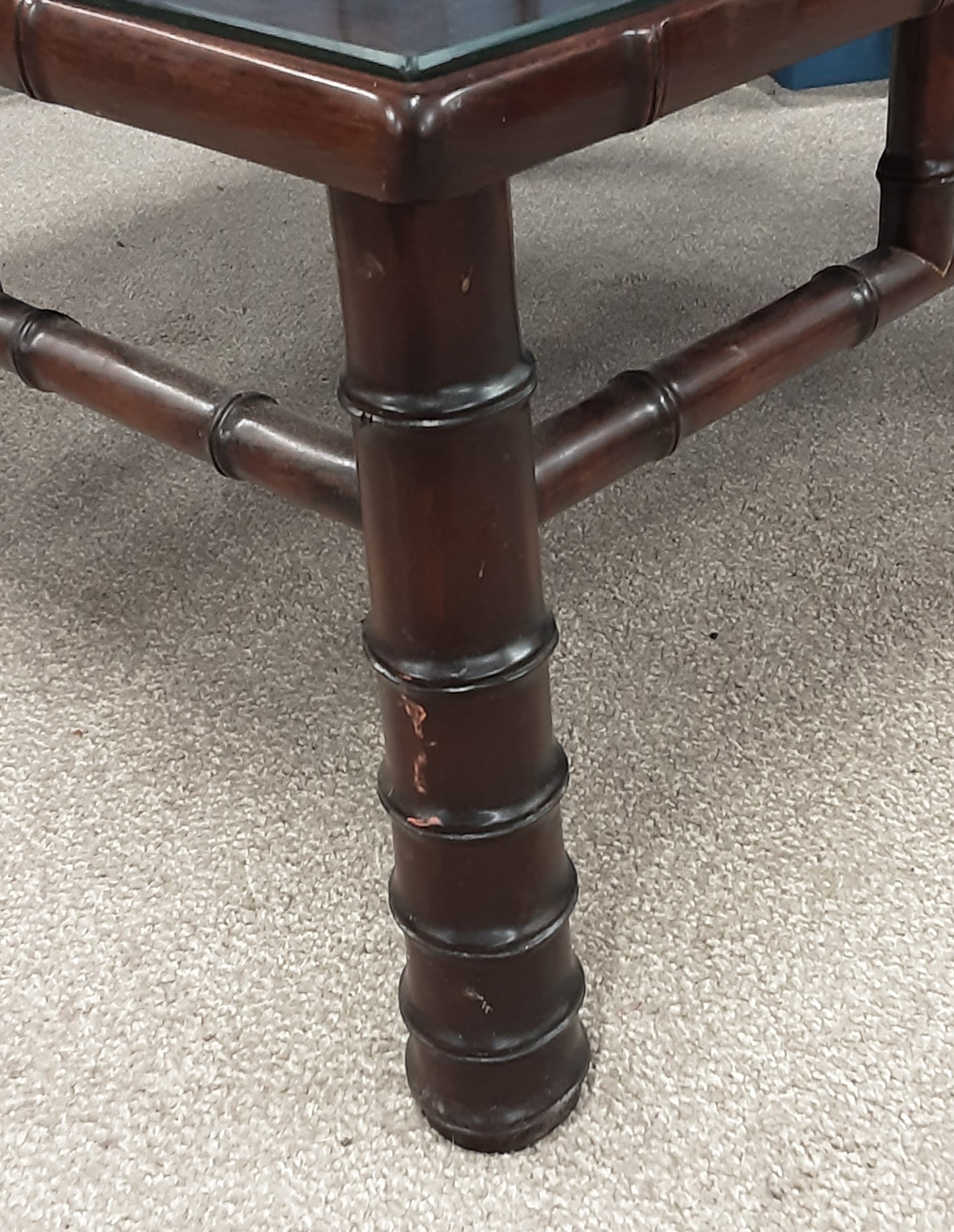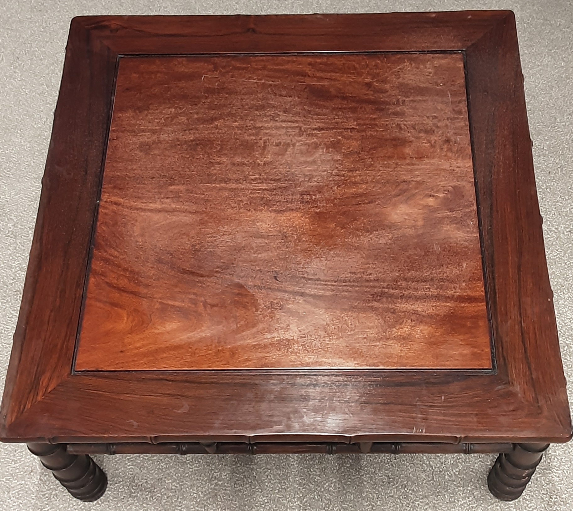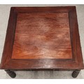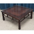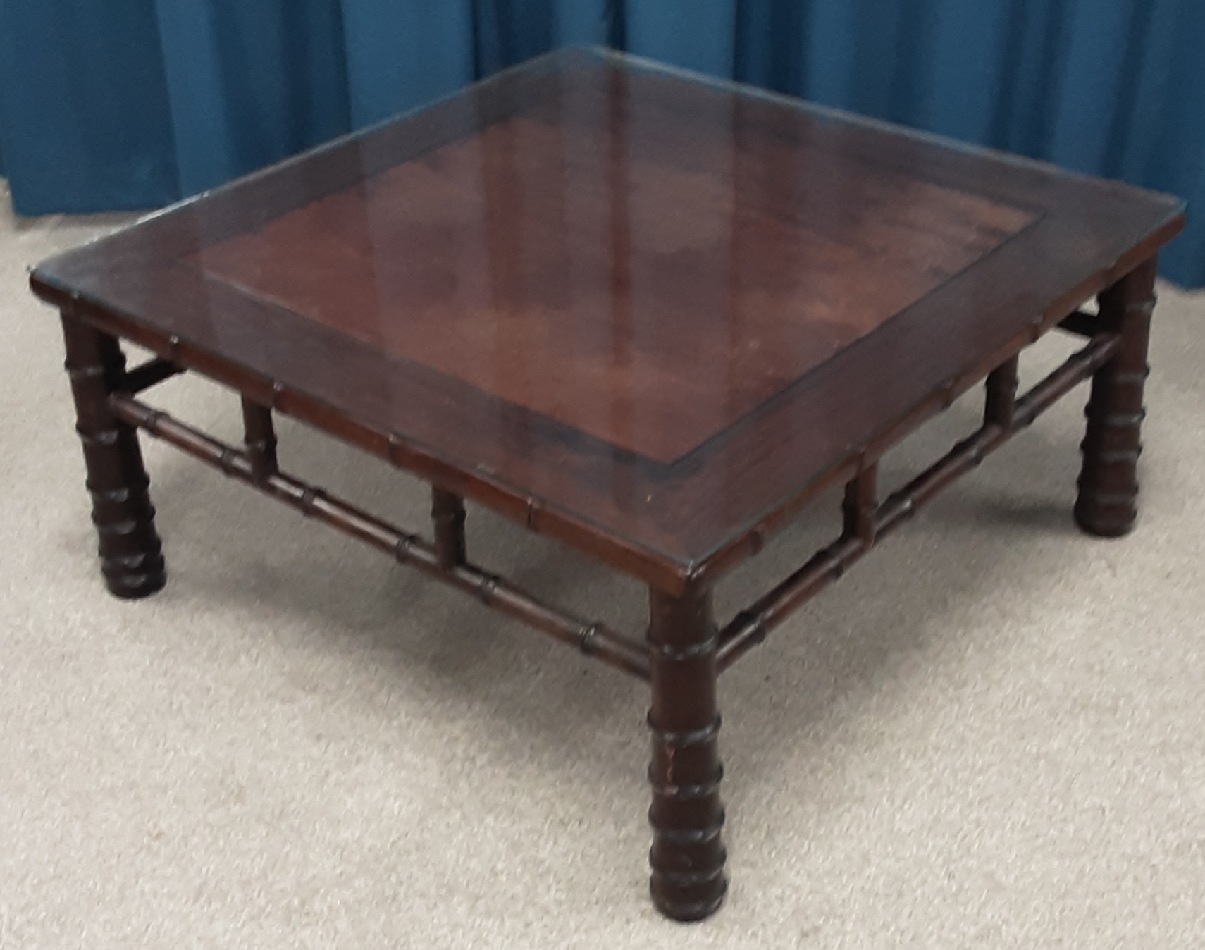 Oriental hardwood coffee table with bamboo style legs with glass cover 83cm by 83cm Ht 39cm
