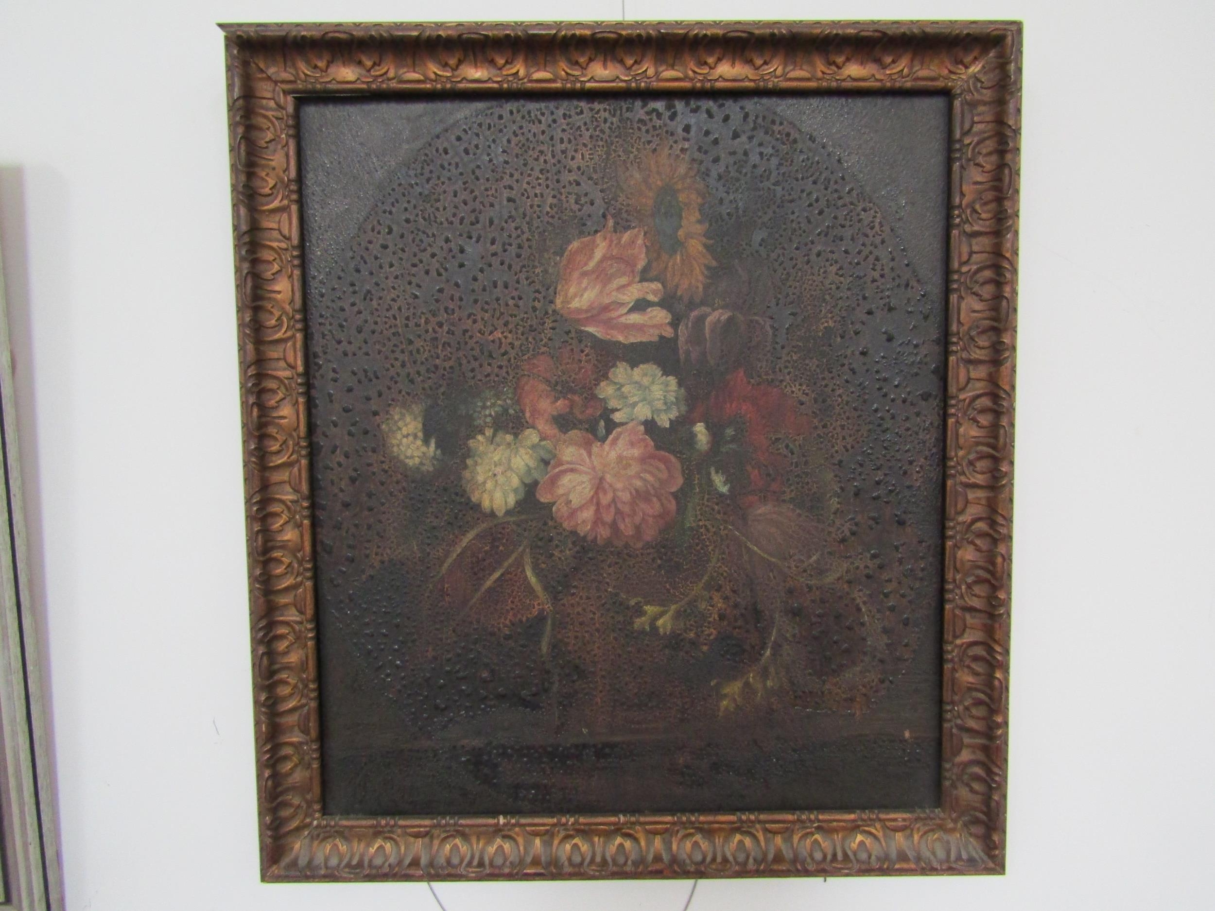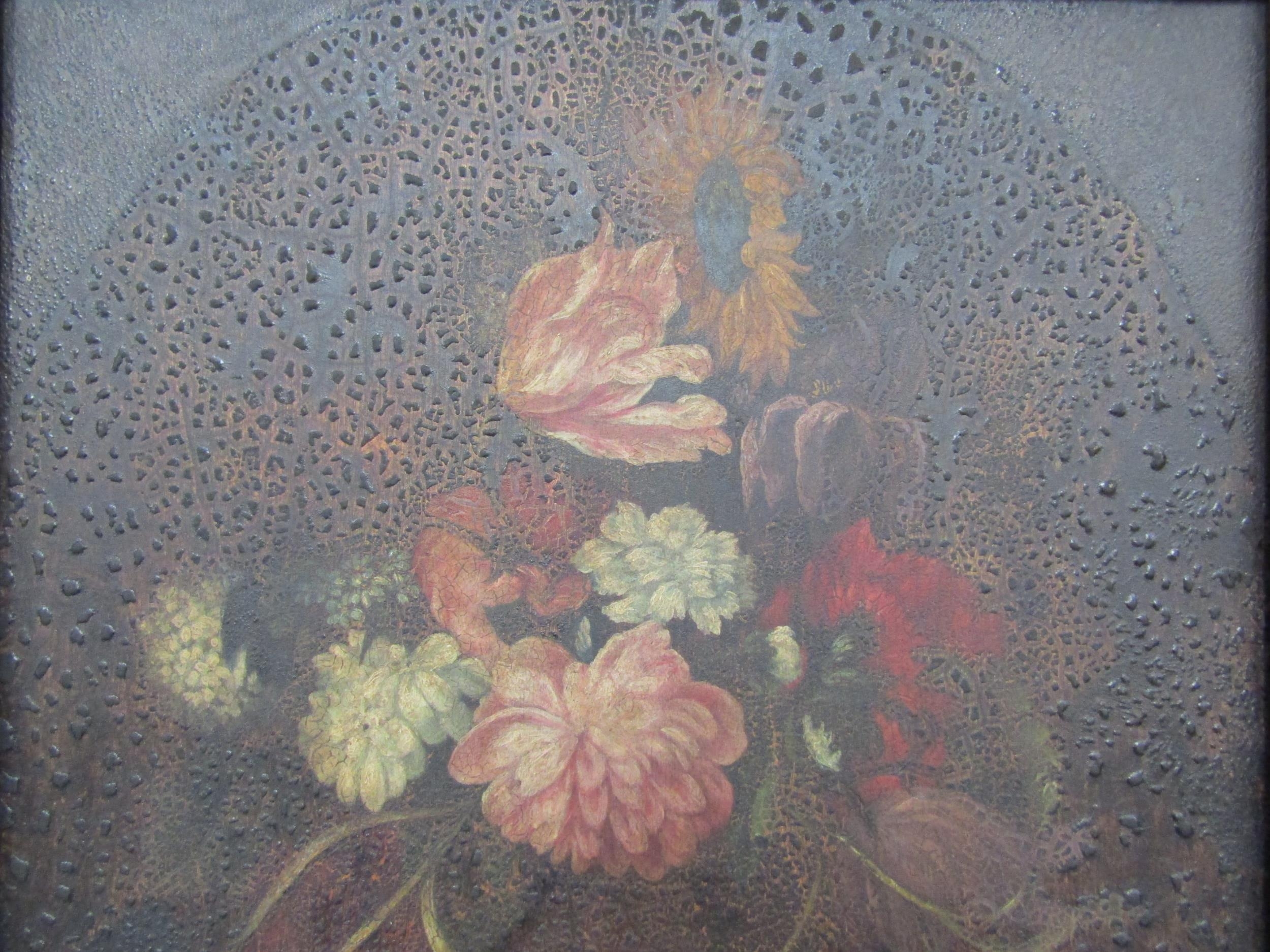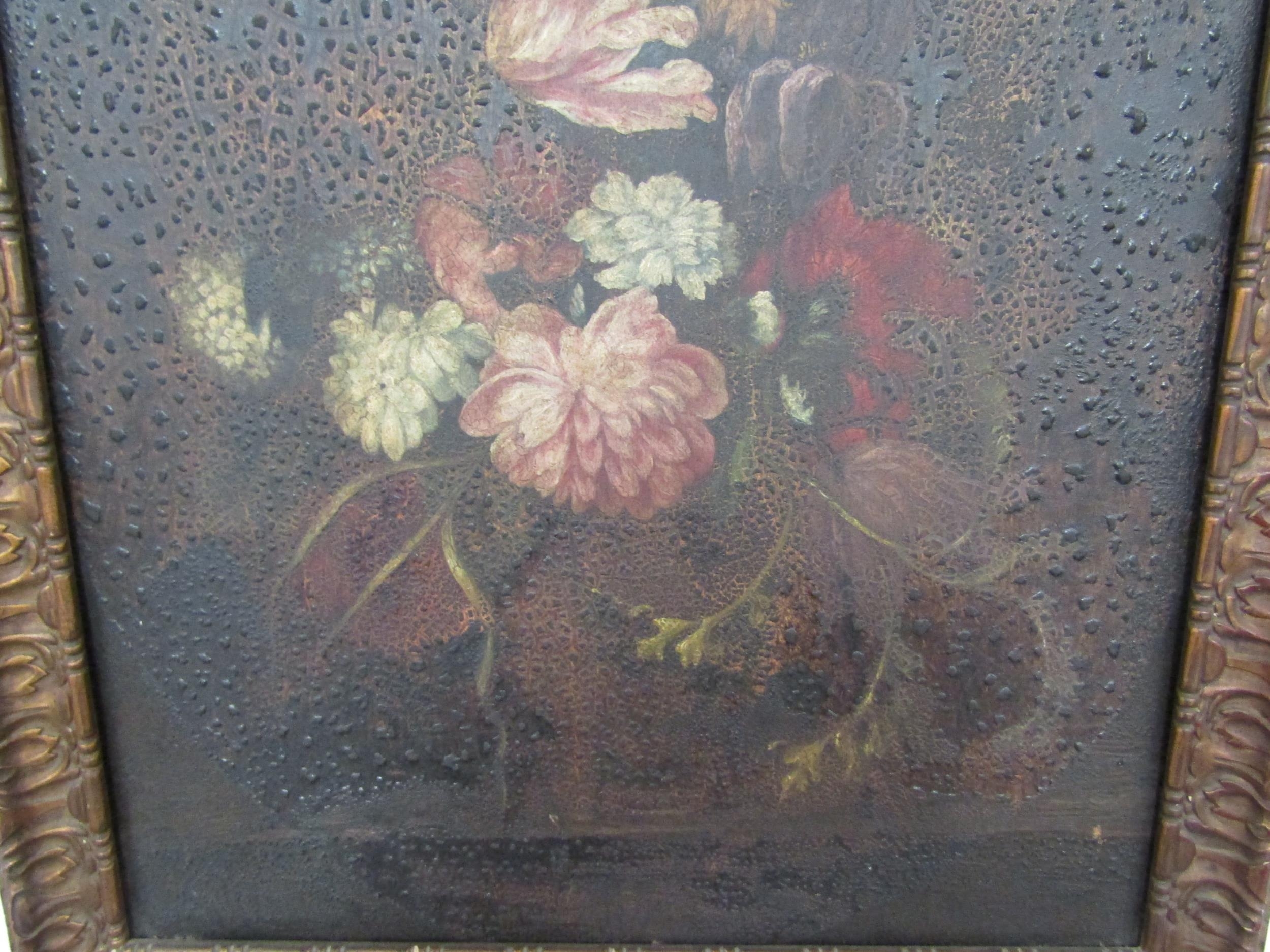 A Dutch oil on board still-life flowers, allover bubbling to varnish/picture, 44cm x 39cm