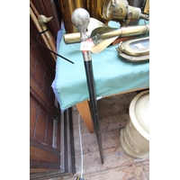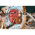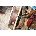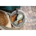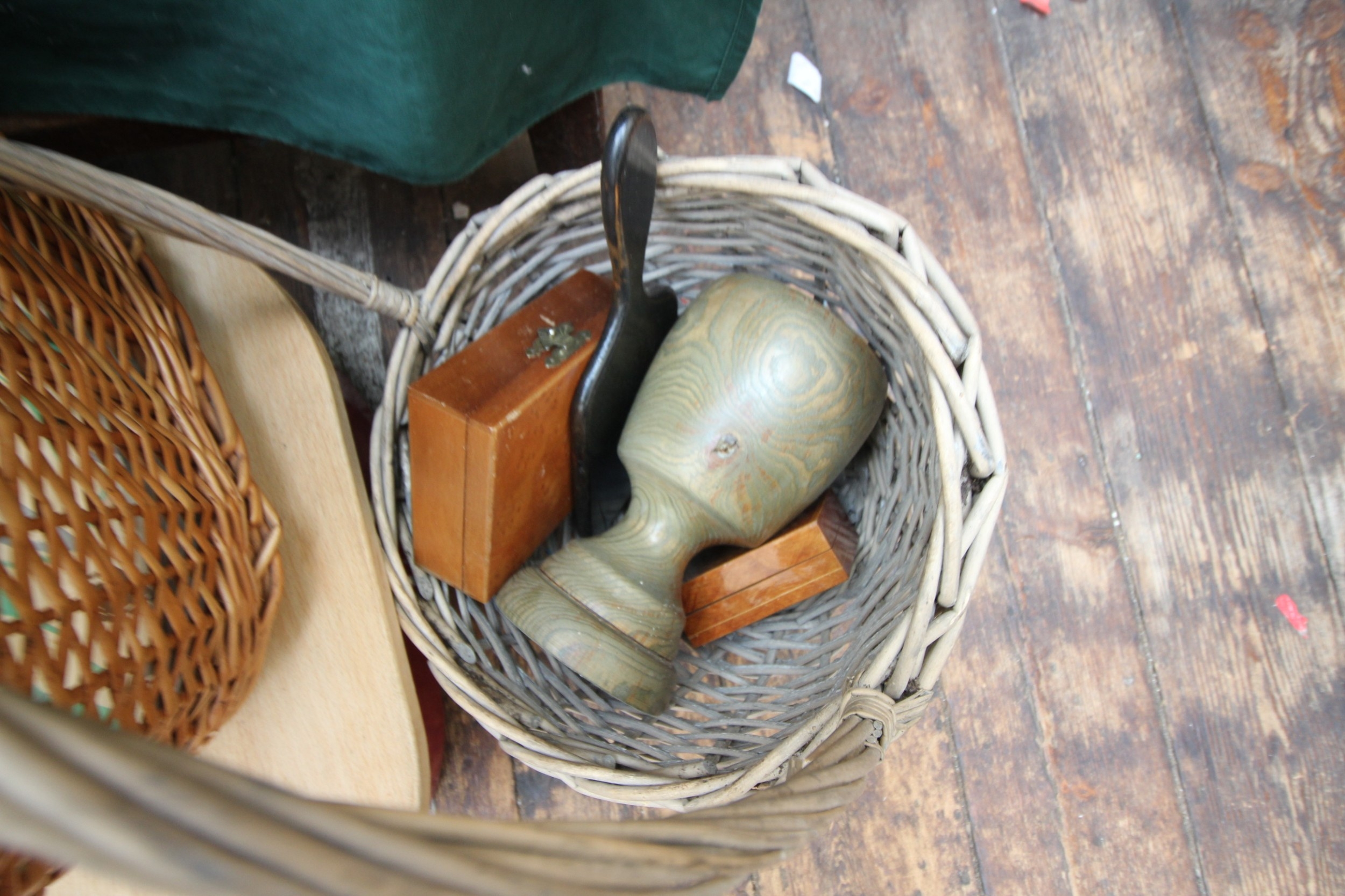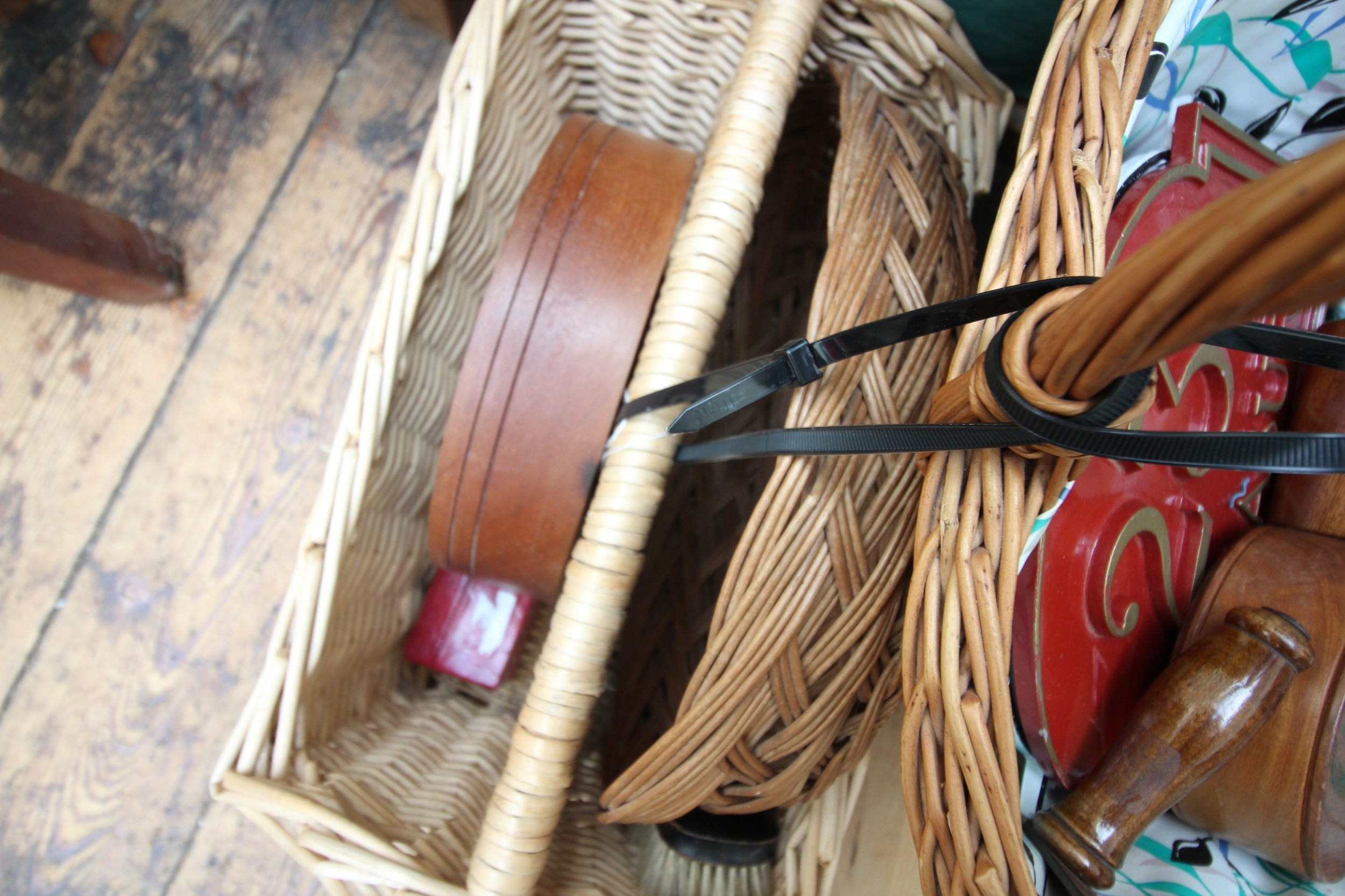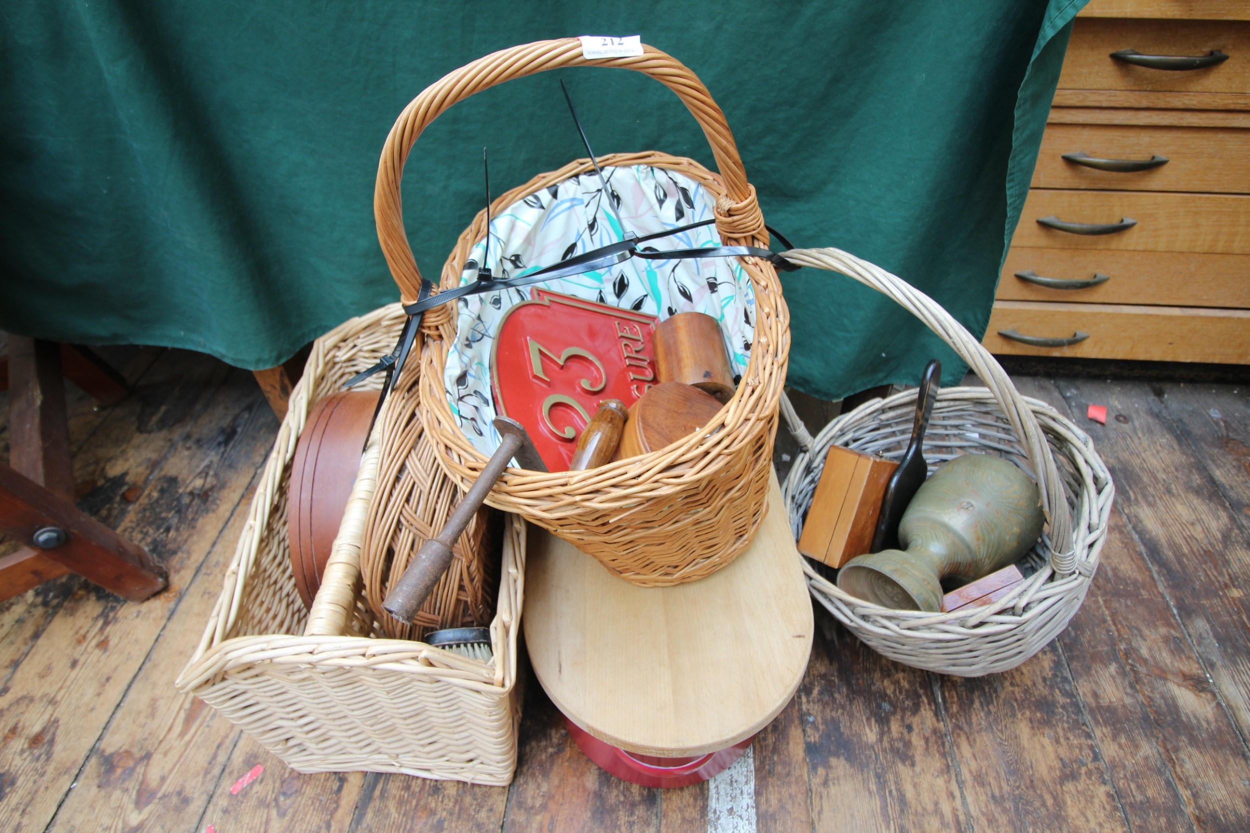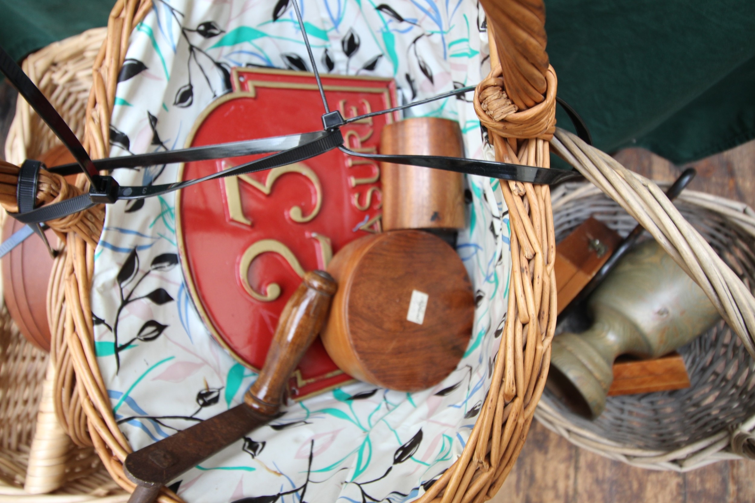 Collection of wooden wicker baskets and other wicker wooden items, metal bread bin and 2 French street signs.