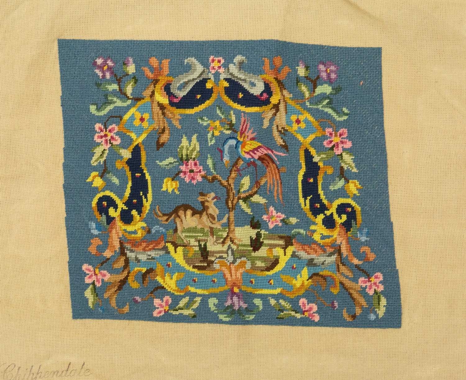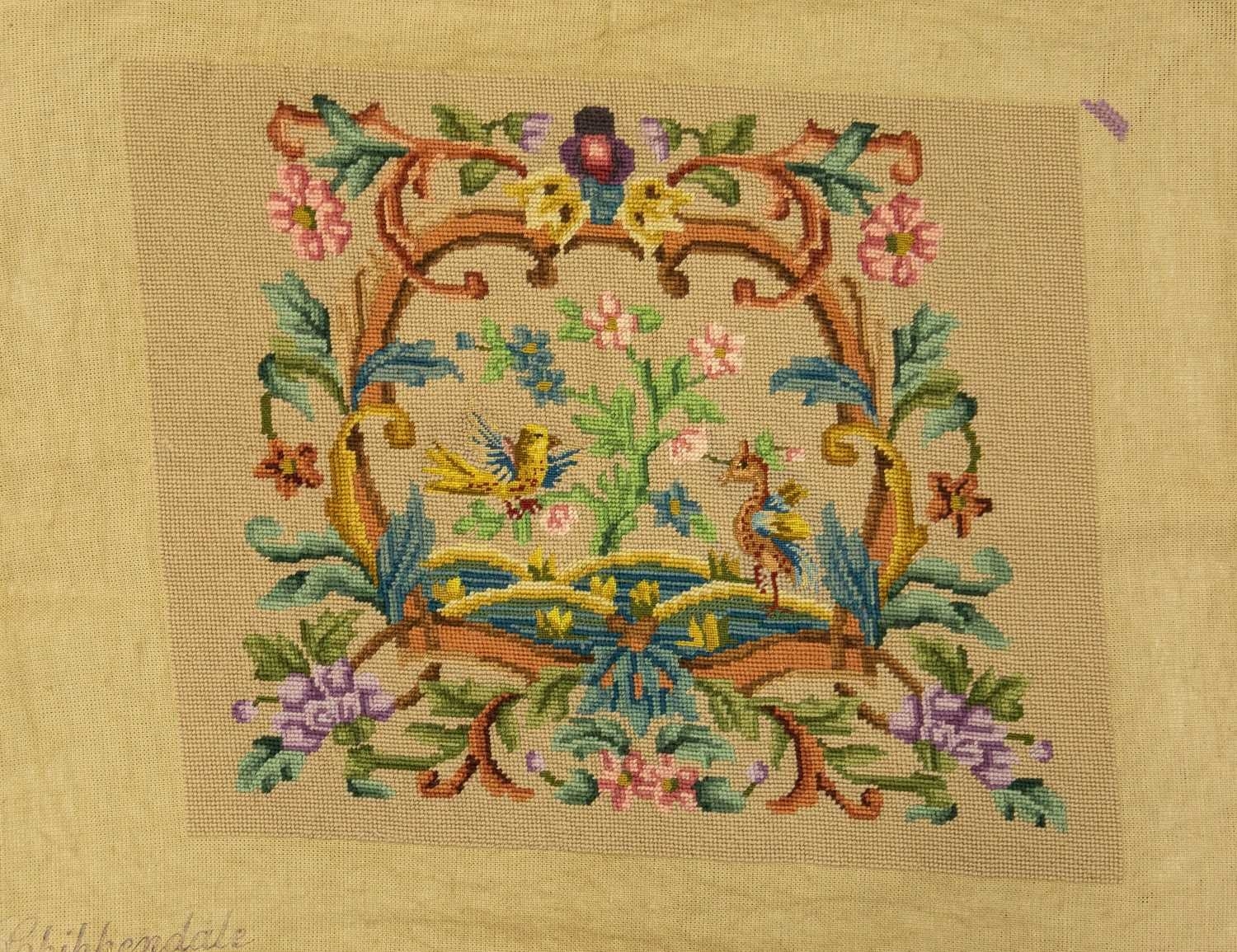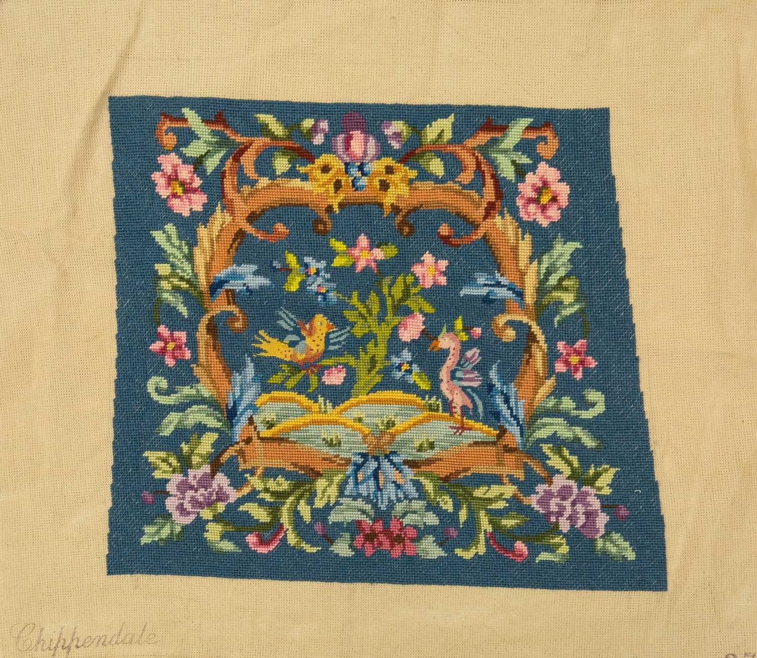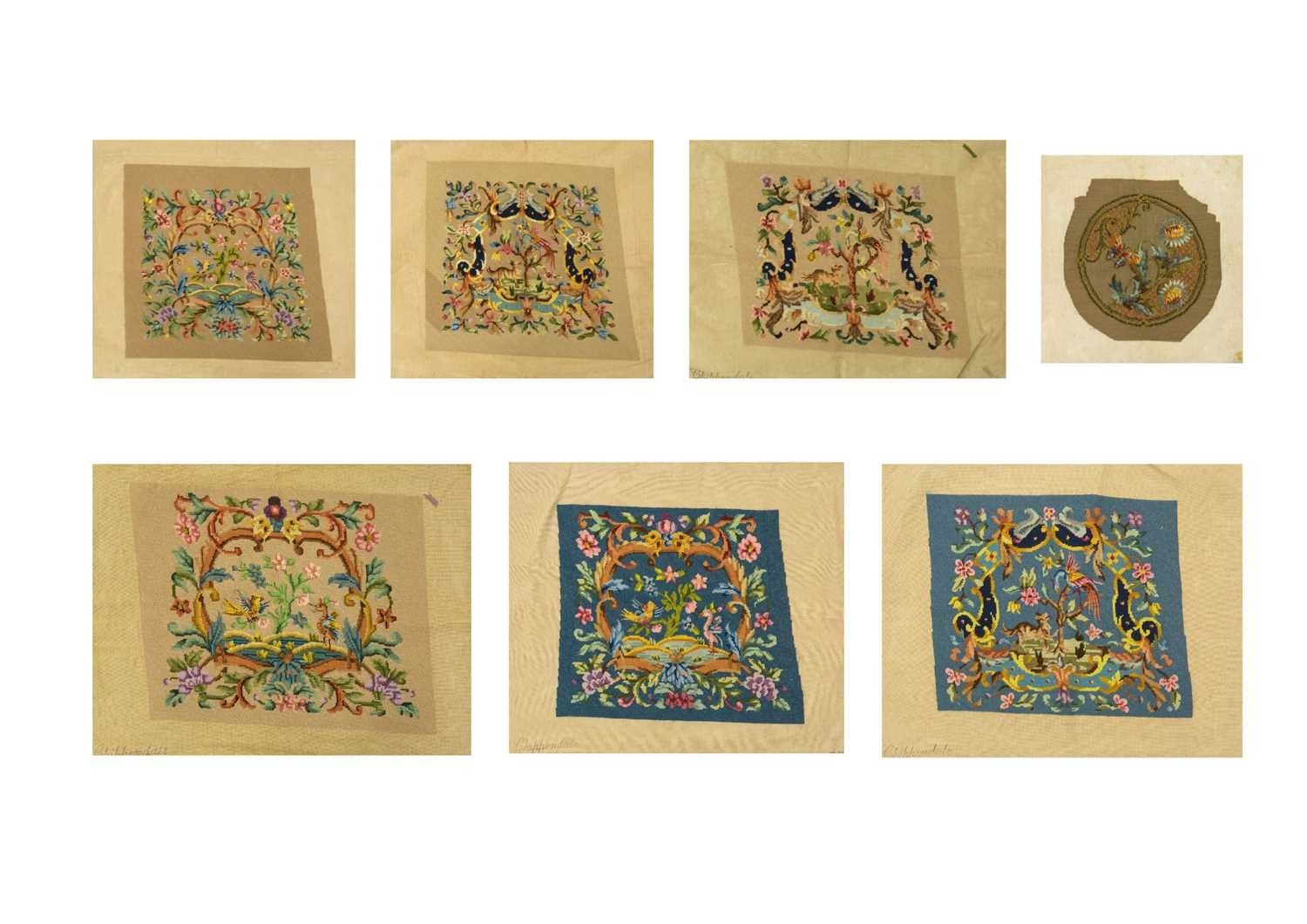 A collection of needlepoint chair covers. Early 20th century, all stamped Chippendale, four with beige ground and two with blue ground, all decorated with animals within a landscape and floral border, with a needlepoint and beadwork circular stool cover depicting flowers and a butterfly (7).