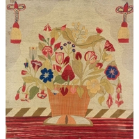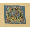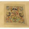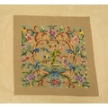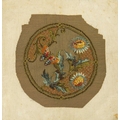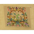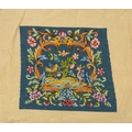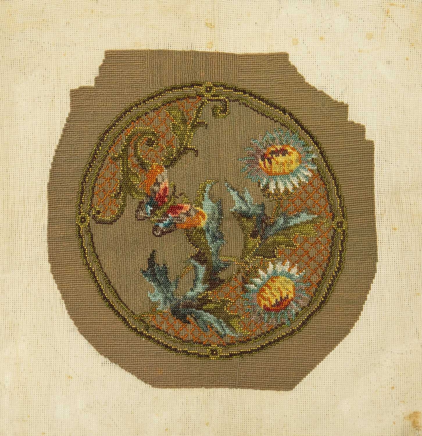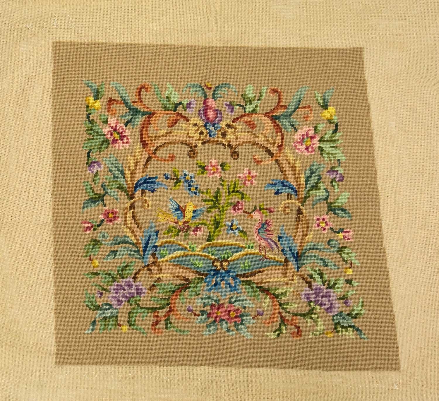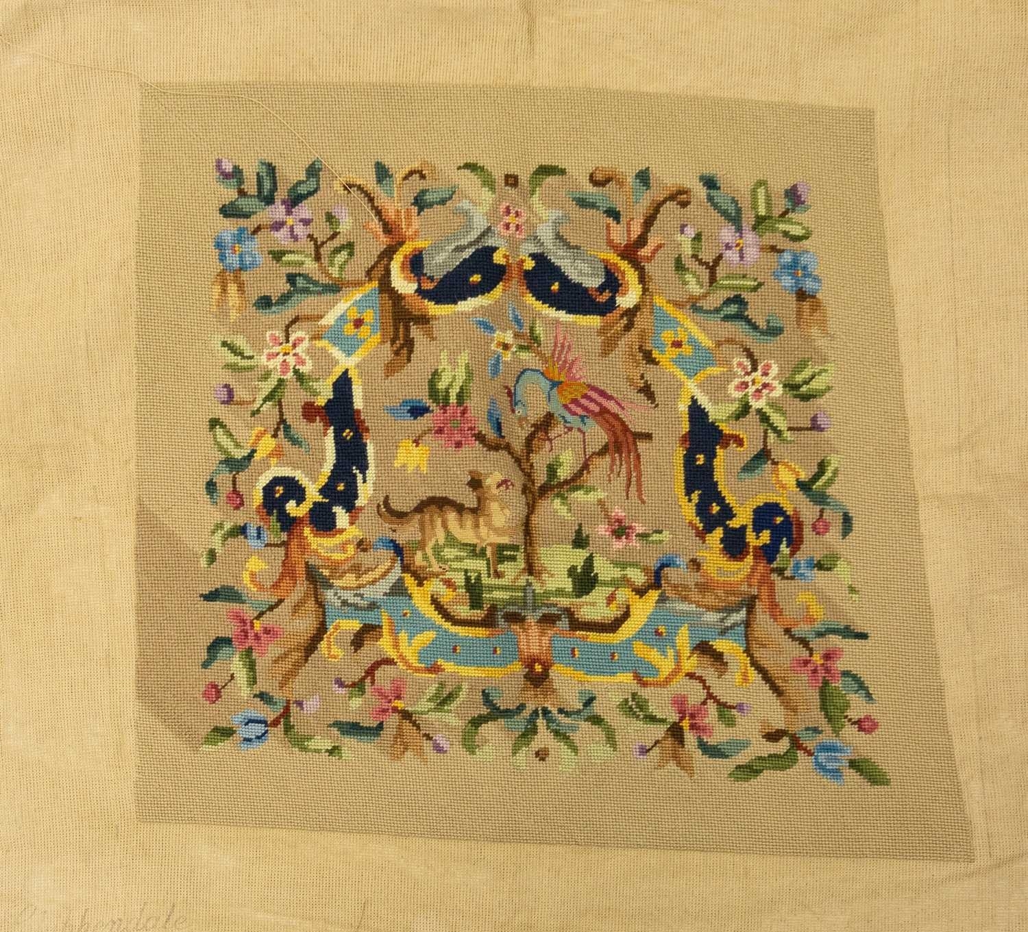 A collection of needlepoint chair covers. Early 20th century, all stamped Chippendale, four with beige ground and two with blue ground, all decorated with animals within a landscape and floral border, with a needlepoint and beadwork circular stool cover depicting flowers and a butterfly (7).