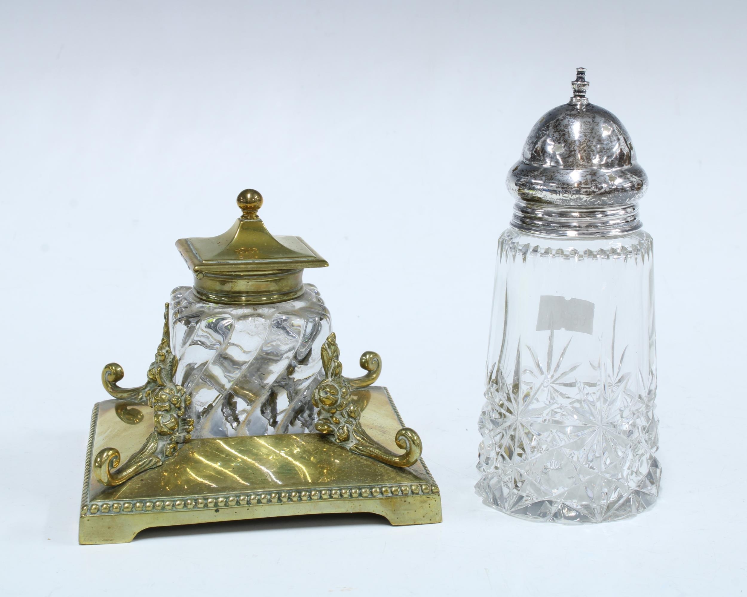 Brass and glass inkwell 11 x10cm, together with a glass sugar caster with a silver lid, London 1923, 13cm (2)