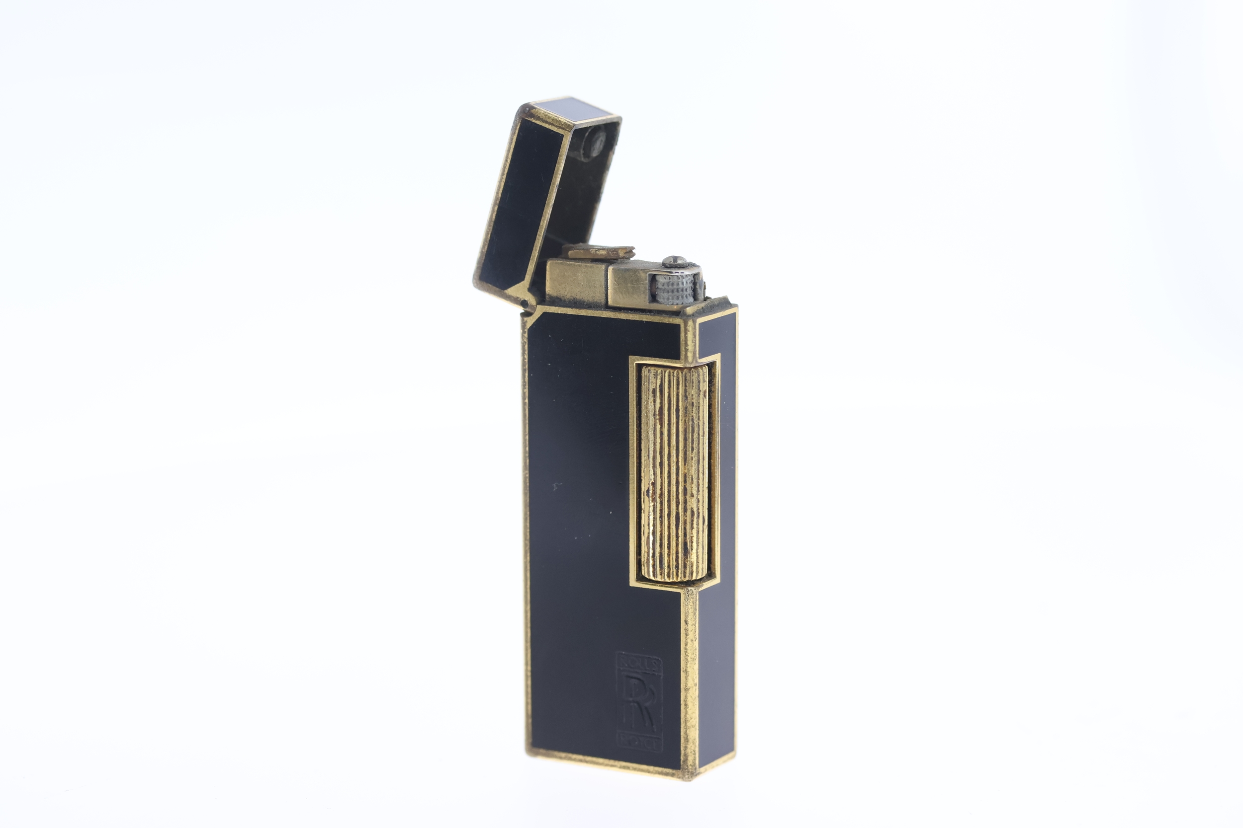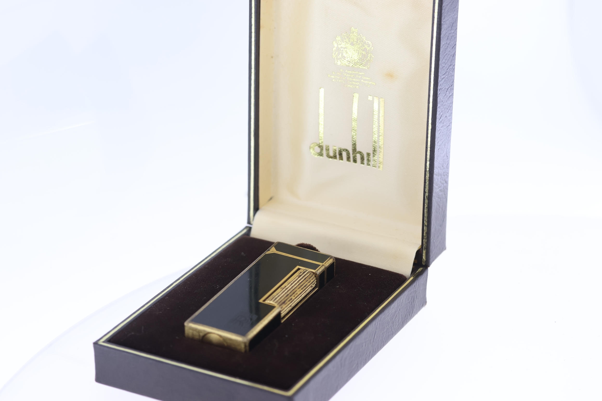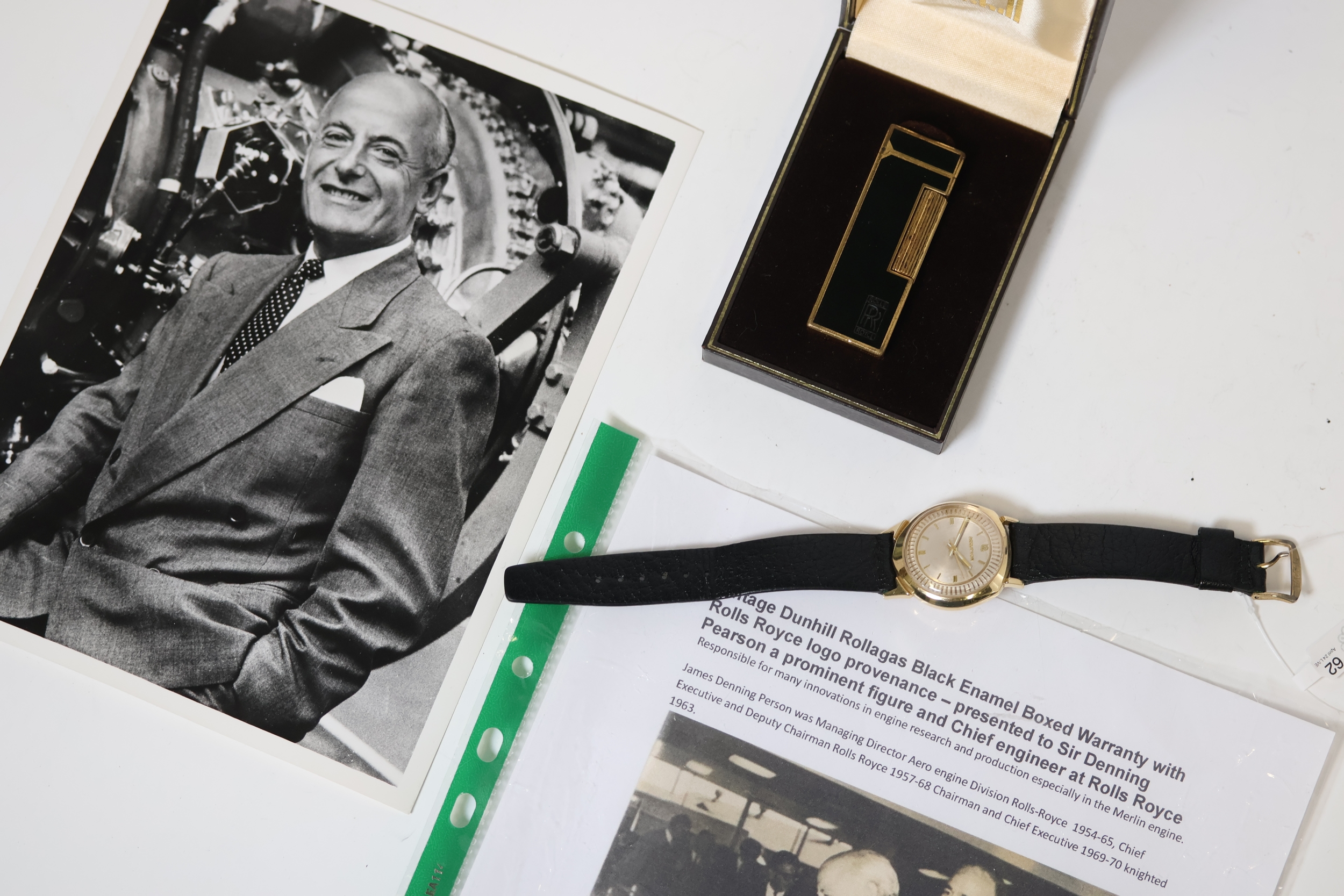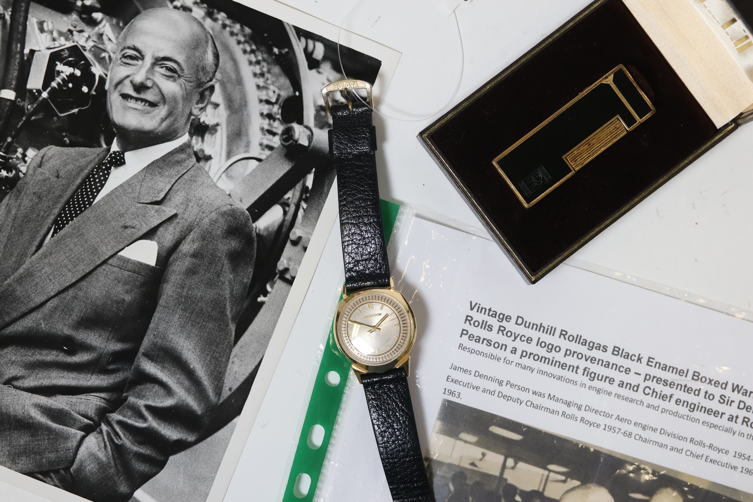 Possessions of Sir Denning Pearson, the Chief Engineer at Rolls Royce. Vintage Dunhill Rollagas Black Enamel Lighter in the original box engraved with the Rolls Royce logo. Comes with the guarantee papers. 2) A 14ct Bulova Accutron prototype, owned also by Sir Denning Pearson. Complimented with a photo of Sir Denning Pearson.