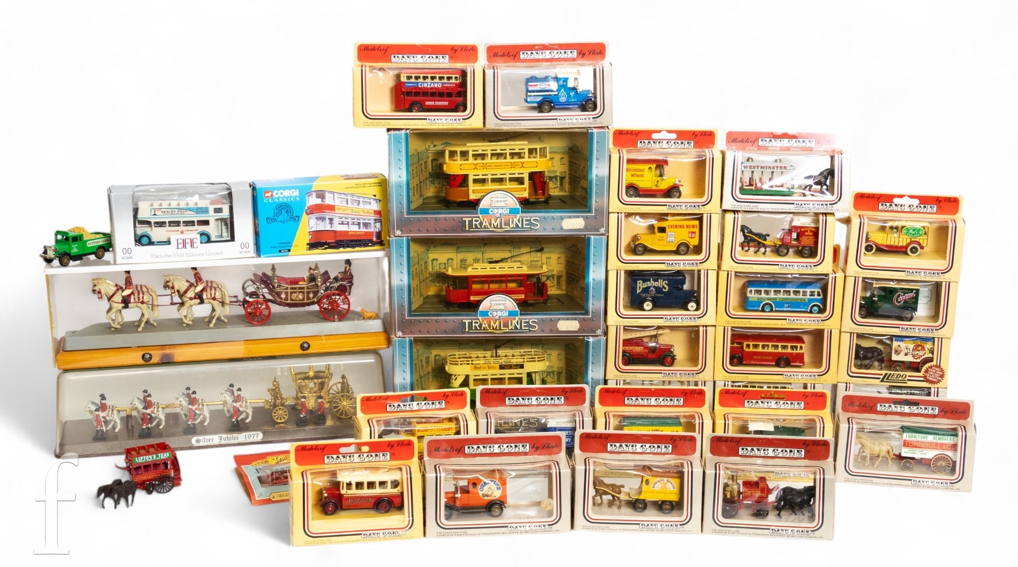 A selection of diecast models including Crescent Toys 1977 Silver Jubilee State Coach and another similar Corgi 1902 State Landau, three Corgi Tramlines, Lledo Days Gone and others, boxed. (qty)