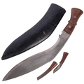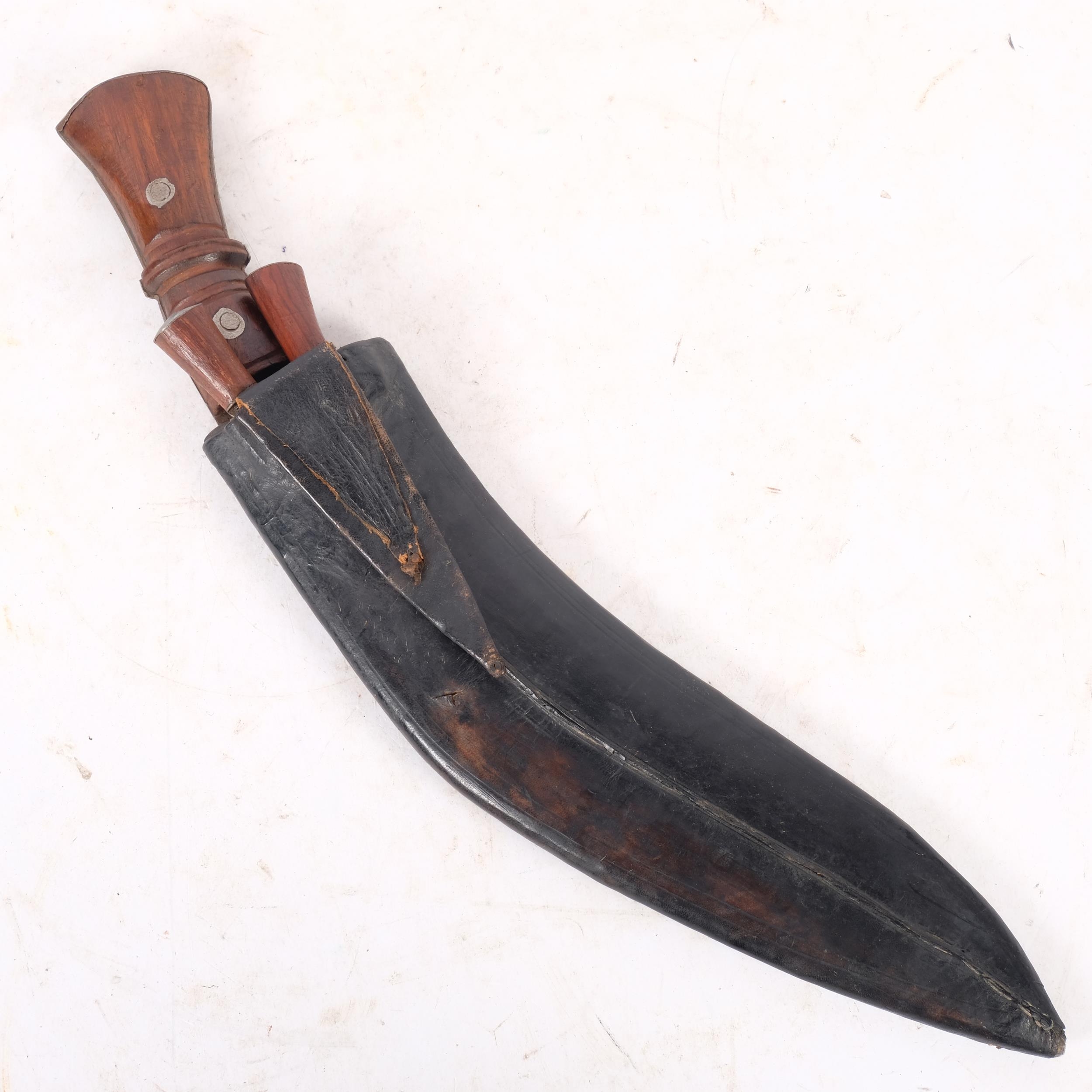 A Vintage Nepalese Khukuri knife, with 2 smaller knives, in fitted leather scabbard