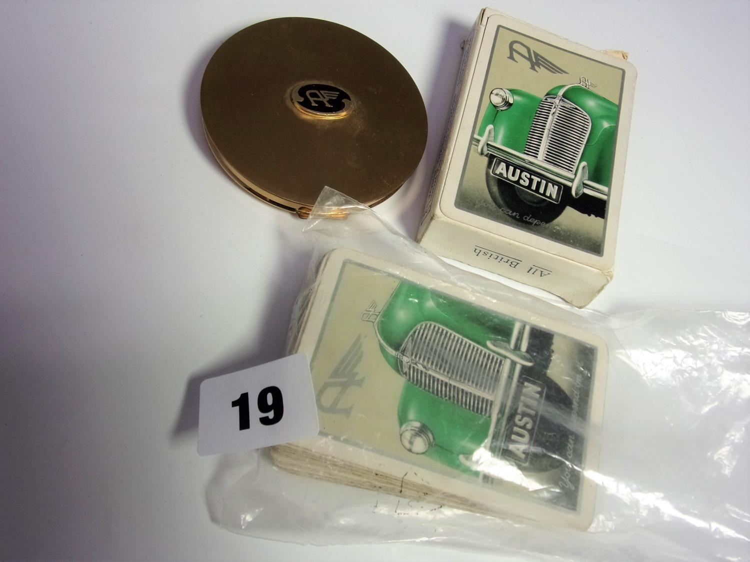 AUSTIN MOTOR CAR MEMORABILIA INCLUDING A LADIES COMPACT BEARING AF LOGO ON THE FRONT TOGETHER WITH SET OF PLAYING CARDS ALL BRITISH