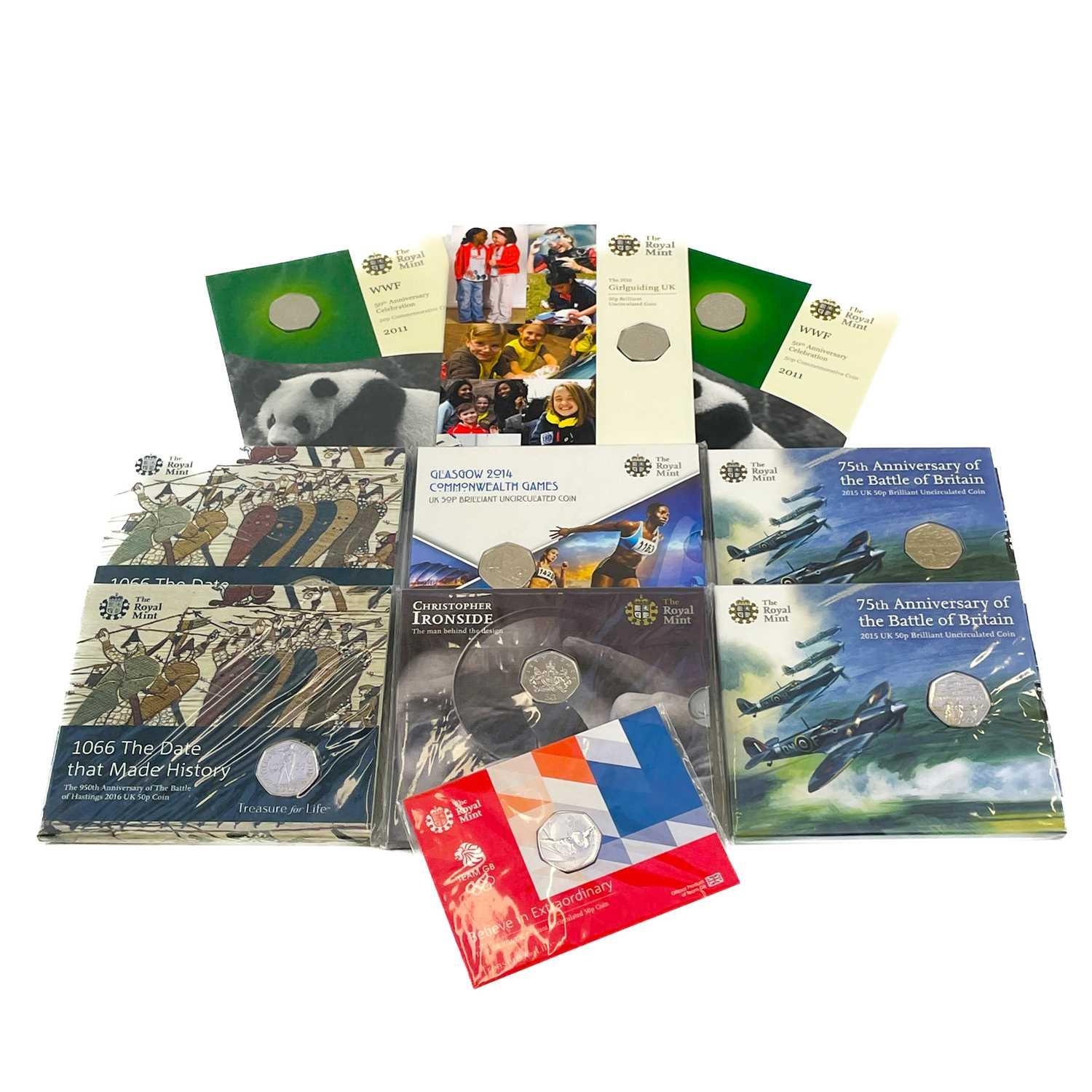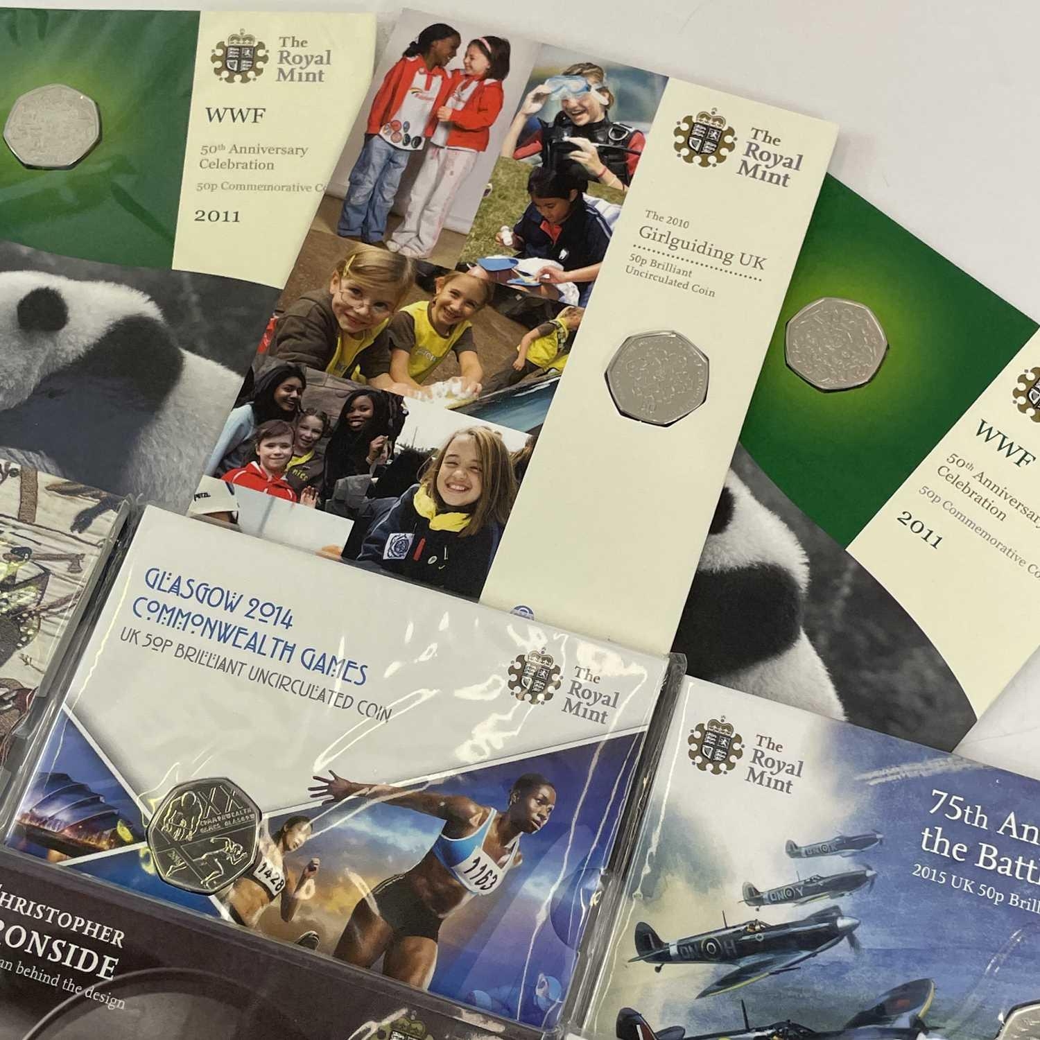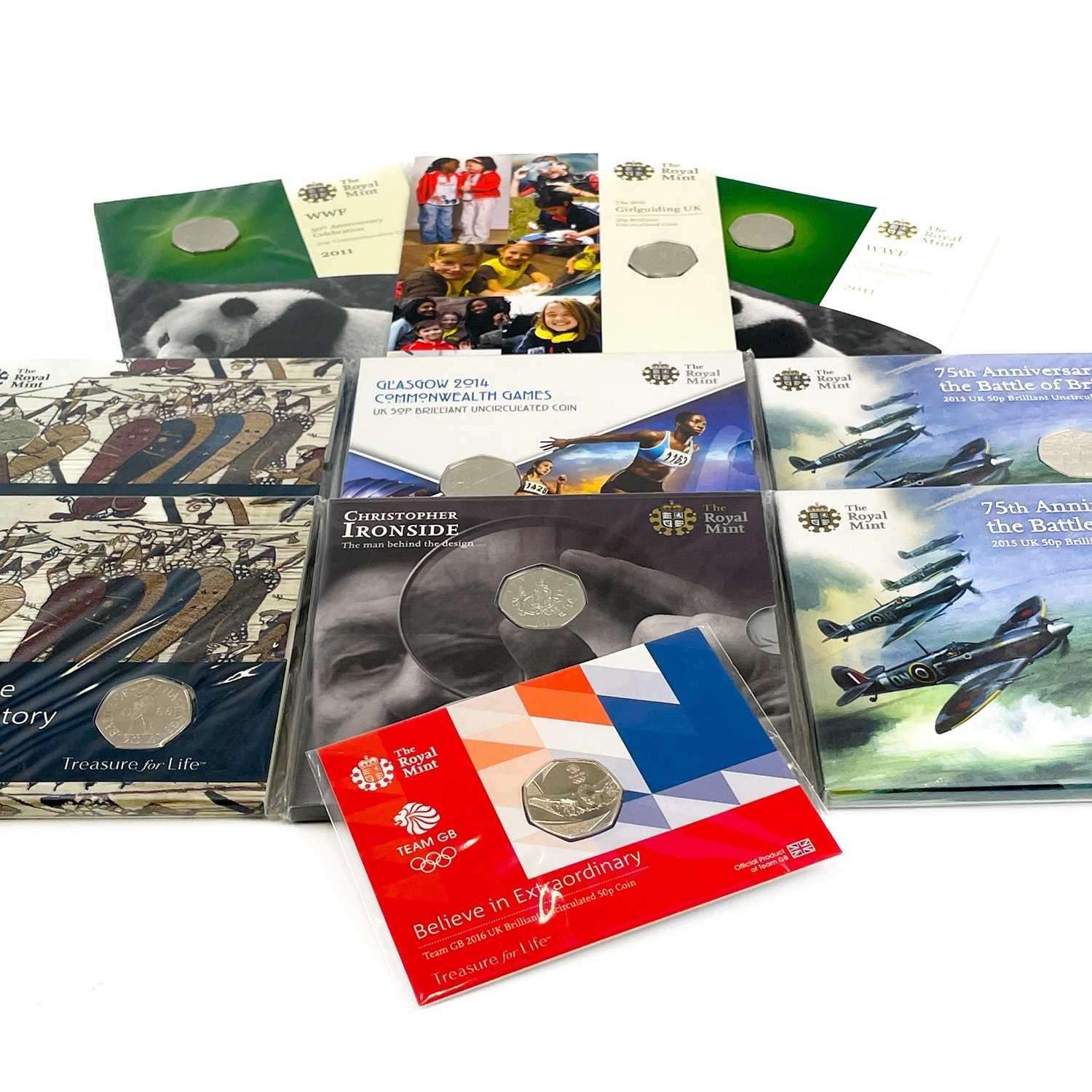 UK 50 pence uncirculated Royal Mint packaged coins 2010 to 2016 (x10). Comprising: 1: 2010 Girlguiding 2: 2011 WWF 50th anniversary (x2) 3: 2013 Christopher Ironside. 4: 2014 Glasgow Commonwealth Games. 5: 2015 75th anniversary of Battle of Britain (x2) 6: 2016 Battle of Hastings (x2) 7: 2016 Team GB Believe in Extraordinary.