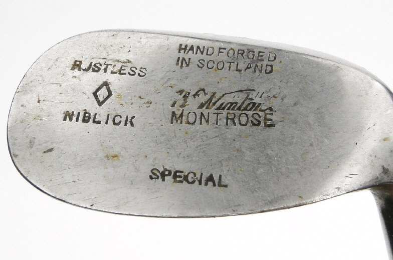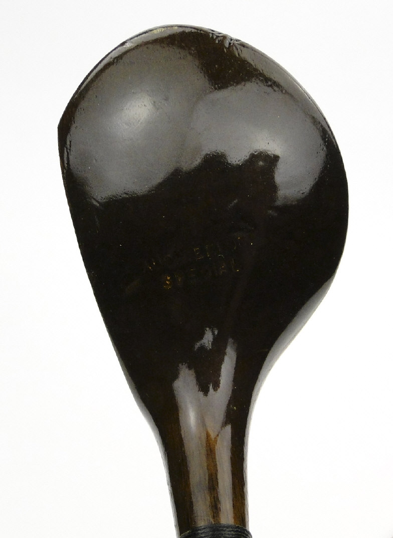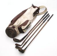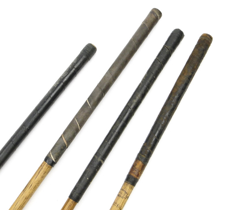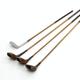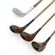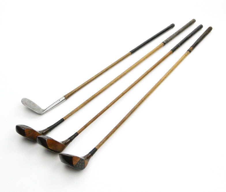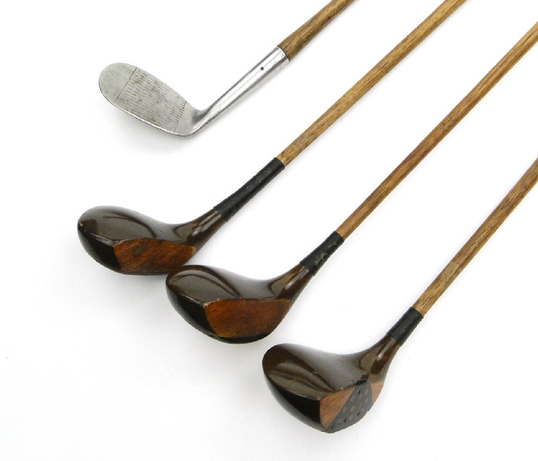 Four vintage wooden shafted golf clubs - three woods and an iron