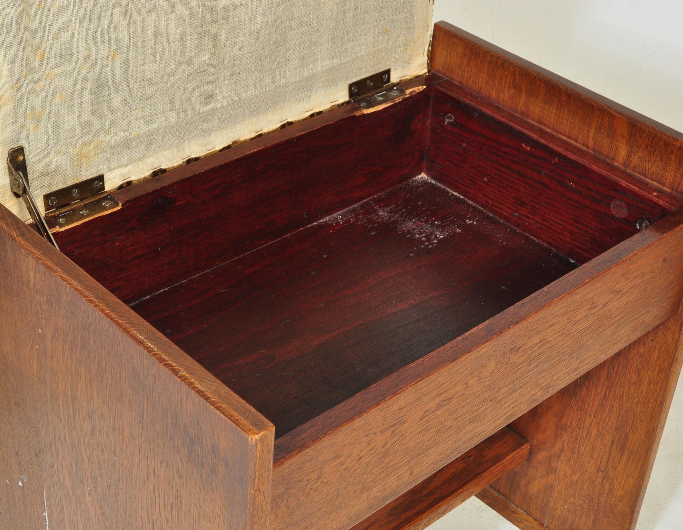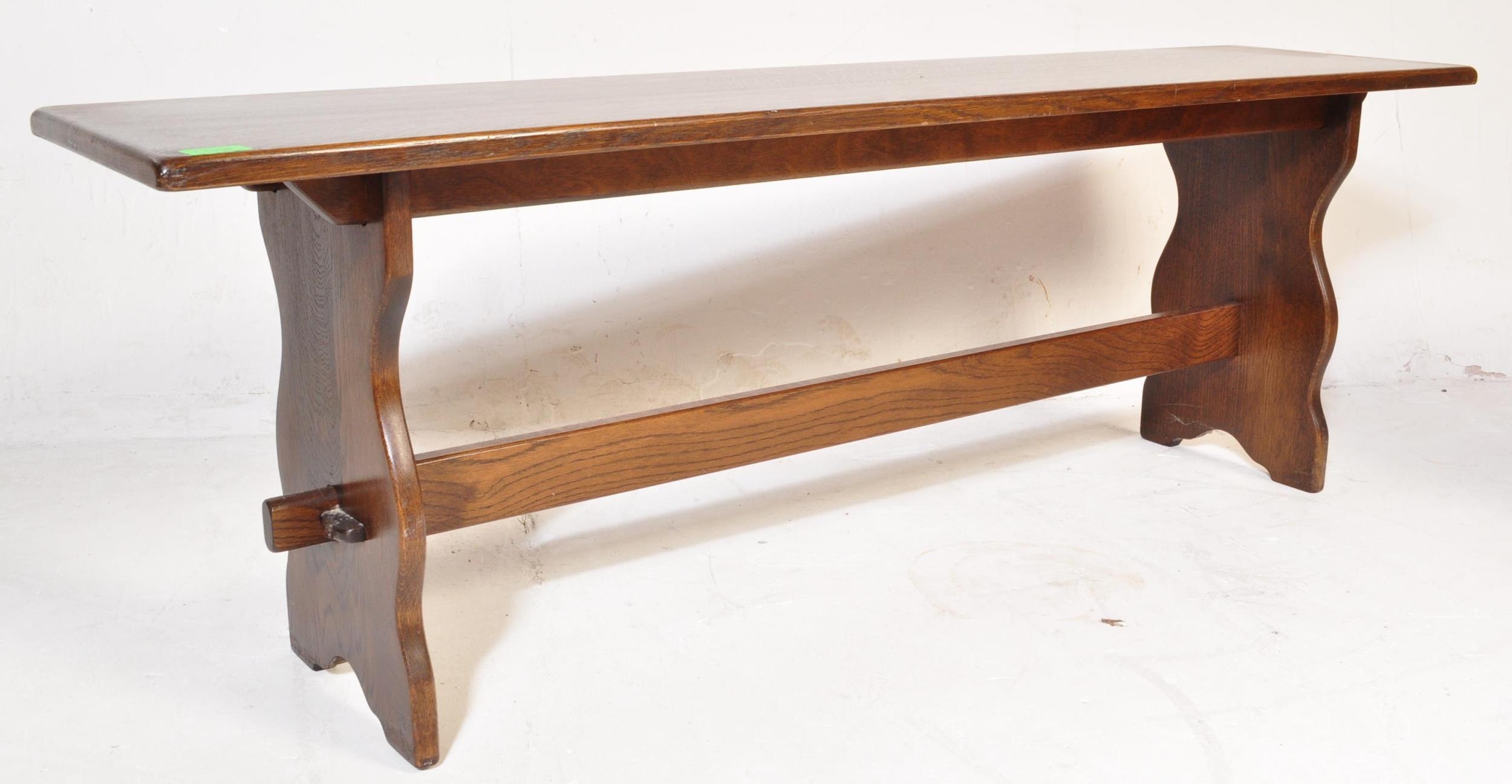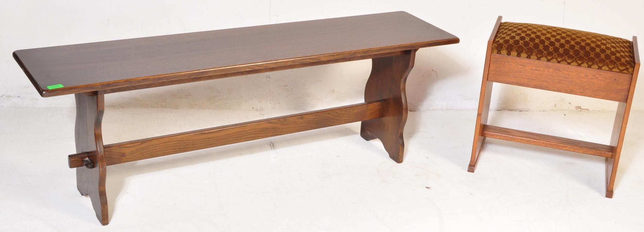 Wood Bros - Old Charm Furniture - 20th Jacobean revival oak bench seat raised on shaped legs with stretcher having plank seat and tapestry upholstered cushion. Together with a golden oak stool - piano stool seat