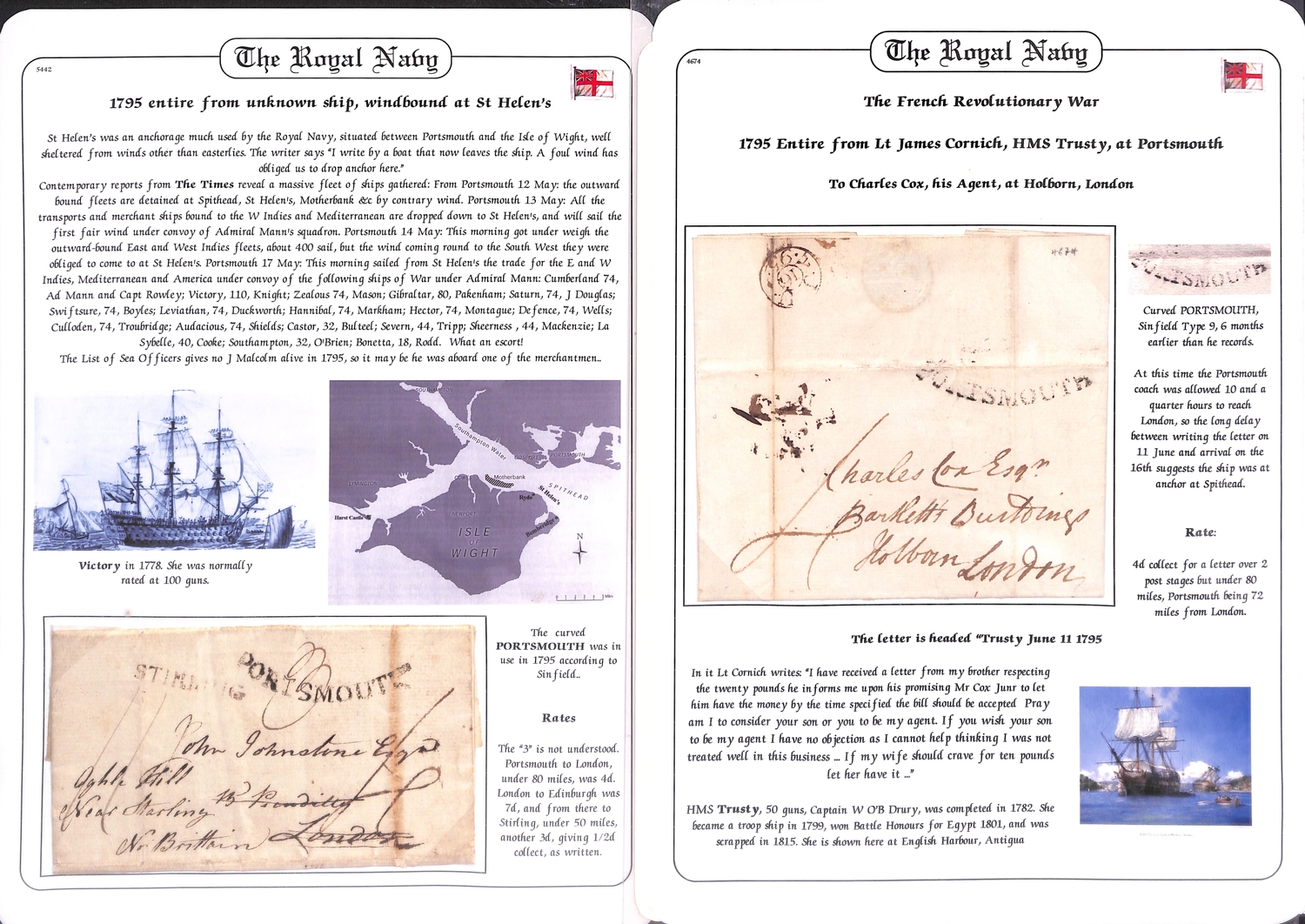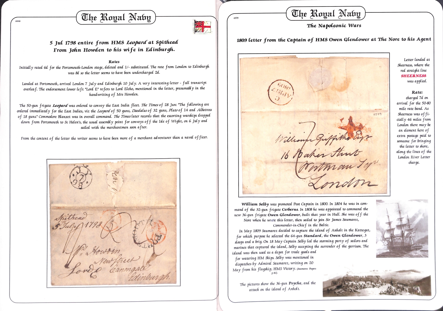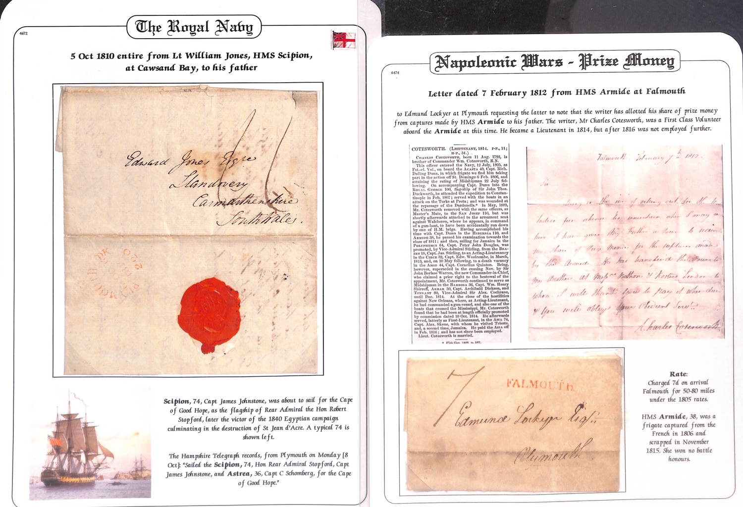 1795-1812 Entire letters from naval ships, all posted at British ports, comprising 1795 (May 14) letter from an unknown ship windbound at St. Helens posted at Portsmouth; 1795 (June 11) letter from Lt. James Cornich on H.M.S "Trusty" posted at Portsmouth; 1798 (July 5) letter from H.M.S "Leopard" at Spithead posted at Portsmouth; 1809 (Apr. 16) letter from Capt. William Selby of H.M.S "Owen Glendower" at The Nore posted at Sheerness; 1810 (Oct. 5) letter from Lt. Williams Jones on H.M.S "Scipion" at Cawsand Bay posted at Plymouth Dock; 1812 (Feb 7) letter from Lt. Edmund Lockyer on H.M.S "Armide" concerning prize money posted at Falmouth. (6).