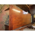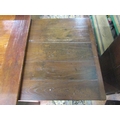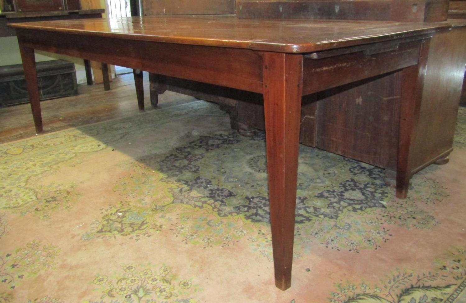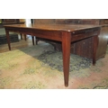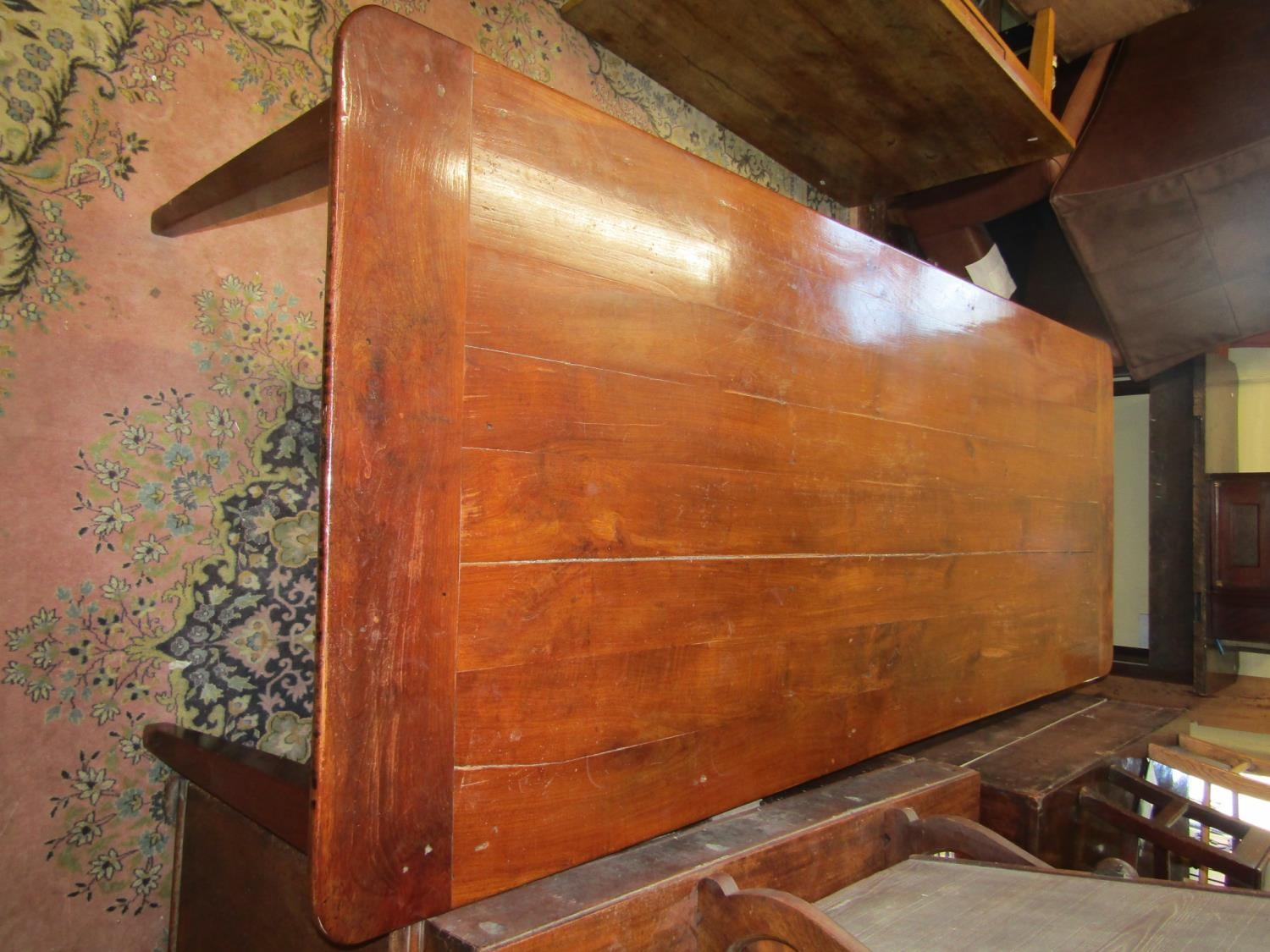 A good quality French provincial cherry wood dining table with plank top, raised on four square cut supports, with single frieze drawer, the plank top with cleated ends, 250cm x 97cm, to seat 8/10
