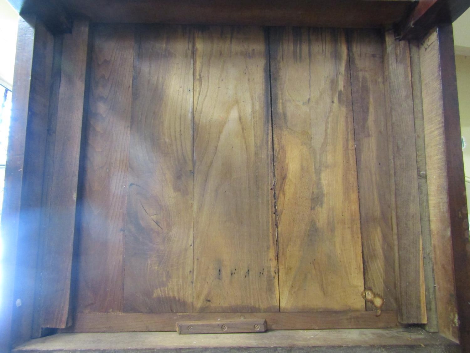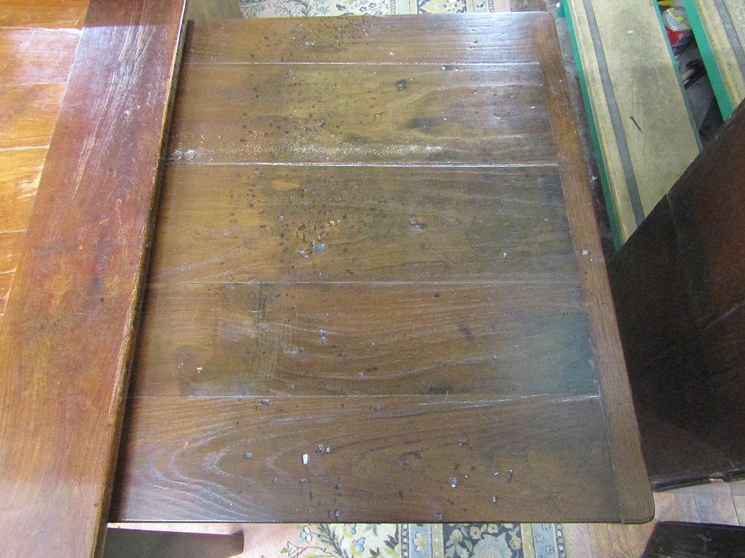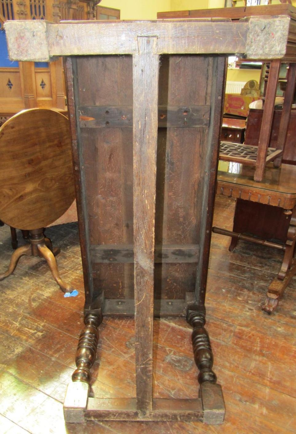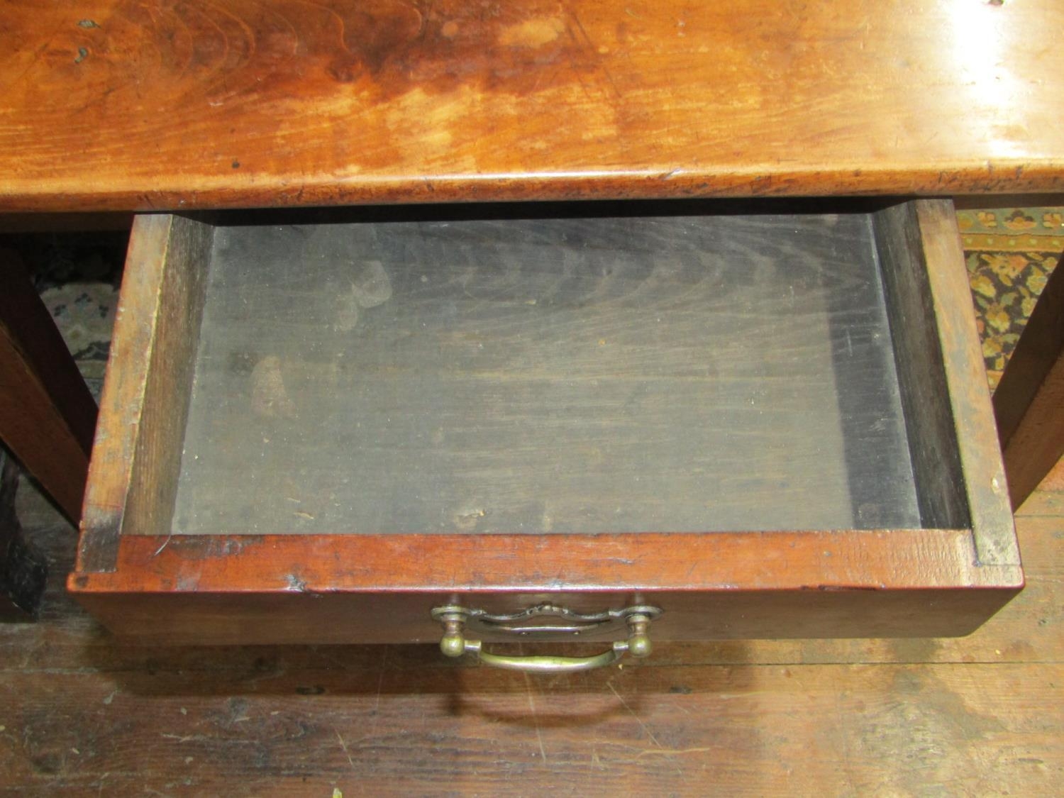 Top has a few small splits, old woodworm to the top and underside, woodworm to underside of frieze, general cosmetic wear, height 77cm