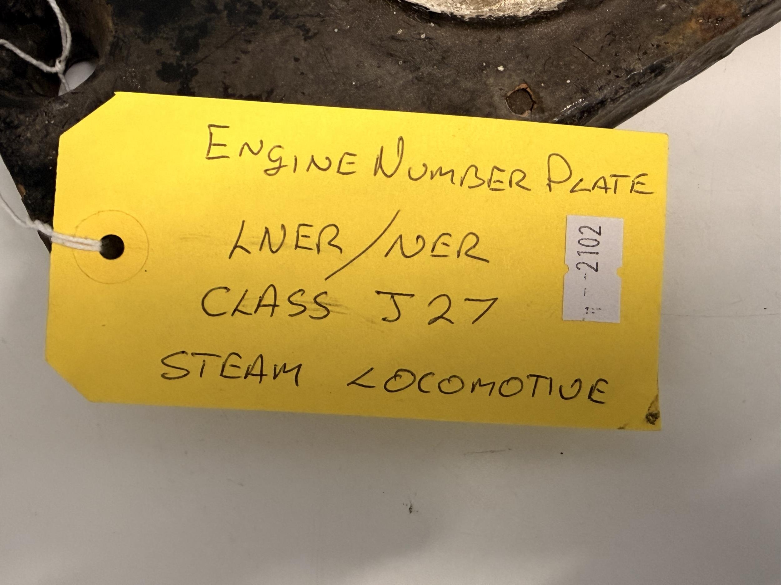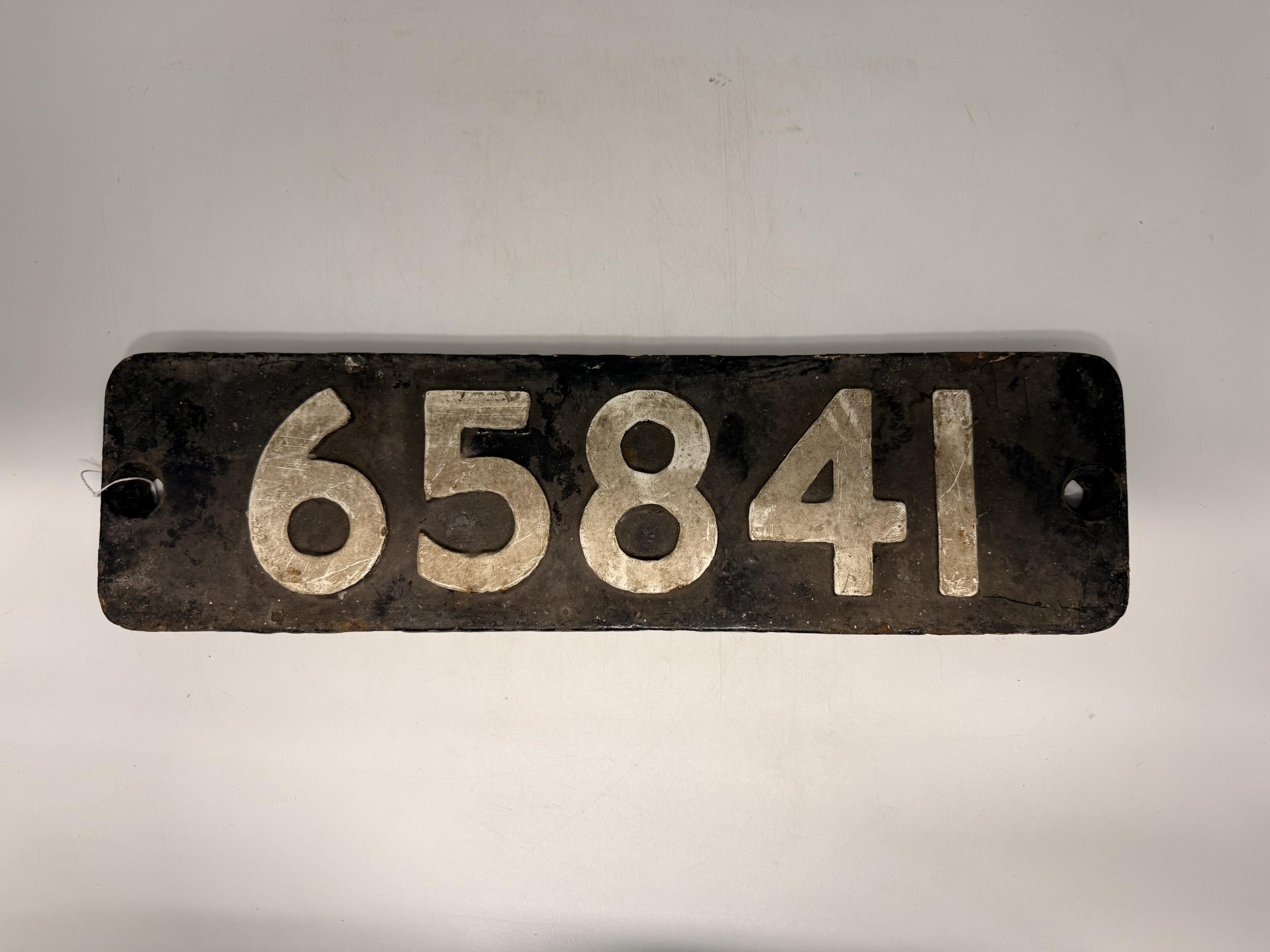 An O-6-O J27 Class (NER) steam locomotive engine number plate, 65841, recorded working at West Hartlepool (WHL) depot in 1940s. Approx. 15cm by 55cm
