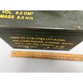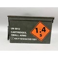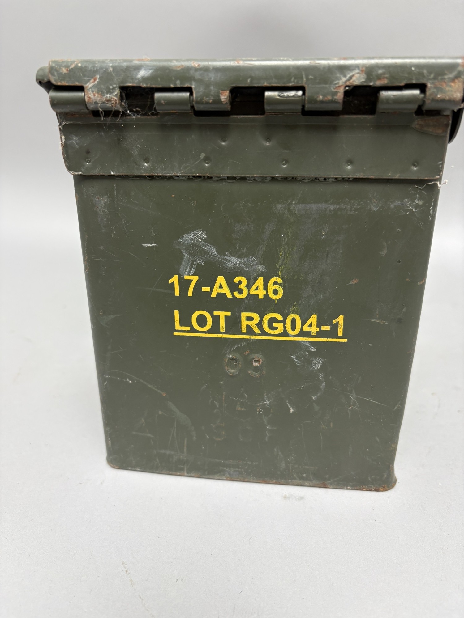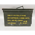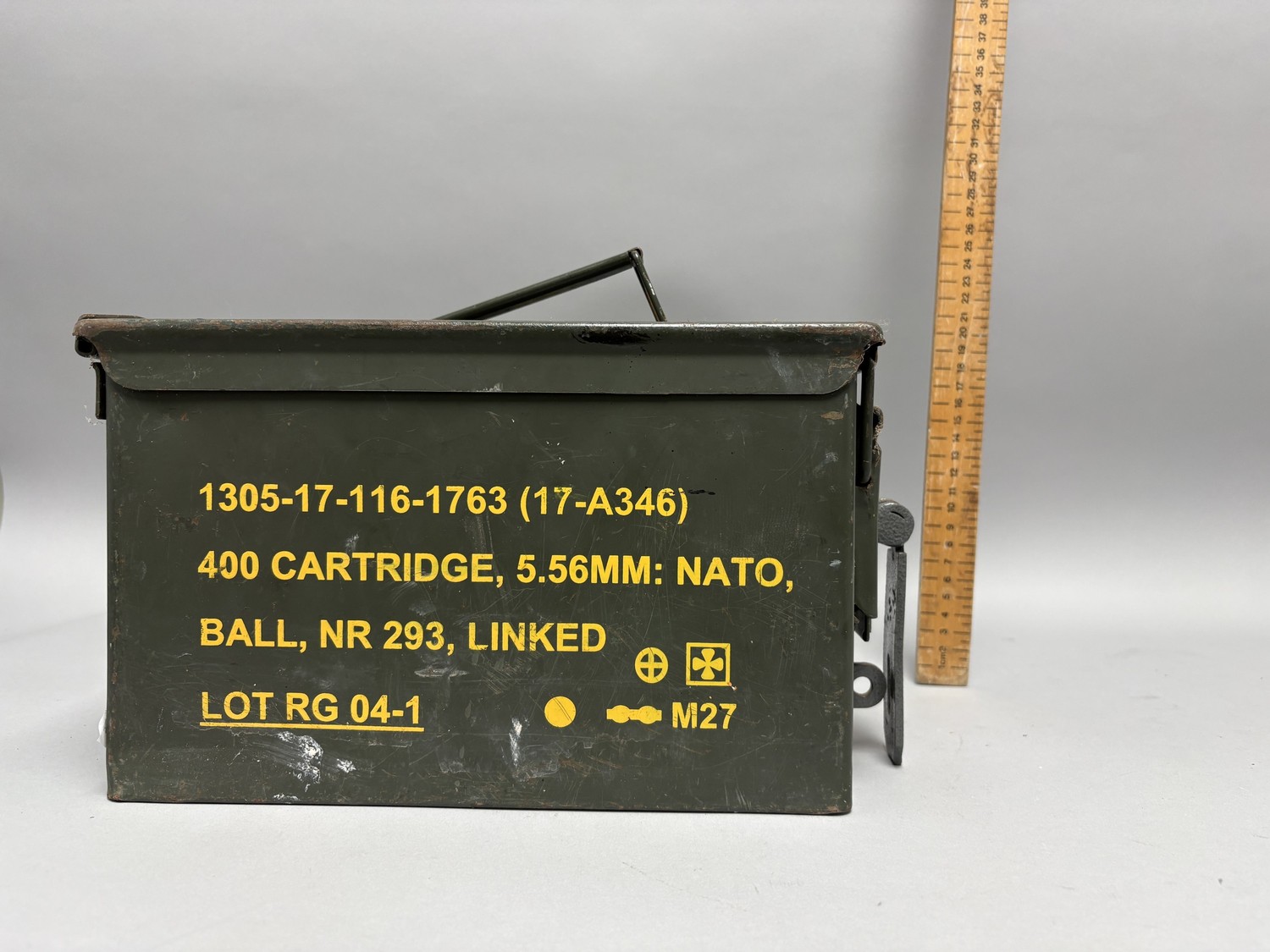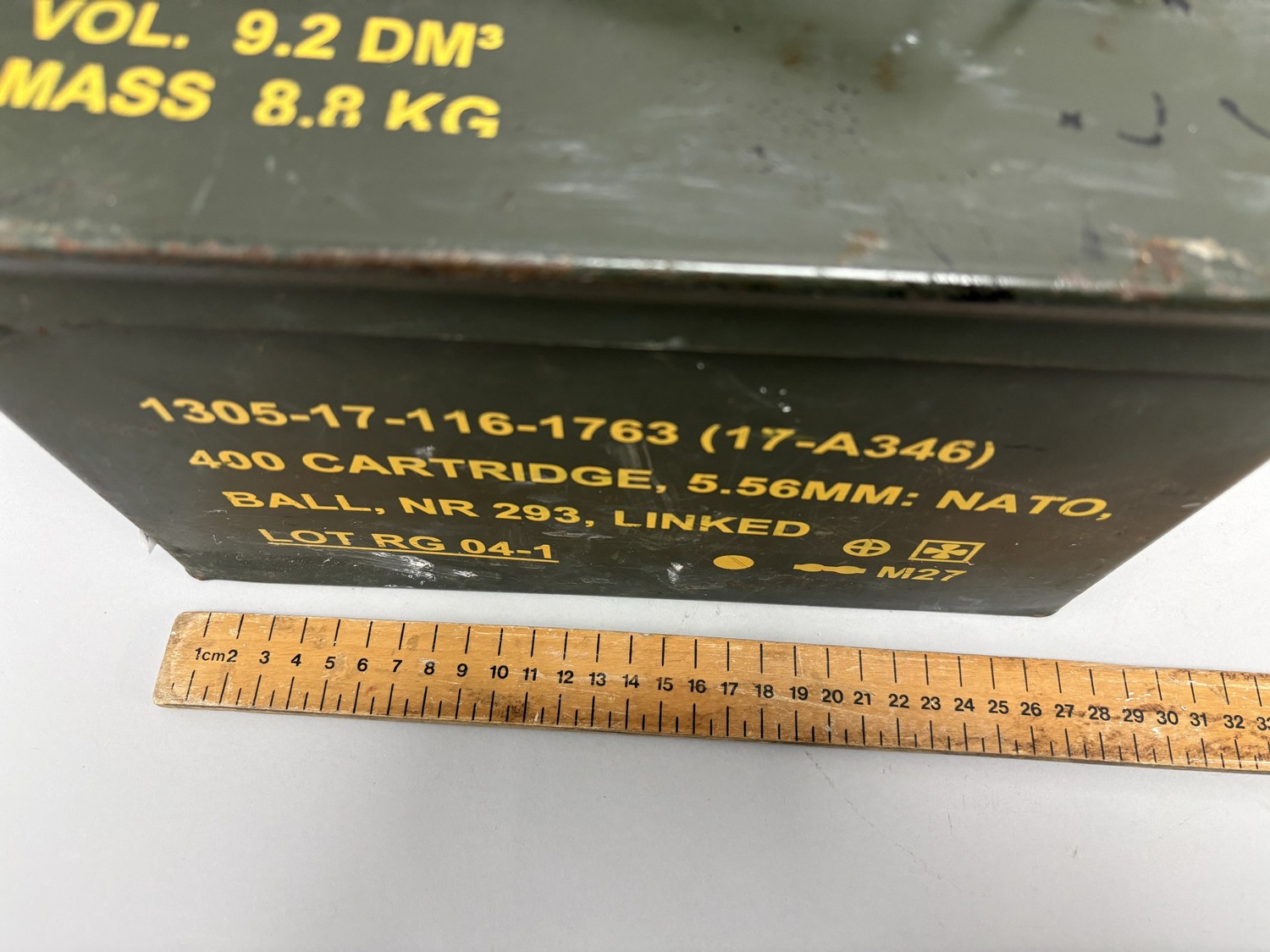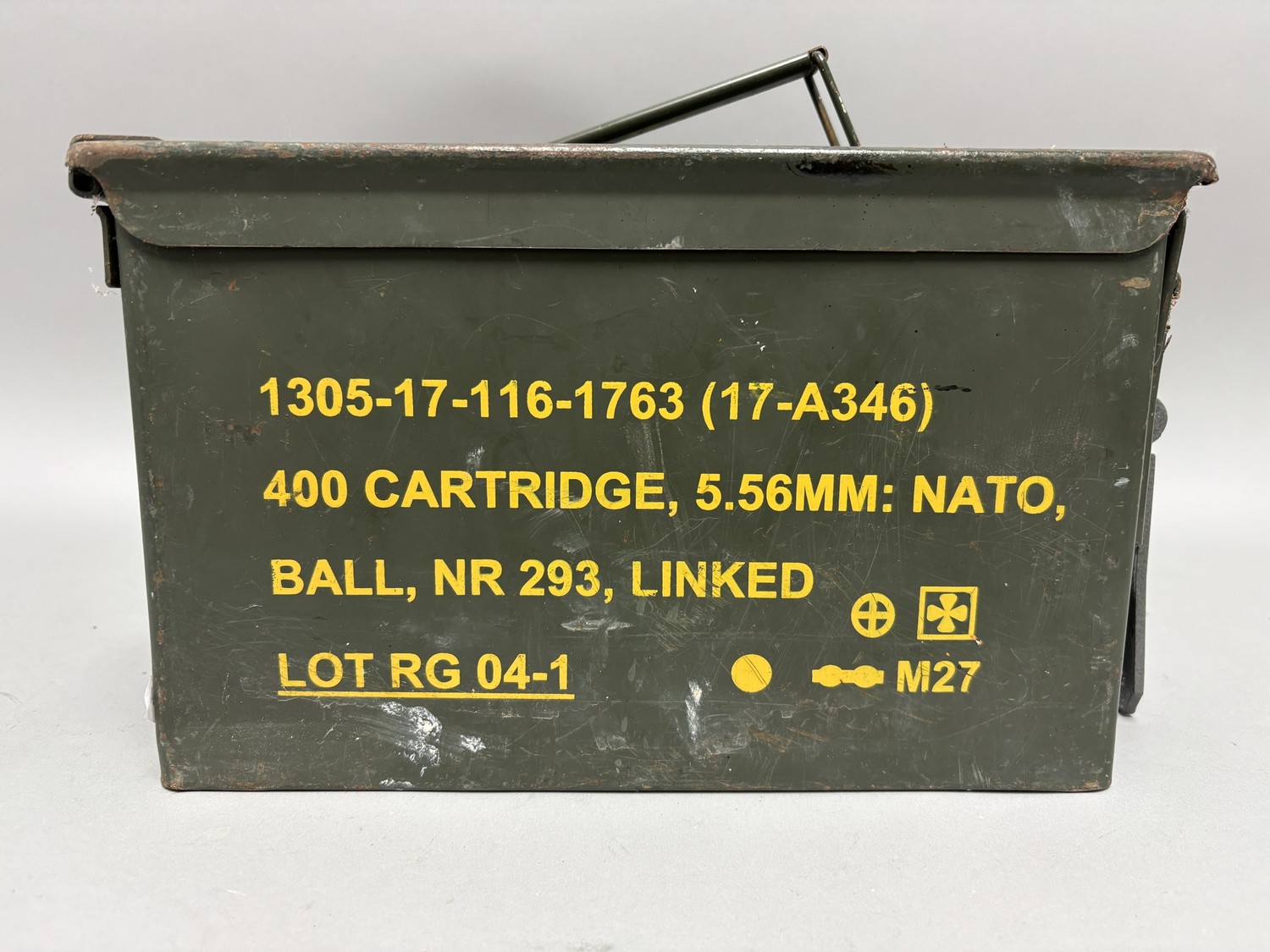 A US Military Surplus .50 Caliber Ammo Can. Constructed from olive drab green painted metal, this rectangular ammunition can features a hinged lid with a rubber gasket seal, a collapsible metal carry handle, and a robust latch closure mechanism. The container is extensively marked with yellow stenciled text, including "1305-17-116-1763 (17-A346)", "400 CARTRIDGE, 5.56MM: NATO, BALL, NR 293, LINKED", "LOT RG 04-1", "M27", "VOL. 9.2 DM³", and "MASS 8.8 KG", alongside other numerical identifiers and two graphic symbols. One side also displays an orange diamond-shaped hazard label with "UN 0012 CARTRIDGES, SMALL ARMS", "1.4 S", and a UN packaging code "4A/Y19/S/04/GB/1681". The style suggests a utilitarian military surplus item, likely from the mid-to-late 20th century or early 21st century.
