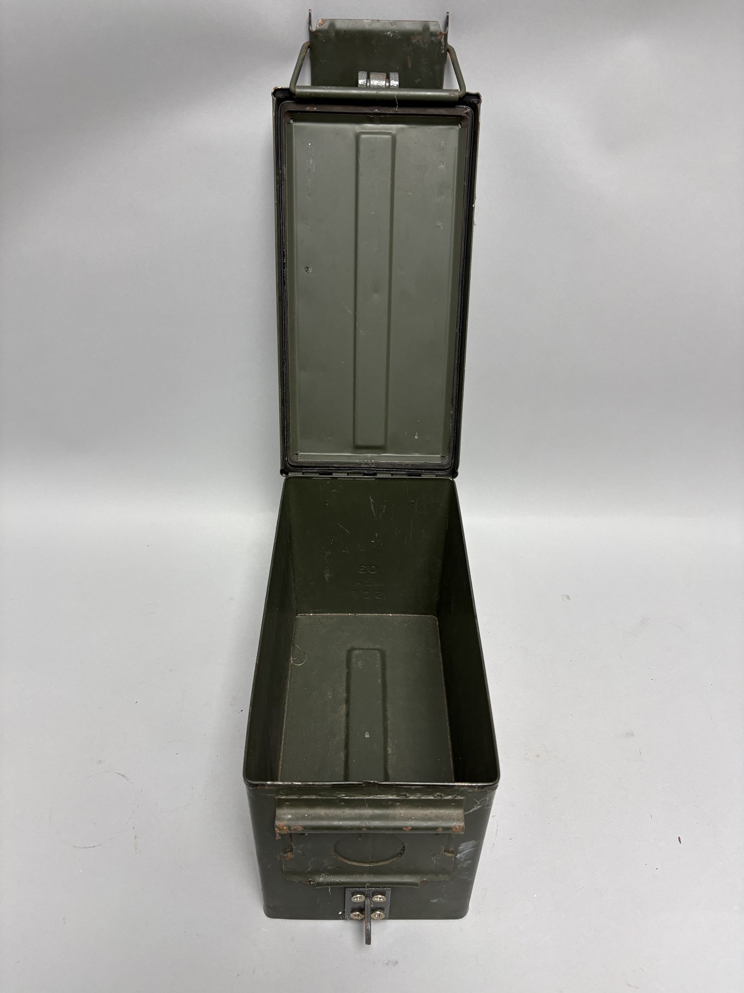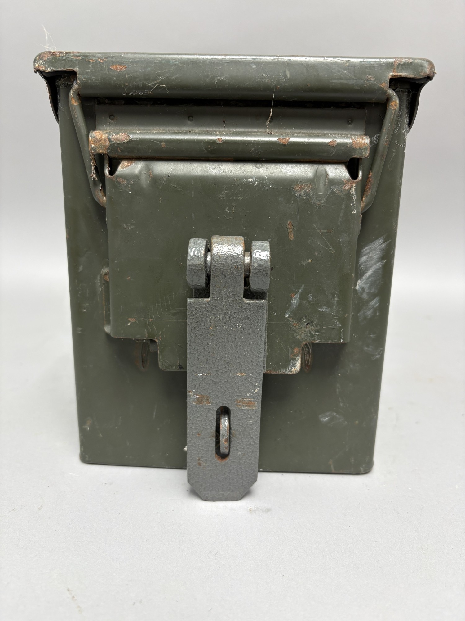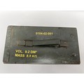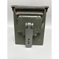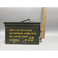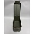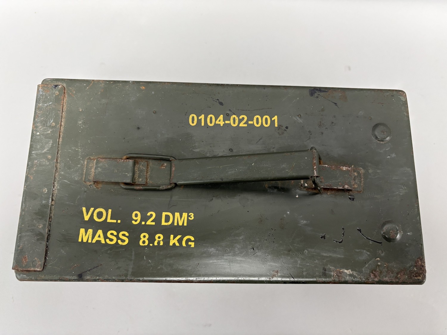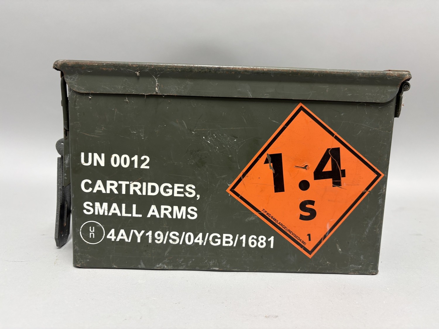 A US Military Surplus .50 Caliber Ammo Can. Constructed from olive drab green painted metal, this rectangular ammunition can features a hinged lid with a rubber gasket seal, a collapsible metal carry handle, and a robust latch closure mechanism. The container is extensively marked with yellow stenciled text, including "1305-17-116-1763 (17-A346)", "400 CARTRIDGE, 5.56MM: NATO, BALL, NR 293, LINKED", "LOT RG 04-1", "M27", "VOL. 9.2 DM³", and "MASS 8.8 KG", alongside other numerical identifiers and two graphic symbols. One side also displays an orange diamond-shaped hazard label with "UN 0012 CARTRIDGES, SMALL ARMS", "1.4 S", and a UN packaging code "4A/Y19/S/04/GB/1681". The style suggests a utilitarian military surplus item, likely from the mid-to-late 20th century or early 21st century.