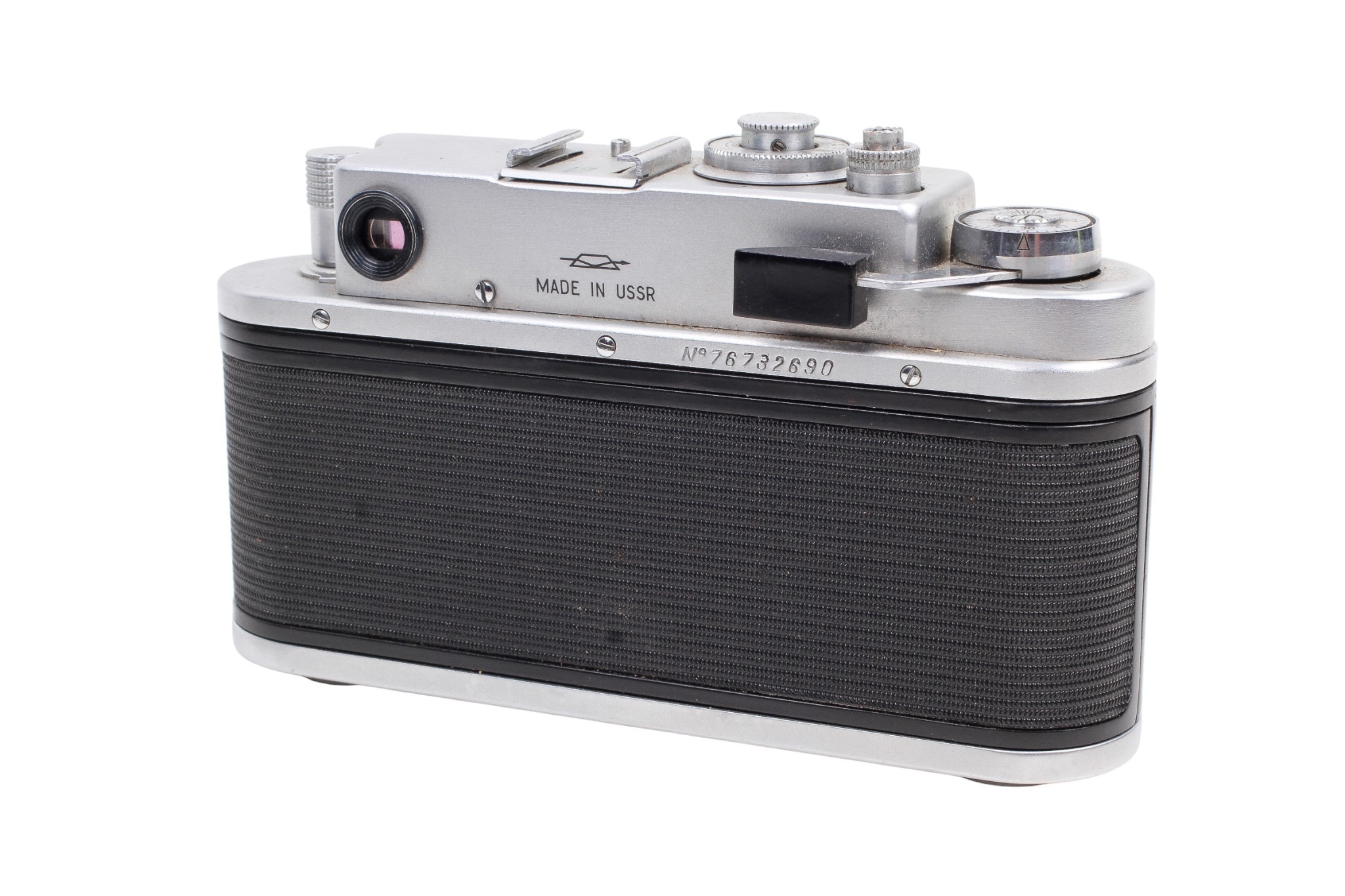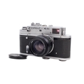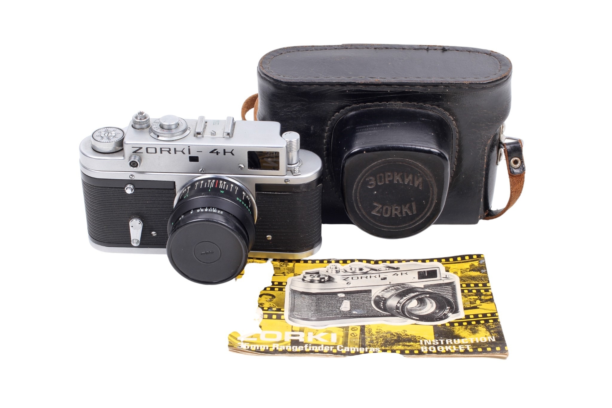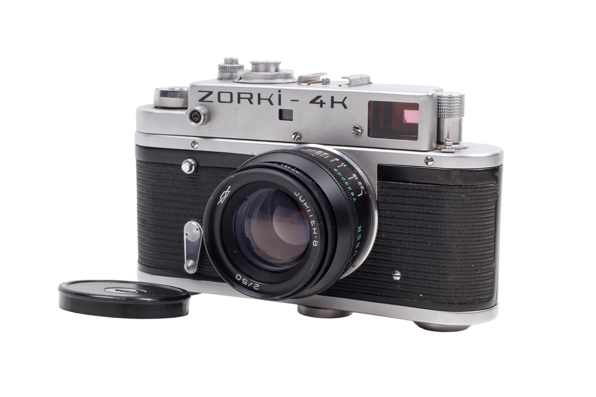 A Zorki 4K 35mm rangefinder camera. Serial number 76732690. With a Jupiter-8 50mm f2 lens, optics G/VG, functions well. Together with ERC and instruction booklet. Shutter works but sticking. Rangefinder system working well.